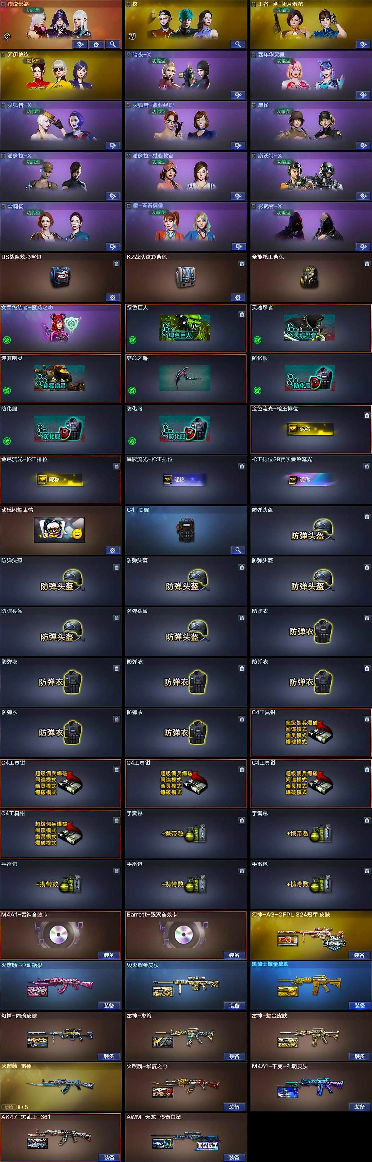【道具】:BS战队炫彩背包,KZ战队炫彩背包,全能枪王背包,女皇终结者-魔龙之吻,绿色巨人,灵魂忍者,迷雾幽灵,夺命之镰,防化服*3,金色流光-枪王排位*2,星辰流光-枪王排位,枪王排位29赛季金色流光,动感闪耀表情,C4-黑曜,防弹头盔*6,防弹衣*6,C4工具钳*5,手雷包*5