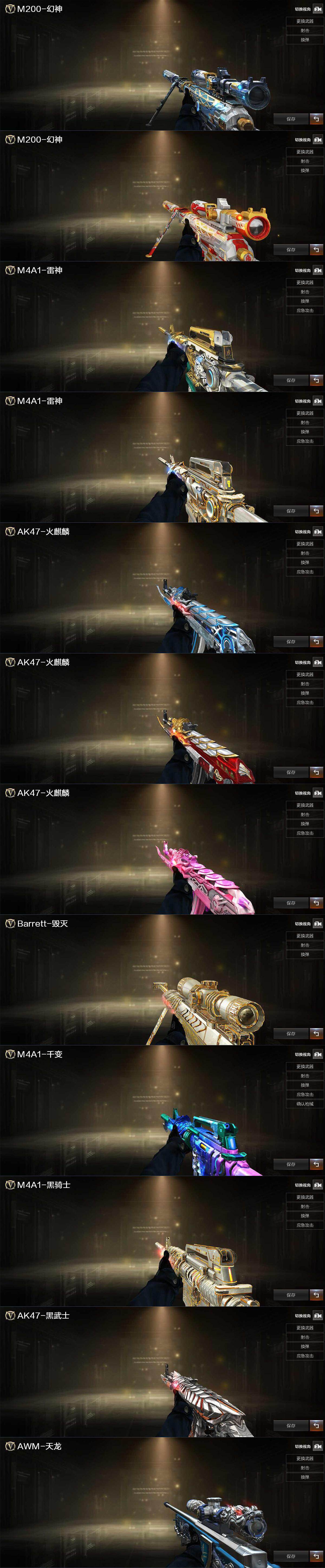 【热门武器】:Scar Light-白虎,M200-幻神,荣耀世冠-火麒麟,Cat-刀锋,M4A1-黑骑士,加特林-炼狱,沙鹰-修罗,金刚伞