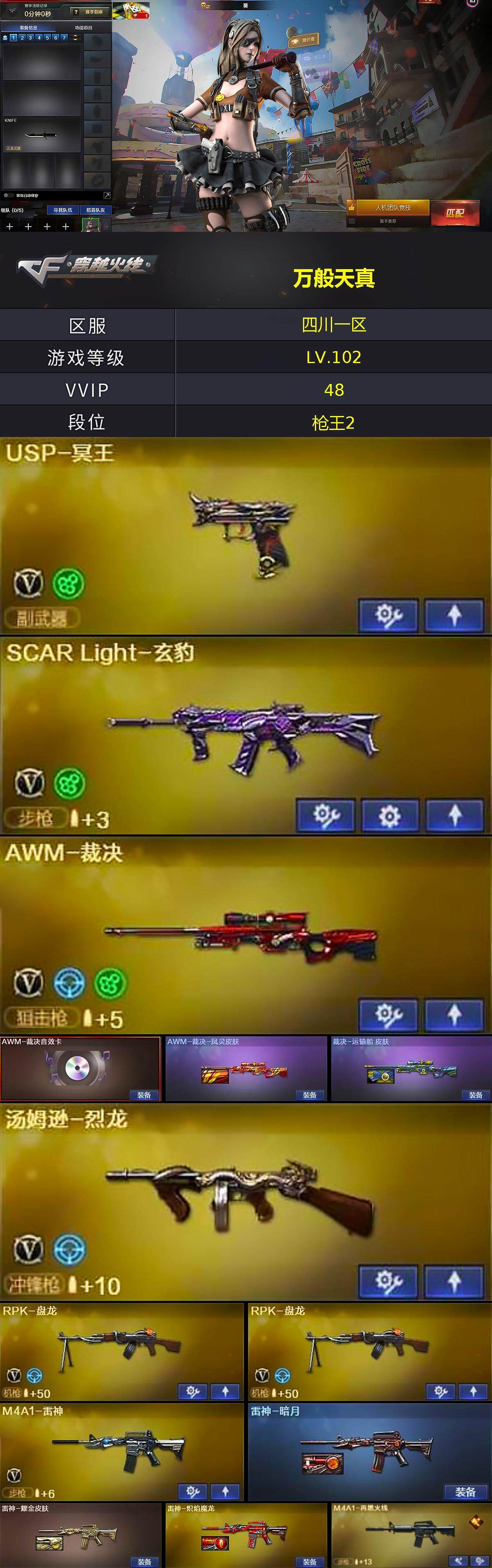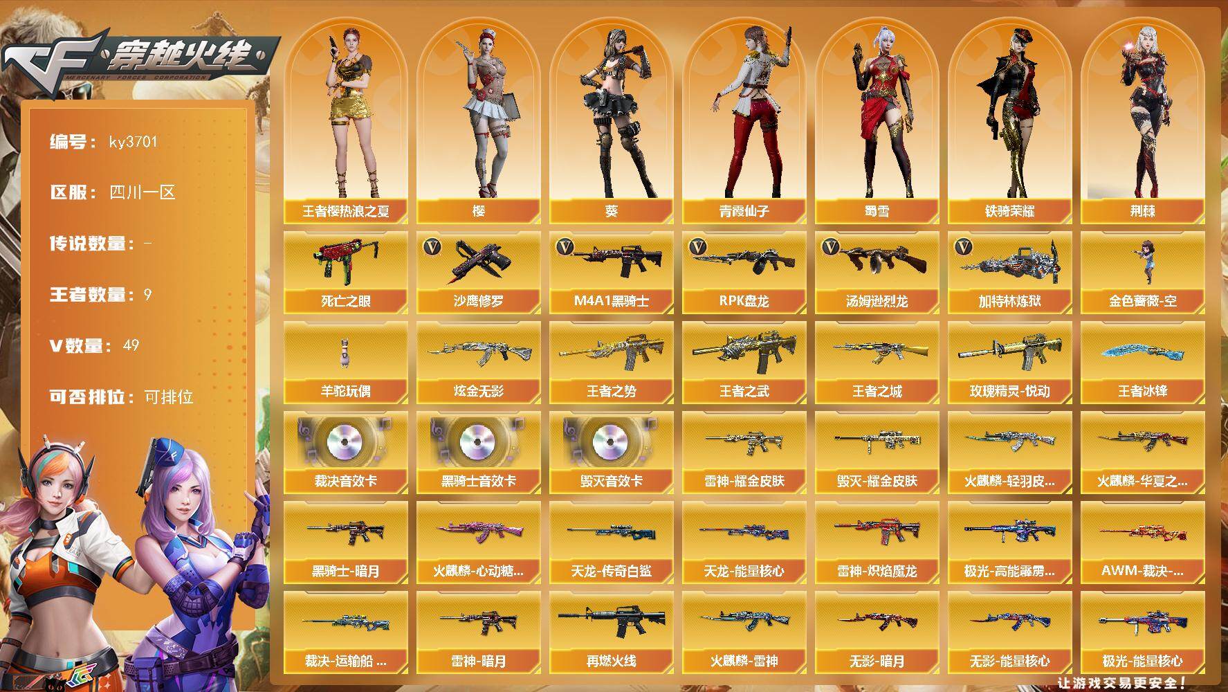 [13984125]四川一区-49V-9王者-1炫金 【热门武器】:死亡之眼,M4A1-黑骑士,汤姆逊-烈龙,RPK-盘龙*2,加特林-炼狱,金色蔷薇-空,羊驼玩偶,沙鹰-修罗*2 【王者炫金武器】:王者之城,王者之势,王者之武,玫瑰精灵-悦动,王者冰锋,炫金无影 【音效卡】:M4A1-黑骑士音效卡,Barrett-毁灭音效卡,AWM-裁决音效卡 【皮肤】:AWM-裁决-凤灵皮肤,裁决-运输船 皮肤,雷神-暗月,雷神-耀金皮肤,雷神-炽焰魔龙,M4A1-再燃火线,火麒麟-雷神,火麒麟-华夏之心,火麒麟-轻羽皮肤,火麒麟-心动糖果,毁灭耀金皮肤,黑骑士-暗月*2,无影-暗月,无影-能量核心*3,天龙-能量核心,AWM-天龙-传奇白鲨,极光-能量核心,极光-高能霹雳 皮肤,修罗-能量核心*3,轻型军用手斧-再燃火线 【角色】:葵,樱,玄豹,荆棘,王者樱-热浪之夏,奇洋探员,乔伊教练,云海玲珑,空,暗夜-X,北极狐-X,虎妞,嘉年华灵狐,兰妹妹,潜龙队-X,青霞仙子,斯沃特-X,蜀雪,铁骑荣耀,兔囡囡,新娜塔莎,雪莉杨,影武者-X 【人偶武器】:M4A1-雷神-精英刀锋,金色蔷薇-空,AWM-灵狐-15周年嘉年华,迷你波特博士*3,迷你火种*2,生化手雷-机甲核心 【暴走生化】:死亡之眼 【英雄级武器】:AK47-火麒麟*2,M4A1-雷神,M4A1-黑骑士,AK47-无影*2,AK12-天启,AK47-黑鲨,无影-神兵利器,SCAR Light-玄豹,M4A1-猎神,黑武士-CF网剧冠军,AWM-天龙,Barrett-毁灭,Barrett-极光,AWM-裁决,王者凰鸣-觉醒版,RPK-盘龙*2,加特林-炼狱,汤姆逊-烈龙,AA-12-雷霆,沙鹰-修罗*2,沙鹰-天神*2,USP-冥王,天神-CF网剧冠军,屠龙*3,龙啸,擎天*2,麒麟刺*2,擎天-CF网剧冠军,麒麟刺-百战金芒,王者之锋-觉醒版,王者之刺-觉醒版,手雷-动感闪耀,高爆手雷-玄豹,闪光弹-玄豹*2,烟雾弹-玄豹,M4A1-赤狱骑士 【道具】:BS战队炫彩背包,CFS限定背包,云山科技背包,冰冰企鹅背包-猛男专用,战舰背包,炫彩背包,虎牙炫彩背包,超级背包,女皇终结者-魔龙之吻,救世主-黑桃战神,绿色巨人,灵魂忍者,迷雾幽灵,夺命之镰,防化服*3,金色流光-枪王排位*2,星辰流光-枪王排位,枪王排位28赛季金色流光,枪王排位
