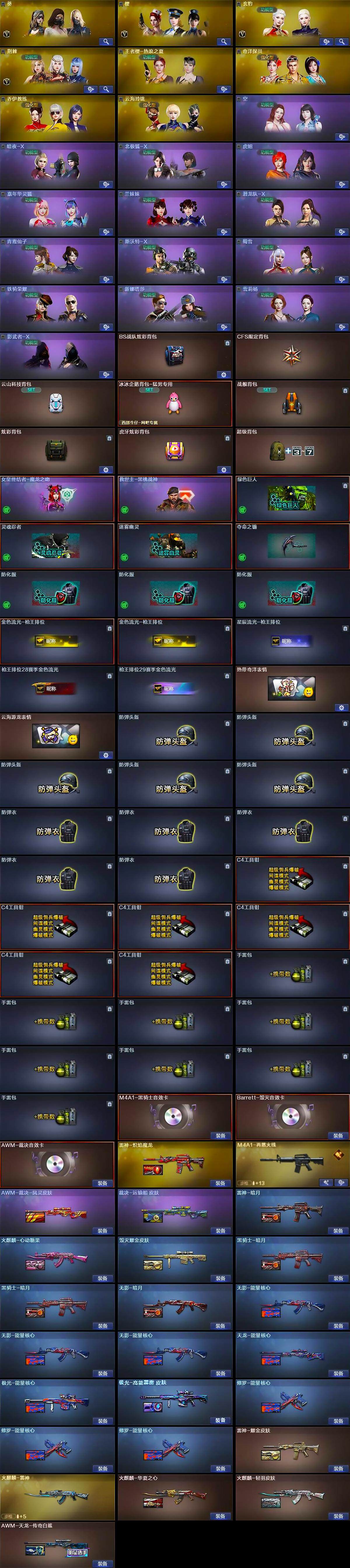 【道具】:BS战队炫彩背包,CFS限定背包,云山科技背包,冰冰企鹅背包-猛男专用,战舰背包,炫彩背包,虎牙炫彩背包,超级背包,女皇终结者-魔龙之吻,救世主-黑桃战神,绿色巨人,灵魂忍者,迷雾幽灵,夺命之镰,防化服*3,金色流光-枪王排位*2,星辰流光-枪王排位,枪王排位28赛季金色流光,枪王排位