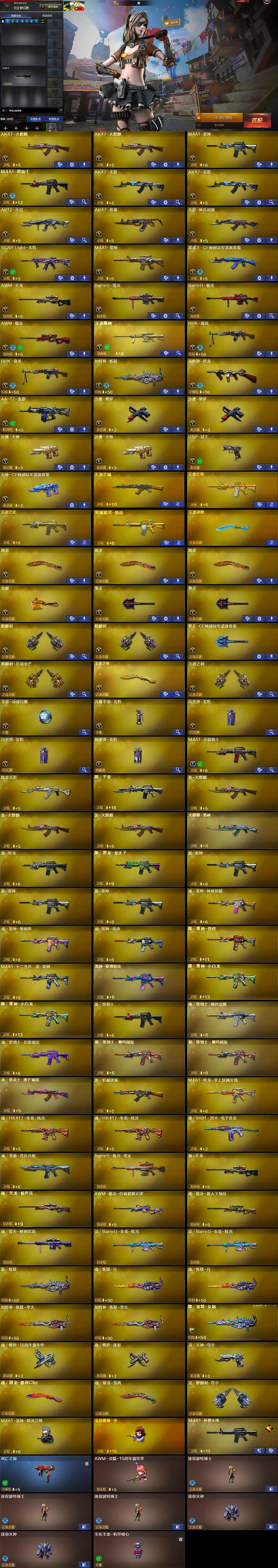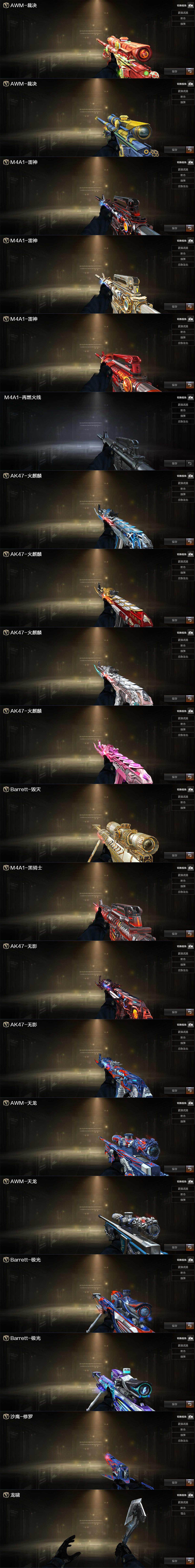 【英雄级武器】:AK47-火麒麟*2,M4A1-雷神,M4A1-黑骑士,AK47-无影*2,AK12-天启,AK47-黑鲨,无影-神兵利器,SCAR Light-玄豹,M4A1-猎神,黑武士-CF网剧冠军,AWM-天龙,Barrett-毁灭,Barrett-极光,AWM-裁决,王者凰鸣-觉醒版,RPK-盘龙*2,加特林-炼狱,汤姆逊-烈龙,AA-12-雷霆,沙鹰-修罗*2,沙鹰-天神*2,USP-冥王,天神-CF网剧冠军,屠龙*3,龙啸,擎天*2,麒麟刺*2,擎天-CF网剧冠军,麒麟刺-百战金芒,王者之锋-觉醒版,王者之刺-觉醒版,手雷-动感闪耀,高爆手雷-玄豹,闪光弹-玄豹*2,烟雾弹-玄豹,M4A1-赤狱骑士