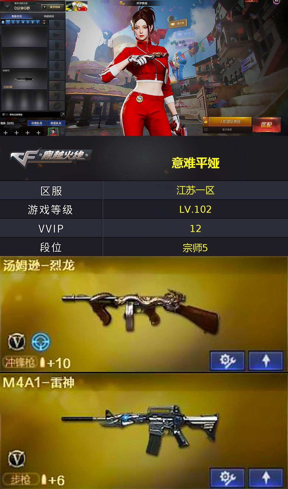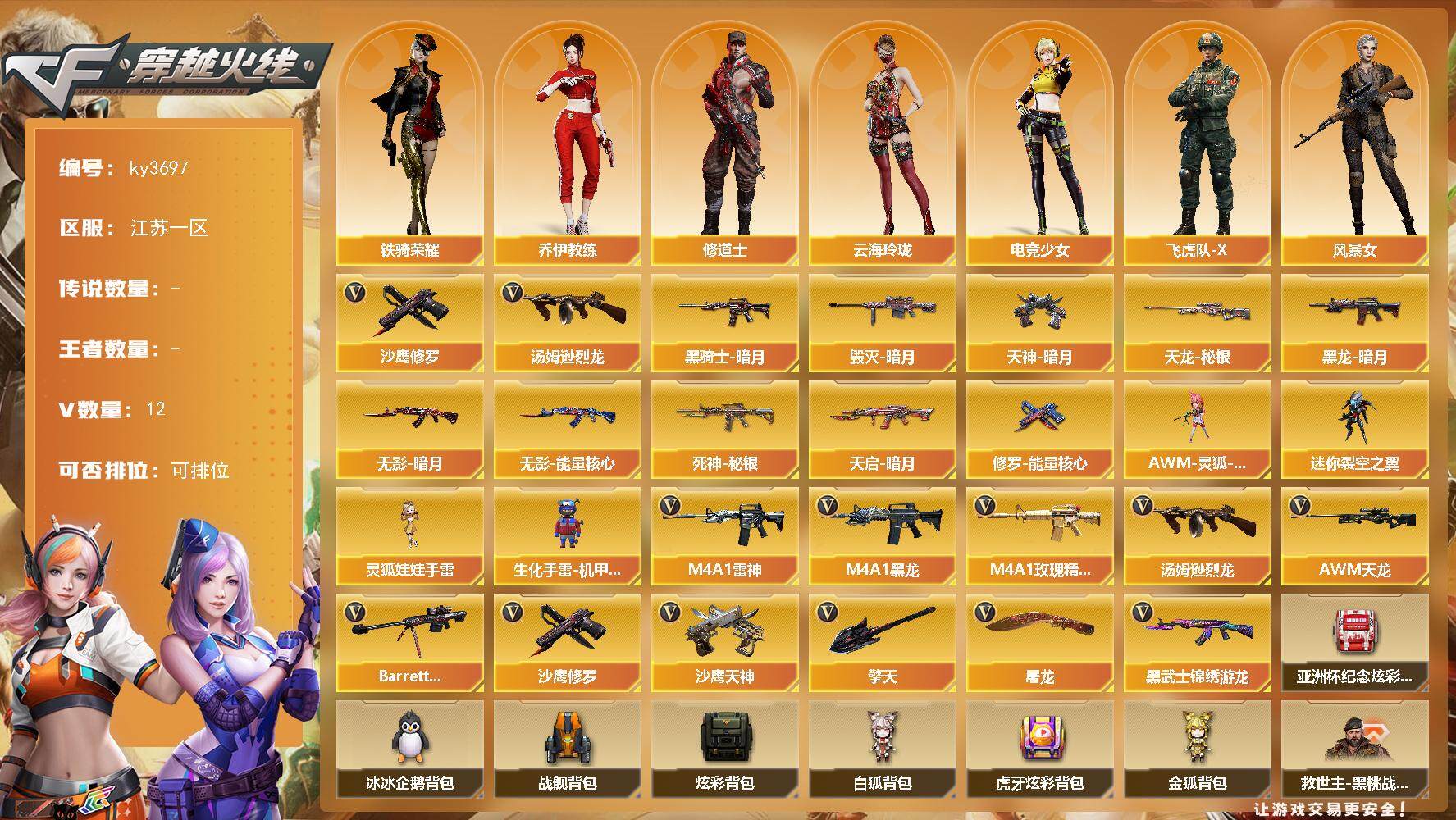 [13984595]江苏一区-12V-0王者-0炫金 【热门武器】:汤姆逊-烈龙,沙鹰-修罗 【皮肤】:毁灭-暗月,黑龙-暗月,黑骑士-暗月*2,无影-暗月*2,无影-能量核心,死神-秘银*3,天启-暗月*7,天龙-秘银*2,修罗-能量核心,天神-暗月*4 【角色】:乔伊教练,修道士,云海玲珑,电竞少女,飞虎队-X,风暴女,娟娟,曼陀罗-X,潘多拉-X,铁骑荣耀,兔囡囡,维纳斯,游珑儿,智影 【人偶武器】:AWM-灵狐-15周年嘉年华,迷你裂空之翼,生化手雷-机甲核心,灵狐娃娃手雷 【英雄级武器】:M4A1-黑龙,M4A1-雷神,黑武士-锦绣游龙,M4A1-玫瑰精灵,AWM-天龙,Barrett-毁灭,汤姆逊-烈龙,沙鹰-修罗,沙鹰-天神,屠龙,擎天 【道具】:亚洲杯纪念炫彩背包,冰冰企鹅背包,战舰背包,炫彩背包,白狐背包,虎牙炫彩背包,金狐背包,救世主-黑桃战神,绿色巨人,灵魂忍者*2,变异宝贝,迷雾幽灵*2,夺命之镰,防化服*2,金色流光-枪王排位,星辰流光-枪王排位,枪王排位28赛季金色流光,枪王排位29赛季金色流光,防弹头盔*5,防弹衣*6,C4工具钳*5,手雷包*4 【特殊枪械】:1烈龙