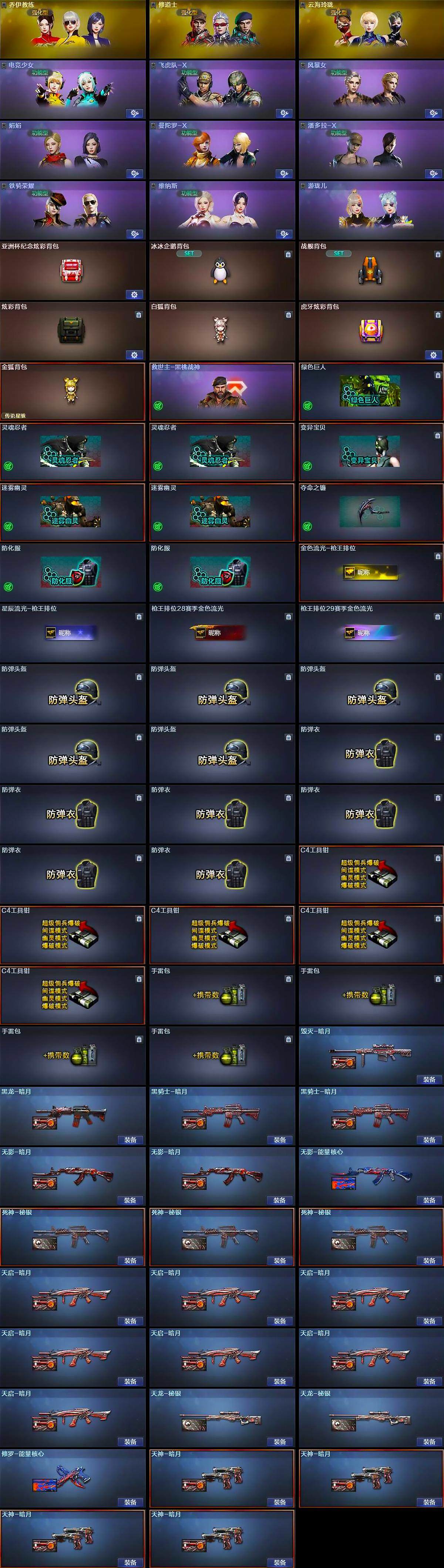 【道具】:亚洲杯纪念炫彩背包,冰冰企鹅背包,战舰背包,炫彩背包,白狐背包,虎牙炫彩背包,金狐背包,救世主-黑桃战神,绿色巨人,灵魂忍者*2,变异宝贝,迷雾幽灵*2,夺命之镰,防化服*2,金色流光-枪王排位,星辰流光-枪王排位,枪王排位28赛季金色流光,枪王排位29赛季金色流光,防弹头盔*5,防弹衣*6,C4工具钳*5,手雷包*4