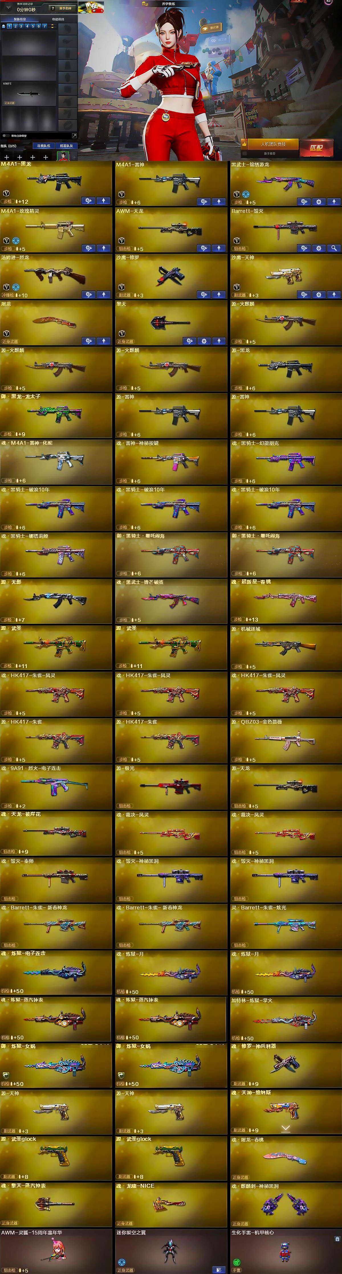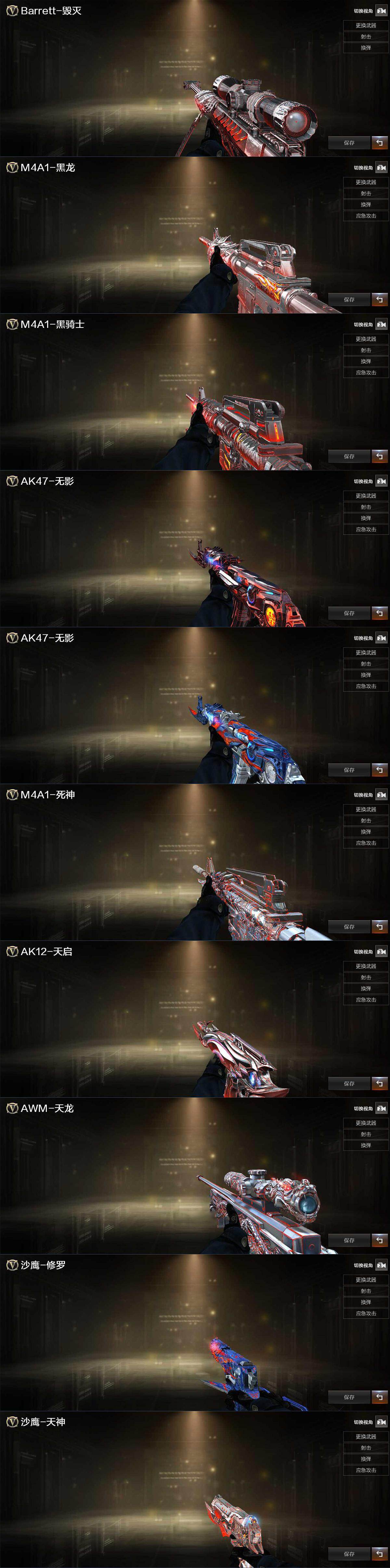 【英雄级武器】:M4A1-黑龙,M4A1-雷神,黑武士-锦绣游龙,M4A1-玫瑰精灵,AWM-天龙,Barrett-毁灭,汤姆逊-烈龙,沙鹰-修罗,沙鹰-天神,屠龙,擎天