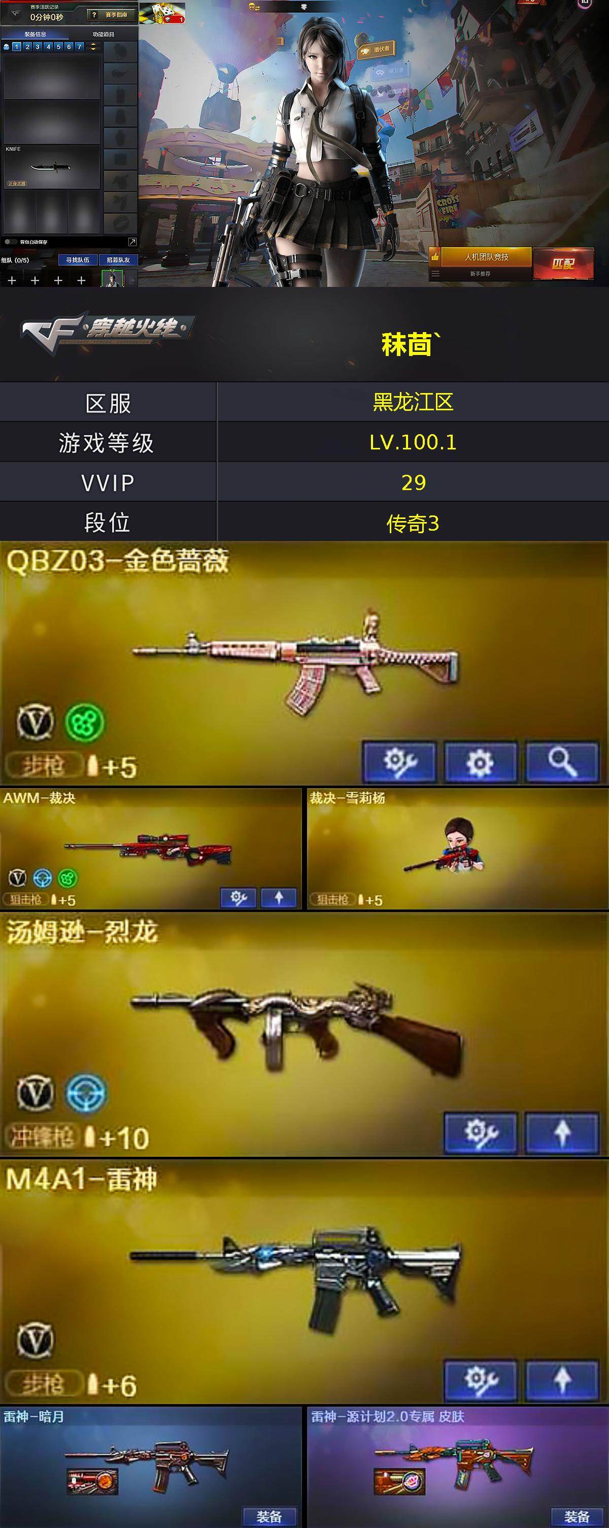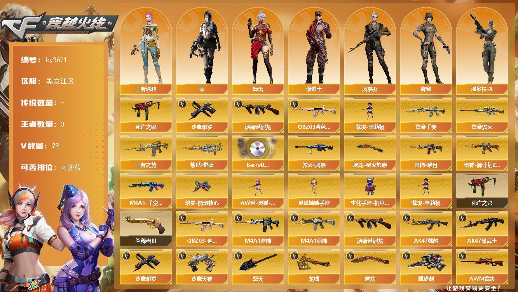 [13984672]黑龙江区-29V-3王者-3炫金 【热门武器】:QBZ03-金色蔷薇,死亡之眼*2,汤姆逊-烈龙,裁决-雪莉杨,沙鹰-修罗 【王者炫金武器】:王者之势,炼狱-悦蓝,炫金千变,炫金毁灭*2 【音效卡】:Barrett-碧霄极光音效卡 【皮肤】:雷神-暗月,雷神-源计划2.0专属 皮肤,毁灭-风暴,M4A1-千变-孔明皮肤,修罗-能量核心,屠龙-星火燎原 【角色】:零,王者涂鸦,修道士,风暴女*2,麻雀,潘多拉-X,蜀雪,新娜塔莎,雪莉杨-摸金校尉,影武者-X 【人偶武器】:裁决-雪莉杨,AWM-灵狐-15周年嘉年华,生化手雷-机甲核心,灵狐娃娃手雷*2 【暴走生化】:死亡之眼*2 【挑战大师】:阐释者III 【英雄级武器】:AK47-麒麟,M4A1-雷神,M4A1-死神,AK47-黑武士,AK47-机械迷城,黑武士-锦绣游龙,QBZ03-金色蔷薇,AWM-裁决,汤姆逊-烈龙,沙鹰-修罗,沙鹰-天神*2,屠龙*2,龙啸,麒麟刺-堕天神,擎天,麒麟刺,擎天-竞技荣光,高爆手雷-堕天神,高爆手雷-竞技荣光,闪光弹-堕天神,闪光弹-竞技荣光,烟雾弹-堕天神,烟雾弹-竞技荣光*2,Barrett-碧霄极光 【道具】:CFS限定背包,云山科技背包,炫彩背包,老虎背包,超级背包,女皇终结者-魔龙之吻,救世主-黑桃战神,绿色巨人,灵魂忍者,变异宝贝,迷雾幽灵,生化弹匣,夺命之镰,防化服*2,金色流光-枪王排位,巅峰赛先锋-金色流光,流光-鎏金之域,枪王排位28赛季金色流光,枪王排位29赛季金色流光,EP战队名片,EP战队喷图,EP战队击杀图标,防弹头盔*4,防弹衣*4,C4工具钳*4,手雷包*4 【特殊枪械】:1烈龙