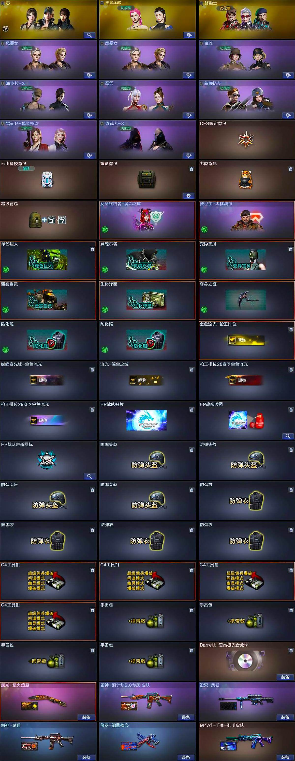 【道具】:CFS限定背包,云山科技背包,炫彩背包,老虎背包,超级背包,女皇终结者-魔龙之吻,救世主-黑桃战神,绿色巨人,灵魂忍者,变异宝贝,迷雾幽灵,生化弹匣,夺命之镰,防化服*2,金色流光-枪王排位,巅峰赛先锋-金色流光,流光-鎏金之域,枪王排位28赛季金色流光,枪王排位29赛季金色流光,EP战队名片,EP战队喷图,EP战队击杀图标,防弹头盔*4,防弹衣*4,C4工具钳*4,手雷包*4