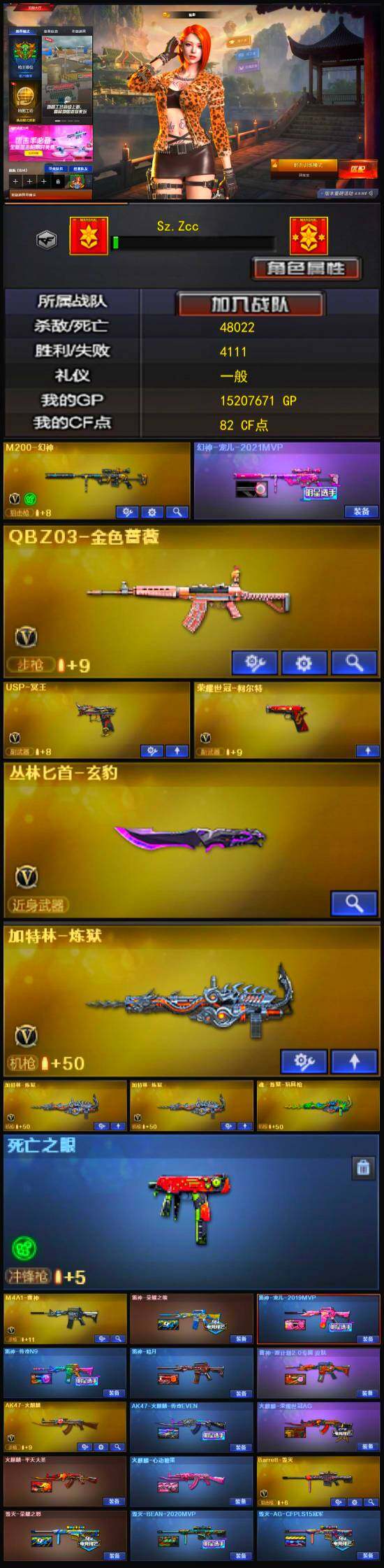 【热门武器】:QBZ03-金色蔷薇,M200-幻神,死亡之眼,荣耀世冠-火麒麟,荣耀世冠-雷神,荣耀世冠-柯尔特,牛牛-AK47,加特林-炼狱*3,羊驼玩偶*2,毁灭-孙三炮,沙鹰-修罗,荣耀世冠-龙啸