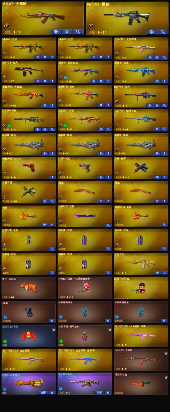 【英雄级武器】:M4A1-武圣*2,荣耀世冠-火麒麟,荣耀世冠-雷神,荣耀世冠-柯尔特,荣耀世冠-龙啸,QBZ03-金色蔷薇,M4A1-雷神,加特林-炼狱*3,AK47-火麒麟,Barrett-毁灭,Barrett-朱雀,M200-幻神,黑武士-锦绣游龙,黑骑士-海王,AWM-昌龙,M4A1-赤狱骑士,USP-冥王,沙鹰-修罗,龙啸,屠龙*2