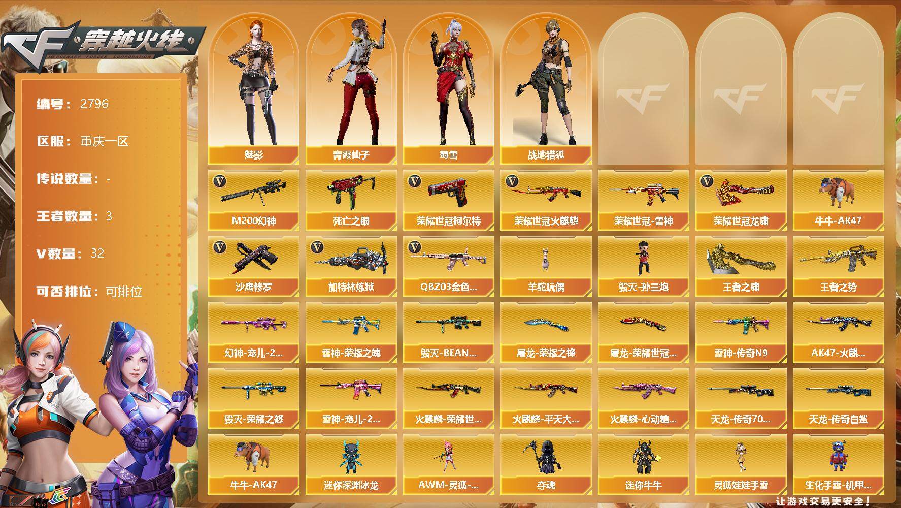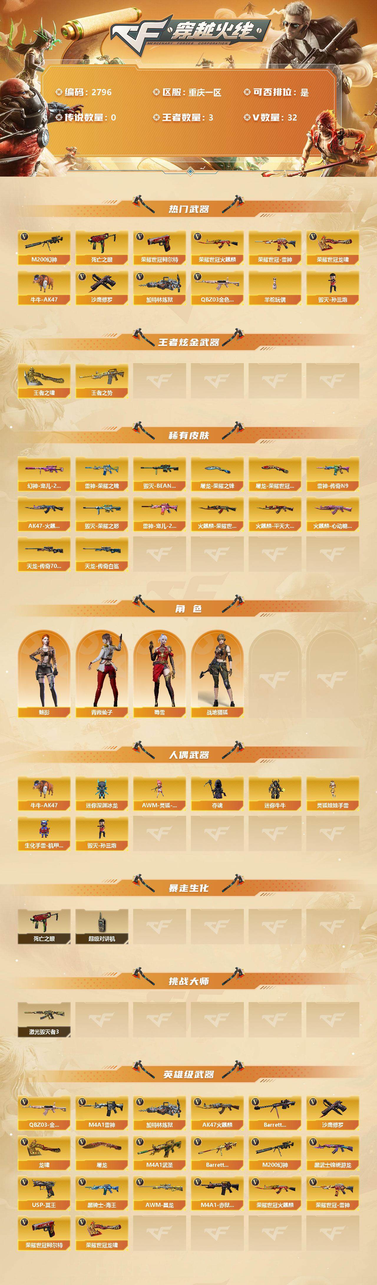 [13984892]重庆一区-32V-3王者-0炫金 【热门武器】:QBZ03-金色蔷薇,M200-幻神,死亡之眼,荣耀世冠-火麒麟,荣耀世冠-雷神,荣耀世冠-柯尔特,牛牛-AK47,加特林-炼狱*3,羊驼玩偶*2,毁灭-孙三炮,沙鹰-修罗,荣耀世冠-龙啸 【王者炫金武器】:王者之势,王者之啸 【稀有皮肤】:幻神-宠儿-2021MVP,雷神-荣耀之魄,雷神-传奇N9,雷神-宠儿-2019MVP,AK47-火麒麟-传奇EVEN,火麒麟-平天大圣,火麒麟-荣耀世冠AG,火麒麟-心动糖果,毁灭-荣耀之怒,毁灭-BEAN-2020MVP,AWM-天龙-传奇70KG,AWM-天龙-传奇白鲨,屠龙-荣耀之锋,屠龙-荣耀世冠AG 【角色】:魅影,战地猎狐,蜀雪,青霞仙子 【人偶武器】:毁灭-孙三炮,AWM-灵狐-15周年嘉年华,牛牛-AK47,迷你深渊冰龙*2,夺魂,迷你牛牛,灵狐娃娃手雷,生化手雷-机甲核心 【暴走生化】:死亡之眼,超级对讲机 【挑战大师】:激光毁灭者III 【英雄级武器】:M4A1-武圣*2,荣耀世冠-火麒麟,荣耀世冠-雷神,荣耀世冠-柯尔特,荣耀世冠-龙啸,QBZ03-金色蔷薇,M4A1-雷神,加特林-炼狱*3,AK47-火麒麟,Barrett-毁灭,Barrett-朱雀,M200-幻神,黑武士-锦绣游龙,黑骑士-海王,AWM-昌龙,M4A1-赤狱骑士,USP-冥王,沙鹰-修罗,龙啸,屠龙*2 【特殊枪械】:3炼狱