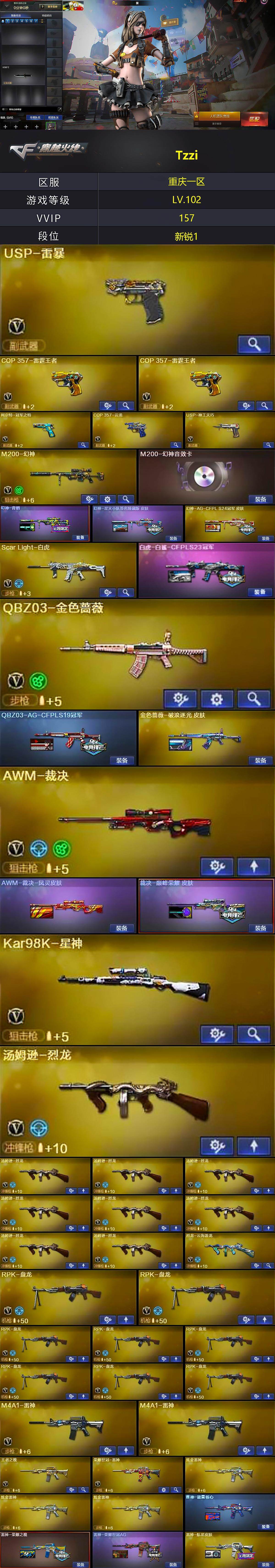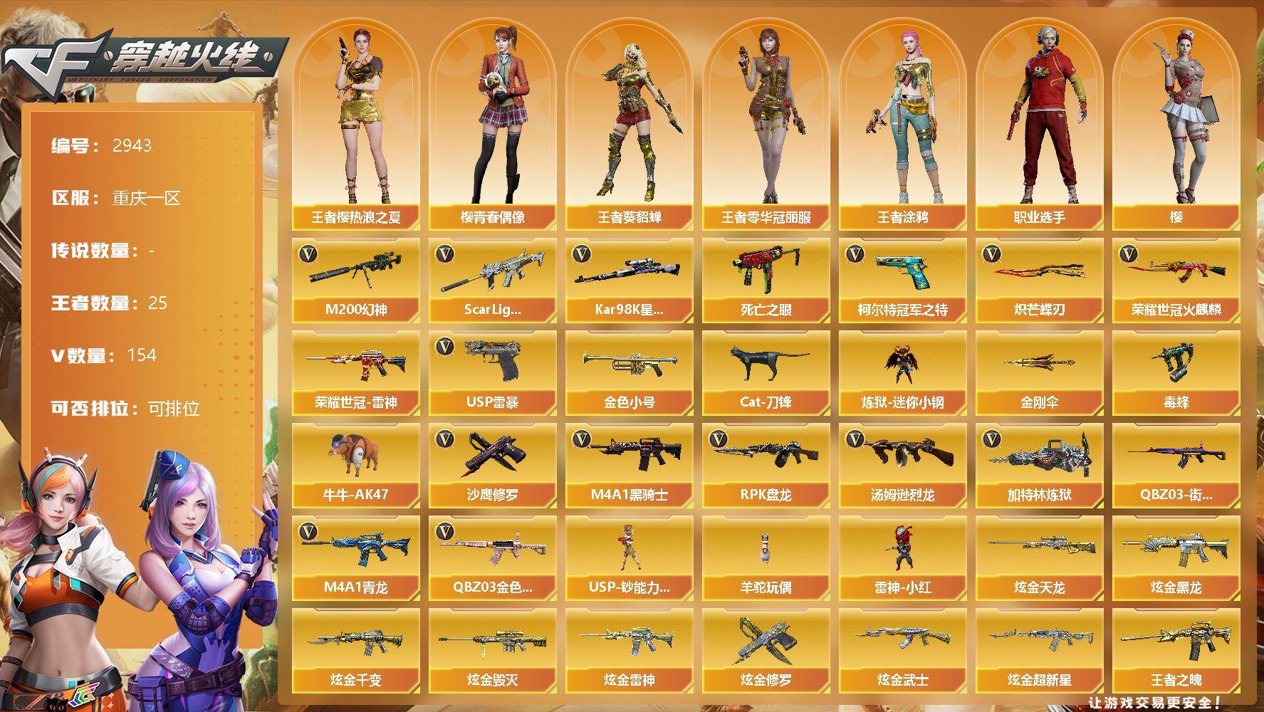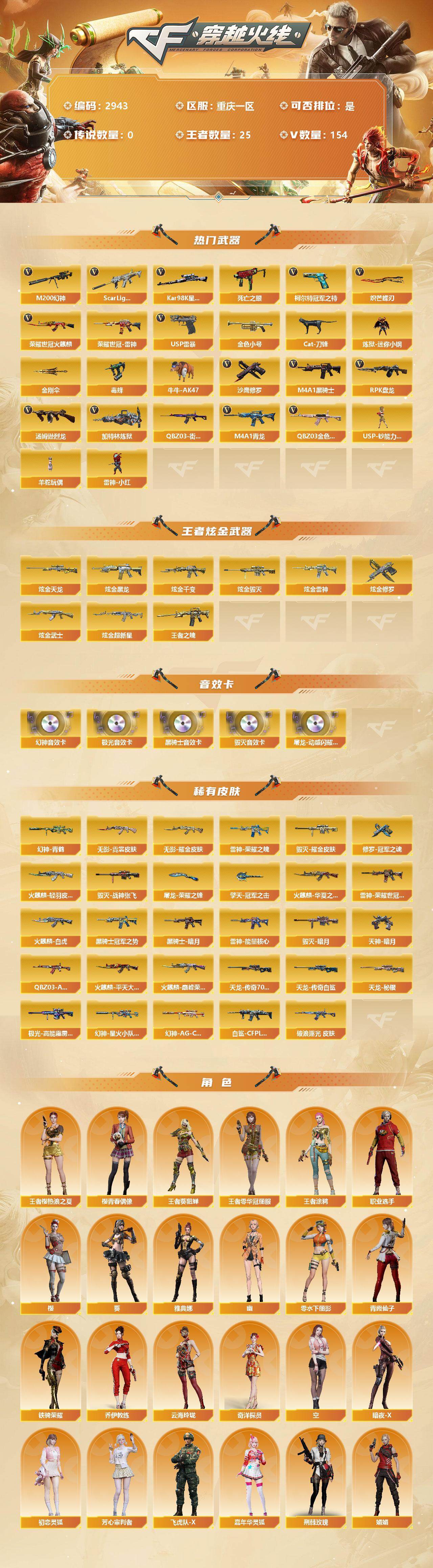 [13985260]重庆一区-154V-25王者-19炫金 【热门武器】:QBZ03-金色蔷薇,Scar Light-白虎,M4A1-青龙,M200-幻神,死亡之眼,荣耀世冠-火麒麟,荣耀世冠-雷神,QBZ03-街机,柯尔特-冠军之特,Kar98K-星神,金色小号,Cat-刀锋,炼狱-迷你小钢,毒蜂,牛牛-AK47,M4A1-黑骑士*3,汤姆逊-烈龙*9,RPK-盘龙*8,加特林-炼狱,USP-钞能力灵狐,羊驼玩偶,雷神-小红,USP-雷暴,沙鹰-修罗*5,炽芒蝶刃,金刚伞 【王者炫金武器】:王者之魄,炫金黑龙*4,炫金千变,炫金雷神*3,炫金武士,炫金超新星*4,炫金毁灭*2,炫金天龙*3,炫金修罗 【音效卡】:屠龙-动感闪耀 音效卡,M200-幻神音效卡,M4A1-黑骑士音效卡,Barrett-毁灭音效卡,Barrett-极光音效卡 【皮肤】:幻神-青鹤,幻神-星火小队签名臻藏版 皮肤,幻神-AG-CFPL S24冠军 皮肤,白虎-白鲨-CFPLS23冠军,QBZ03-AG-CFPLS19冠军,金色蔷薇-破浪逐光 皮肤,AWM-裁决-凤灵皮肤,裁决-巅峰荣耀 皮肤,雷神-能量核心,雷神-荣耀之魄,雷神-荣耀世冠AG,雷神-航星皮肤,火麒麟-雷神,火麒麟-华夏之心,火麒麟-轻羽皮肤,火麒麟-平天大圣*2,火麒麟-白虎,火麒麟-巅峰荣耀,毁灭-暗月*3,毁灭耀金皮肤,毁灭-战神张飞,M4A1-千变-孔明皮肤,黑龙-能量核心,黑骑士-暗月,黑骑士-冠军之势,黑骑士-破浪10年皮肤,无影耀金皮肤,无影-霓裳皮肤,死神-秘银,天启-暗月*2,战神-粉色甜心皮肤,战神-紫绶金章皮肤*8,战神-流金岁月皮肤*3,AK47-B-常胜将军-刘备*2,AK47-B-常胜将军-孙权,天龙-秘银,AWM-天龙-传奇70KG*2,AWM-天龙-传奇白鲨,极光-能量核心,极光-高能霹雳 皮肤,修罗-能量核心,修罗-冠军之魂,天神-暗月*5,屠龙-荣耀之锋*2,龙啸-巅峰荣耀 皮肤,擎天-冠军之击 【角色】:葵,樱,王者零-华冠丽服,王者樱-热浪之夏,王者-葵-貂蝉,王者涂鸦,奇洋探员,乔伊教练,云海玲珑,空,暗夜-X,初恋灵狐,芳心审判者,飞虎队-X,嘉年华灵狐,荆棘玫瑰,娟娟,零-水下丽影,灵狐者-X,灵狐者-黄金海岸,灵狐者-七夕宝贝,娜塔莉娅,潘多拉-X,青霞仙子,铁骑荣耀,维纳斯,夜玫瑰-宠粉,樱-