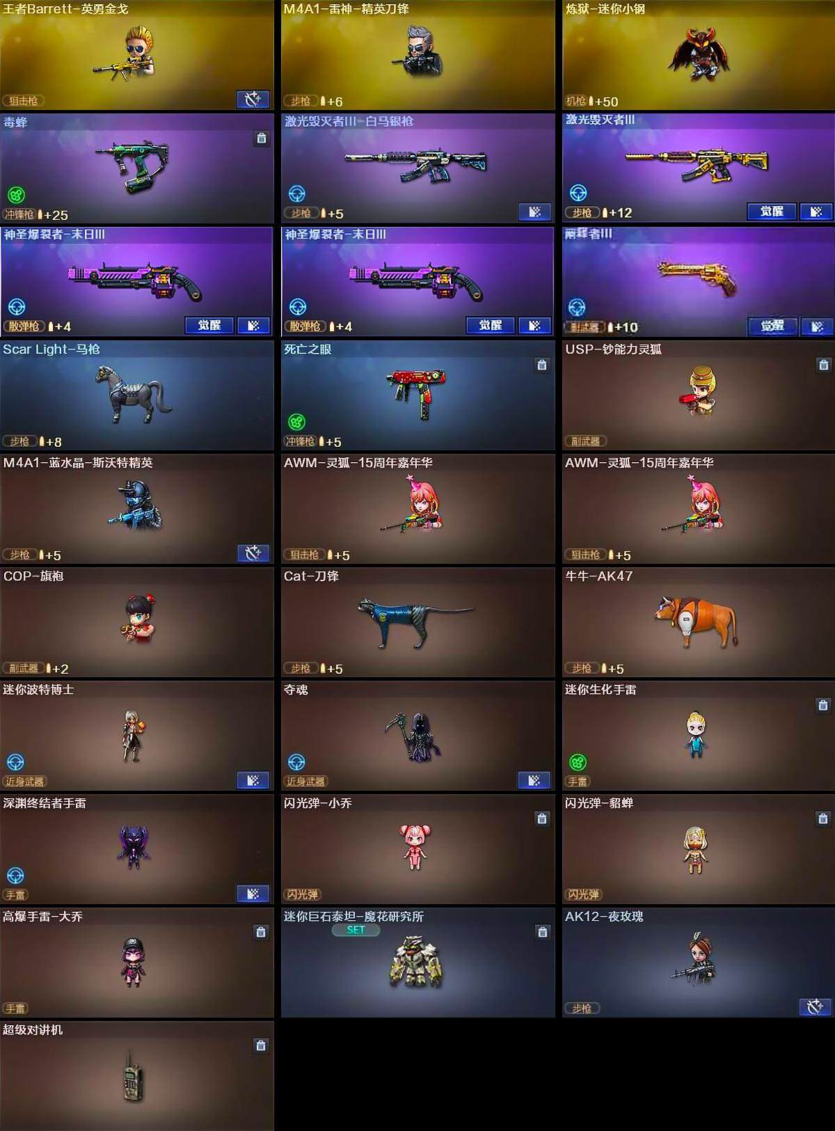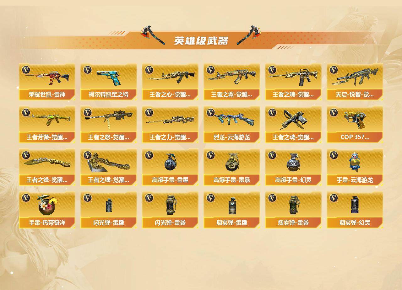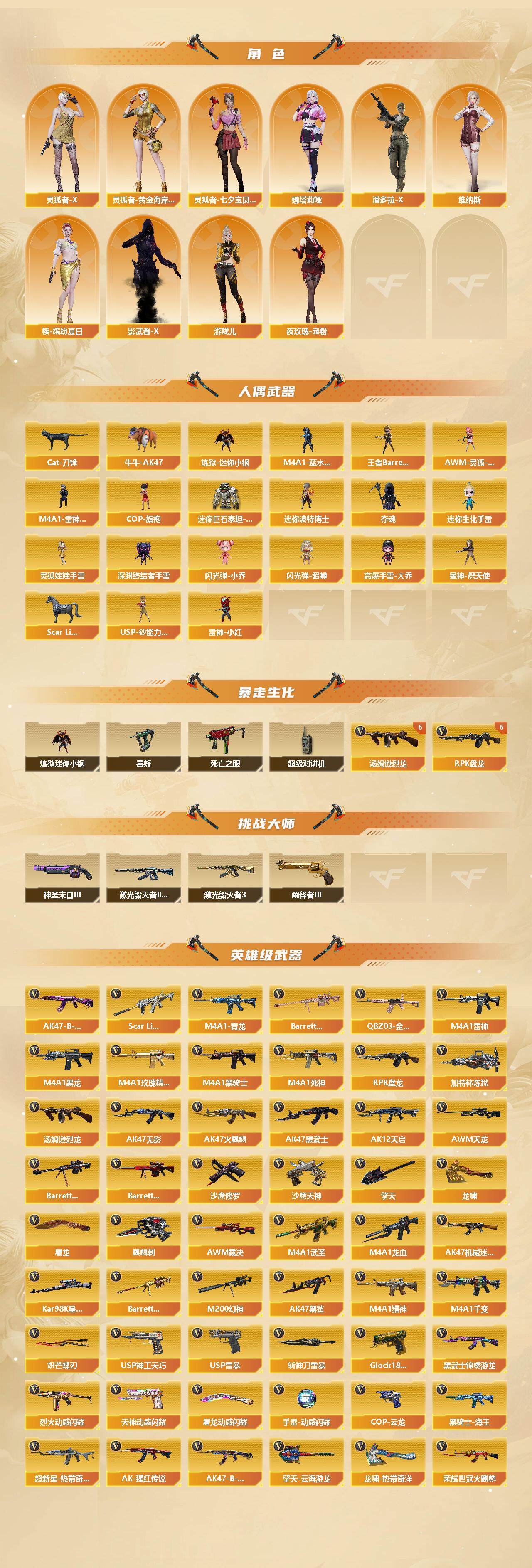 【热门武器】:QBZ03-金色蔷薇,Scar Light-白虎,M4A1-青龙,M200-幻神,死亡之眼,荣耀世冠-火麒麟,荣耀世冠-雷神,QBZ03-街机,柯尔特-冠军之特,Kar98K-星神,金色小号,Cat-刀锋,炼狱-迷你小钢,毒蜂,牛牛-AK47,M4A1-黑骑士*3,汤姆逊-烈龙*9,RPK-盘龙*8,加特林-炼狱,USP-钞能力灵狐,羊驼玩偶,雷神-小红,USP-雷暴,沙鹰-修罗*5,炽芒蝶刃,金刚伞