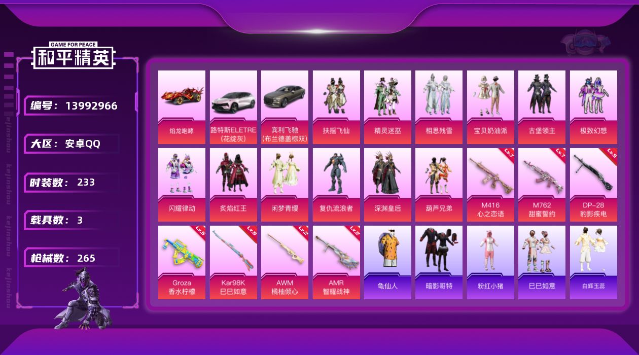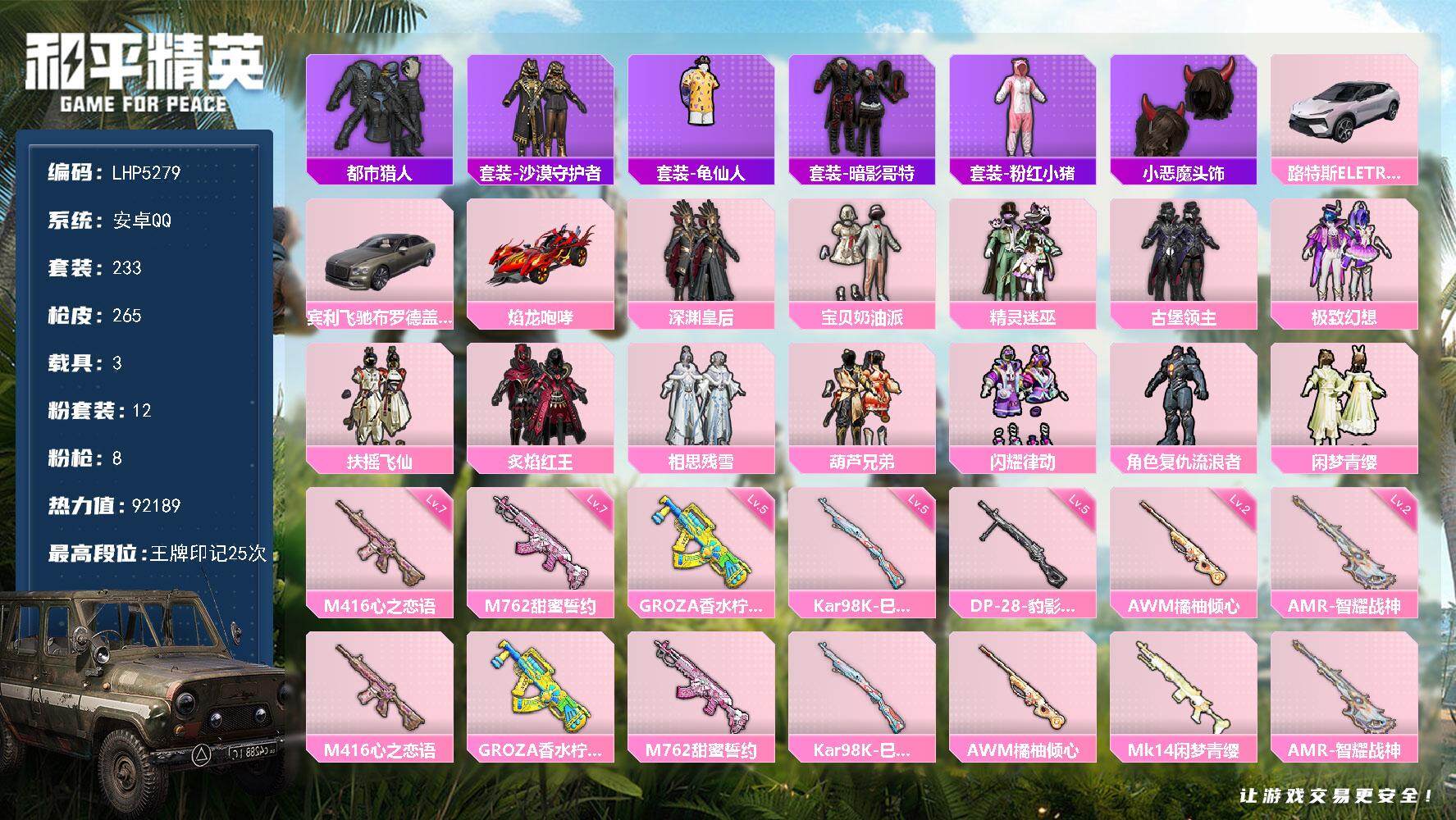 [13992966]素材身法号【特价急出/详情看图】:安卓 手Q-12粉装-8特效枪-3载具-4粉色飞行器-9.2w热力值-25王牌印记-233套装-265枪皮【热门品类】:套装-都市猎人,套装-沙漠守护者,套装-龟仙人,套装-暗影哥特,套装-粉红小猪,小恶魔头饰【粉色载具】:路特斯ELETRE(花绽灰),宾利飞驰(布罗德盖棕双色),焰龙咆哮【粉色套装】:粉装-深渊皇后,粉装-宝贝奶油派,粉装-精灵迷巫,粉装-古堡领主,粉装-极致幻想,粉装-扶摇飞仙,粉装-炙焰红王,粉装-相思残雪,粉装-葫芦兄弟,粉装-闪耀律动,角色-复仇流浪者,粉装-闲梦青缨【粉色枪皮等级】:M416-心之恋语(七级),GROZA-香水柠檬(五级),M762-甜蜜誓约(七级),Kar98K-巳巳如意(五级),AWM-橘柚倾心(二级),AMR-智耀战神(二级),DP-28-豹影疾电(五级)【粉色飞行器】:甜蜜誓约飞行器,星之彼岸飞行器,天之羽翼飞行器,幻梦音符飞行器