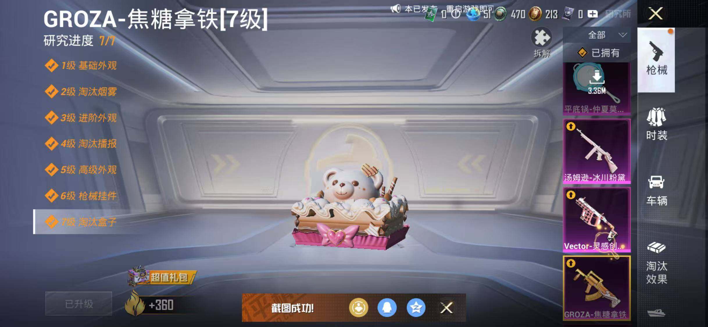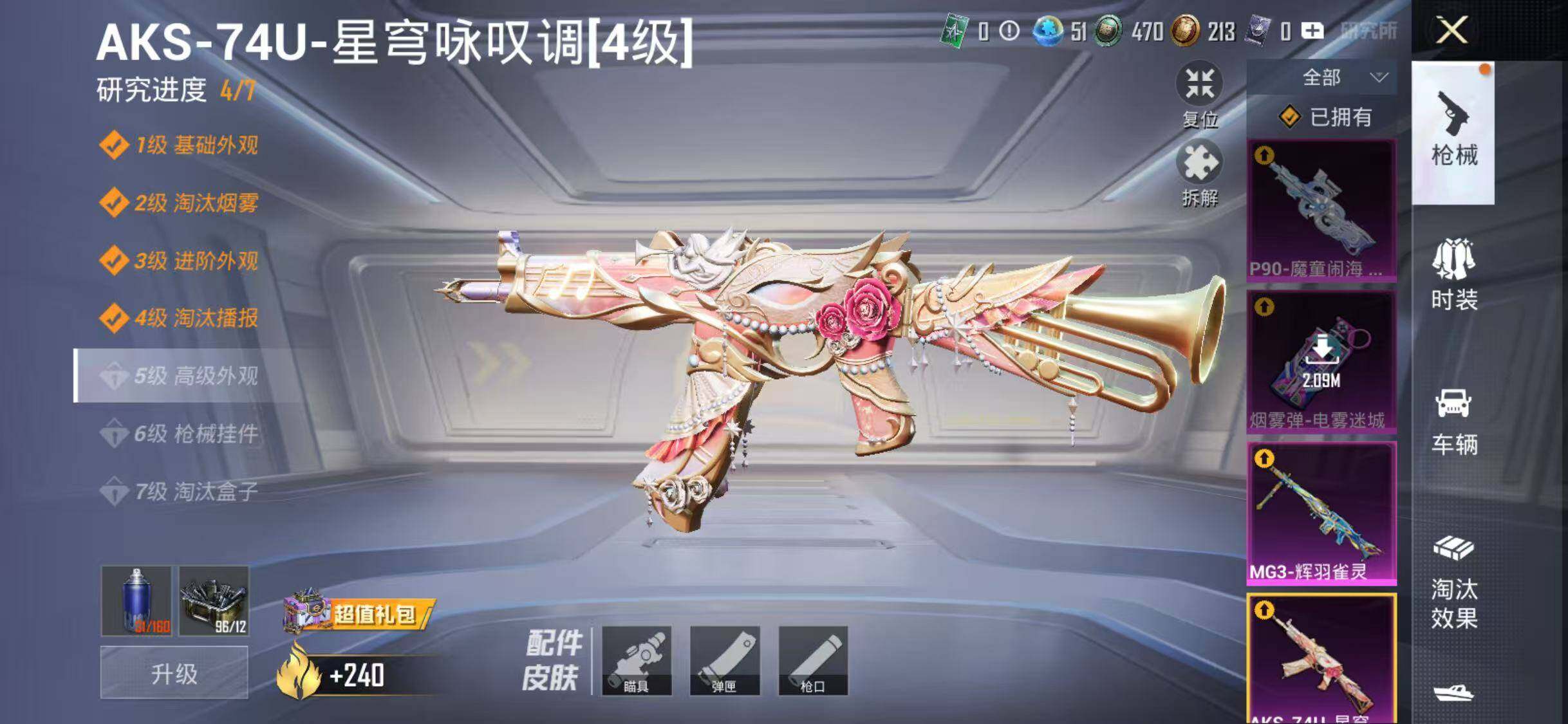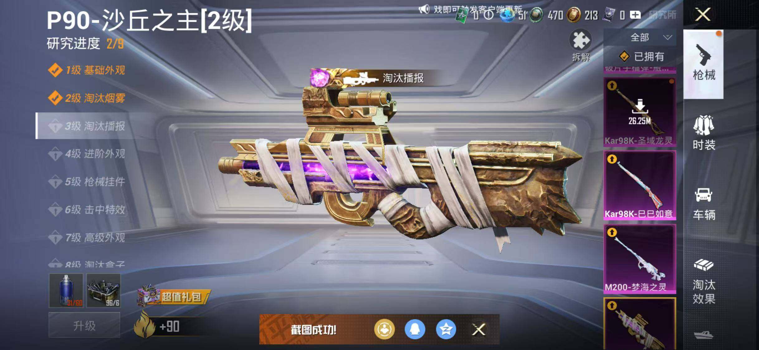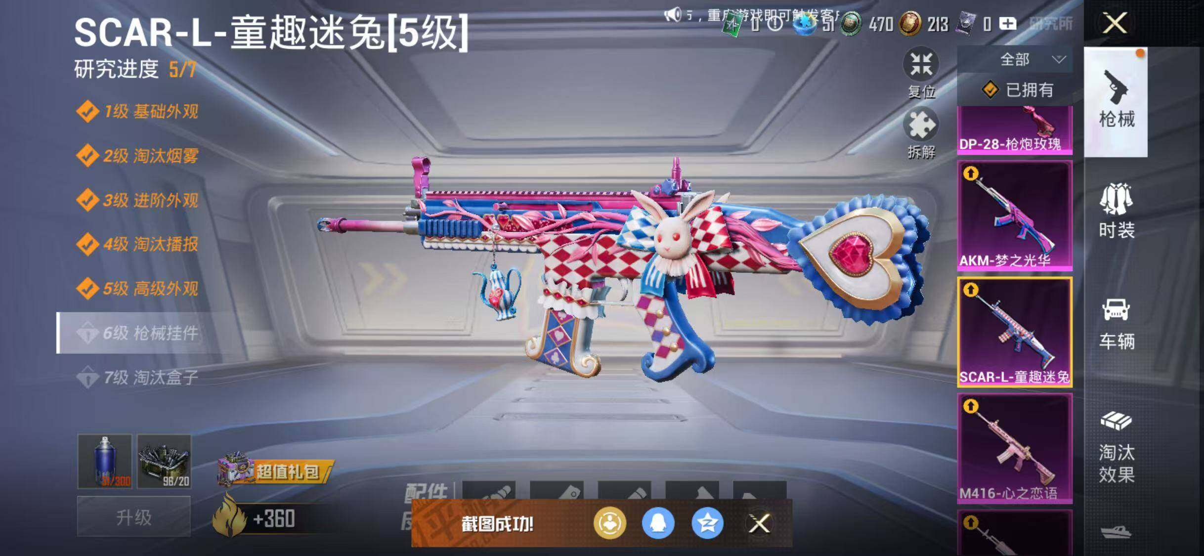 【粉色枪皮等级】:AKM-梦之光华(七级),SCAR-L-童趣迷兔(五级),M416-心之恋语(七级),M416-风花雪月(二级),GROZA-焦糖拿铁(七级),M762-甜蜜誓约(四级),UMP45-雪国精灵(五级),Vector-灵感创作师(四级),汤姆逊-冰川粉黛(四级),AKS-74U-星穹咏叹调(四级),P90-仙履奇缘(八级),P90-沙丘之主(二级),P90-魔童闹海 敖丙(三级),Kar98K-伏魔团(四级),Kar98K-巳巳如意(五级),Kar98K-圣域龙灵(一级),