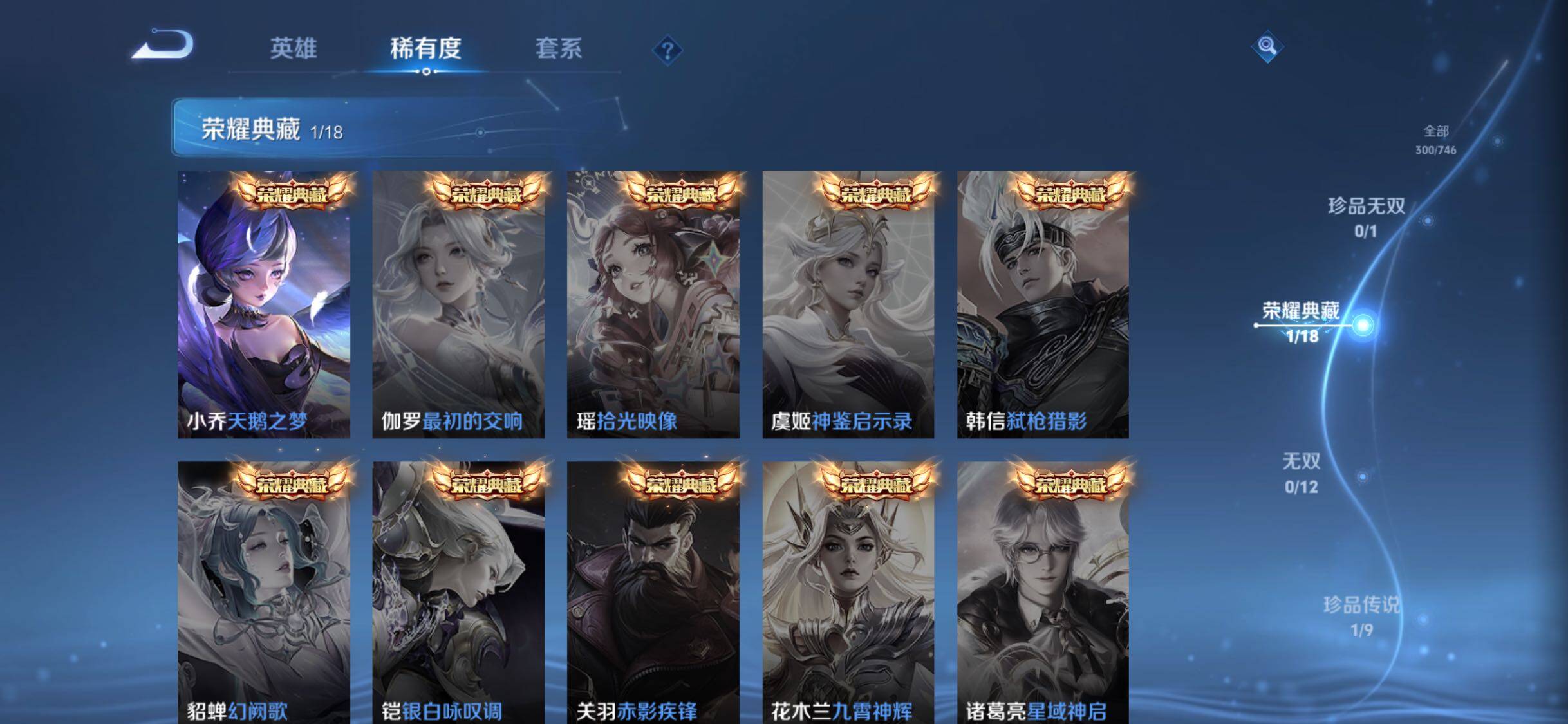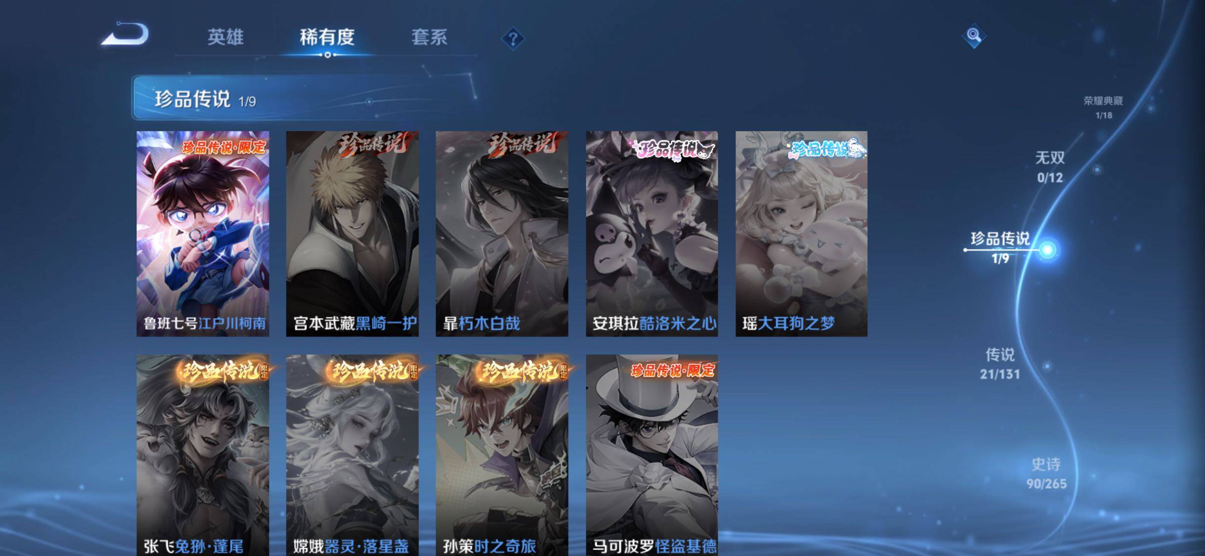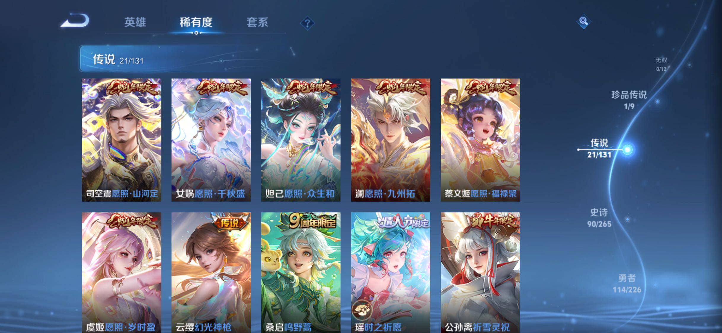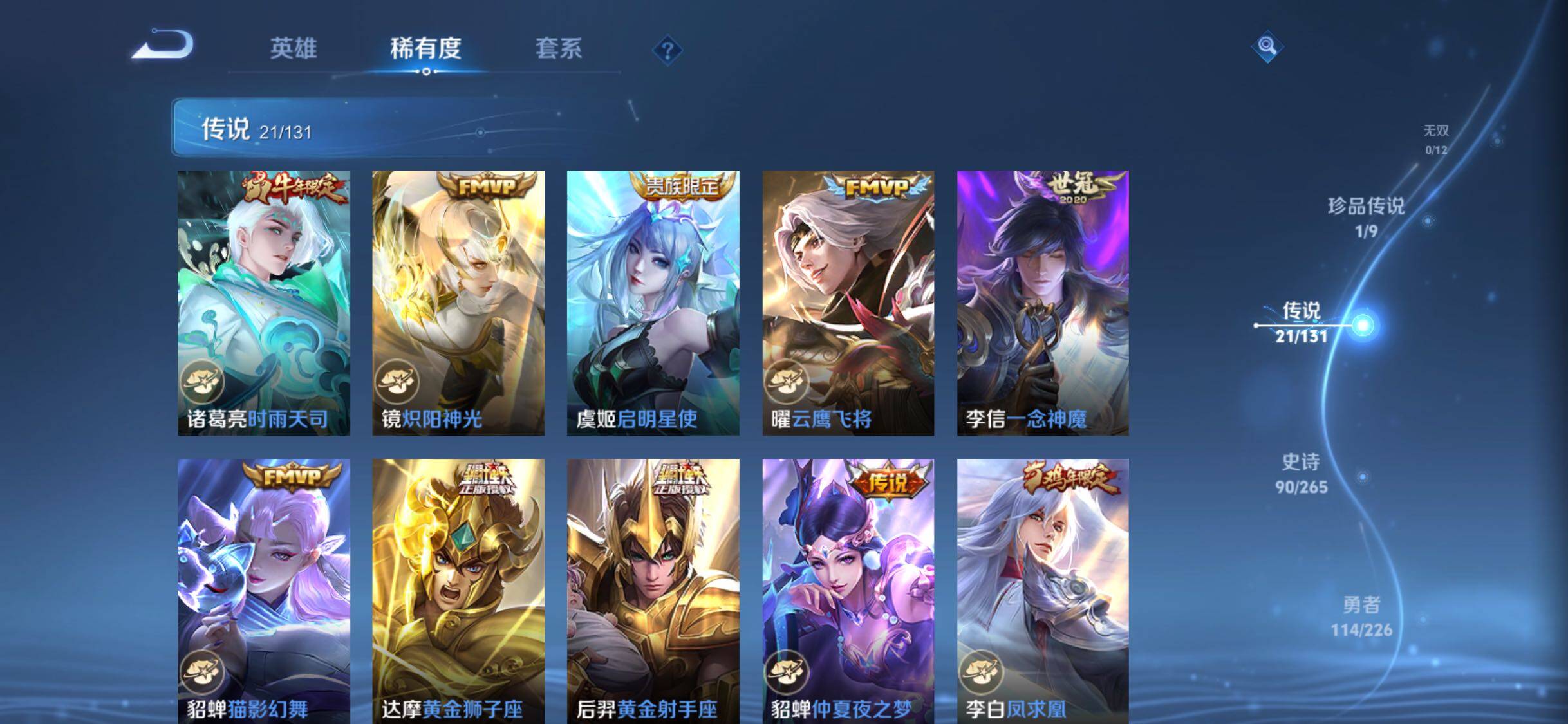 - [12145792]V7 1典藏 1珍品传说 8传说 124英雄 265皮肤 可修改实名 优质装备:鸣剑·曳影,酷洛米之心,冠军飞将,久胜战神,一念神魔,胖达荣荣,涂山容容 传说皮:幻光神枪 珍宝阁皮:优雅恋人,女武神,玩趣恶龙 限定皮:愿照·九州拓(澜年限),至尊宝,白虎志(电光耗子),傲雪梅枪,白晶晶,时雨天司(水龙头),飞衡(韩信年限),遇见飞天,高山流水,五谷丰年,游园惊梦,梁祝,御风骁将(吕布年限),岱宗(典韦年限),天狼溯光者,天狼绘梦者,李小龙,冰霜恋舞曲 史诗皮:鸭鸭历险记-刘禅,龙之律动,石田雨龙,茶境仙,紫霞仙子,苍穹之光,电玩小子(小书包),黄金分割率,特工魅影,江河有灵,青蛇,蒙恬荣光圣徽,魅语,电玩·爆裂旋风,无限星赏官,晚萤,偶像歌手,龙骑士(小龙虾),猫狗日记-孙策,猫狗日记-大乔,时之恋人-孙尚香,乱世虎臣,节奏热浪,女仆咖啡,摇滚巨星,水果甜心,绅士熊喵,天才门将,星夜王子,心灵骇客,功夫厨神,德古拉伯爵,暗隐猎兽者,幽灵船长,鬼剑武藏,乐园奇幻夜,舞动绿茵,地狱岩魂,纤云弄巧,繁星吟游(呼啦呼啦),缤纷独角兽,乘风破浪,逐浪之夏,月团寄思,水晶猎龙者,曙光守护者,箭羽风息,金属风暴,原初追逐者,圣诞狂欢,圣诞恋歌,鹰眼统帅,王者之锤,魅力维加斯,黎明之约,未来纪元-赵云