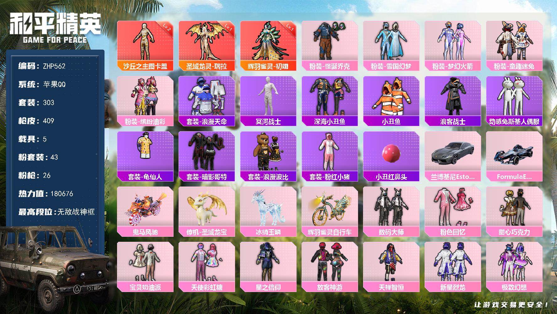 [13994357]苹果 木乃伊雪国乔克!手Q-无敌战神框-3神装-43粉装-26特效枪-5载具-26粉色飞行器-180676热力值-20王牌印记-303套装-409枪皮+王者荣耀 营地ID:426864635 V8-300皮1水1珍21传说