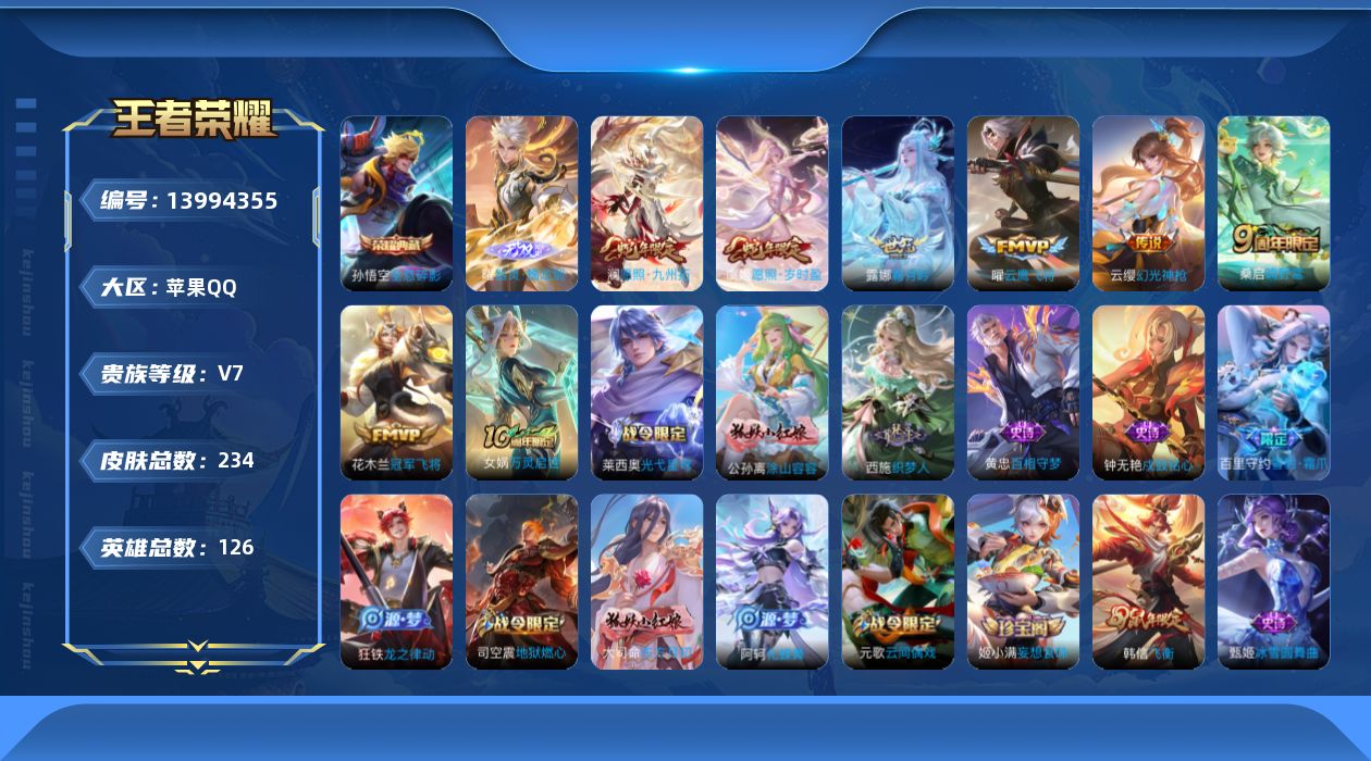[13994355]苹果Q-V7-永恒钻石I段位-126英雄-230皮肤-1典藏-1无双-7传说-70史诗 【英雄全皮】:空空儿全皮,影全皮 【荣耀典藏】:孙悟空全息碎影 【无双皮肤】:曜器灵螭龙剑 【传说皮肤】:澜愿照九州拓,虞姬愿照岁时盈,云缨幻光神枪,桑启鸣野蒿,露娜霜月吟,曜云鹰飞将,花木兰冠军飞将 【限定皮肤】:蒙犽顽岩魄,蔡文姬夏日便利店,虞姬夏日便利店,姜子牙天穹之誓,杨戬破阵退雄兵,李白谪仙醉月,狄仁杰阴阳师,赵云皇家上将,赵云百木心枪,孙尚香蔷薇恋人,庄周高山流水,元歌云间偶戏,元歌无心,甄姬游园惊梦,狄仁杰魔术师,狄仁杰万华元夜,达摩沙漠行僧,项羽海滩派对,老夫子醍醐杖,程咬金演武夺筹,韩信飞衡,亚瑟潮玩骑士王,李元芳云中旅人,钟馗驱傩正仪,雅典娜单词大作战,鬼谷子原初探秘者,鬼谷子五谷丰年,苏烈千军破阵,沈梦溪大漠名商,明世隐疑决卦,裴擒虎李小龙,裴擒虎擒涛扼浪,云中君纤云弄巧,上官婉儿梁祝,上官婉儿神器万象笔,嫦娥拒霜思,蒙犽狂想玩偶喵,鲁班大师探海日志,桑启海盐诗旅,阿古朵江河有灵,张良古海寻踪,蒙犽百解令,鬼谷子天穹祈灯,姬小满妄想食味,沈梦溪龙舞盛年,刘邦剑破天穹,上官婉儿群星魔术团,程咬金群星魔术团,刘备异域游侠,周瑜熔金海岸 【年限皮肤】:韩信飞衡 【赛季限定】:狄仁杰万华元夜,达摩沙漠行僧,老夫子醍醐杖,程咬金演武夺筹,张良古海寻踪,李元芳云中旅人,钟馗驱傩正仪,鬼谷子原初探秘者,苏烈千军破阵,沈梦溪大漠名商,明世隐疑决卦,裴擒虎擒涛扼浪,鲁班大师探海日志,桑启海盐诗旅,鬼谷子天穹祈灯,刘邦剑破天穹,姜子牙天穹之誓 【战令限定】:蔡文姬夏日便利店,虞姬夏日便利店,元歌云间偶戏,亚瑟潮玩骑士王,雅典娜单词大作战,蒙犽狂想玩偶喵 【史诗皮肤】:项羽苍穹之光,露娜紫霞仙子,阿轲暗夜猫娘,赵云皇家上将,赵云未来纪元,貂蝉圣诞恋歌,甄姬冰雪圆舞曲,王昭君偶像歌手,狄仁杰魔术师,廉颇地狱岩魂,宫本武藏鬼剑武藏,孙尚香蔷薇恋人,孙尚香水果甜心,妲己魅力维加斯,妲己女仆咖啡,墨子金属风暴,吕布圣诞狂欢,李白千年之狐,张飞乱世虎臣,花木兰水晶猎龙者,诸葛亮黄金分割率,甄姬游园惊梦,亚瑟心灵战警,安琪拉心灵骇客,百里守约特工魅影,铠曙光守护者,刘禅天才门将,李元芳逐浪之夏,程咬金功夫厨神,白起星夜王子,阿轲节奏热浪,孙策猫狗日记,伽罗箭羽风息,狄仁杰鹰眼统帅,上官婉儿