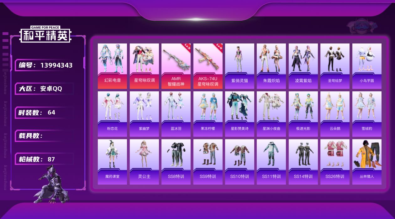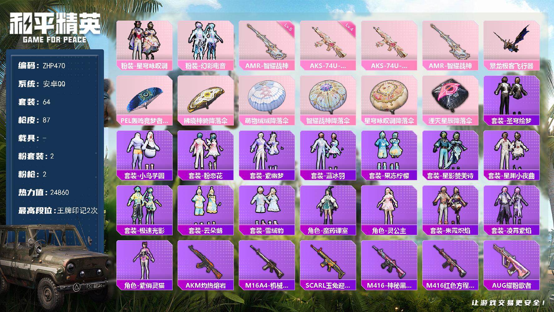 [13994343]可二次【店主推荐捡漏号!可直接换绑】 安卓 手Q-2粉装-2特效枪-1粉色飞行器-2.4w热力值-2王牌印记-64套装-87枪皮【粉色套装】:粉装-星穹咏叹调,粉装-幻彩电音【粉色枪皮等级】:AKS-74U-星穹咏叹调(四级),AMR-智耀战神(五级)【粉色飞行器】:繁龙极客飞行器