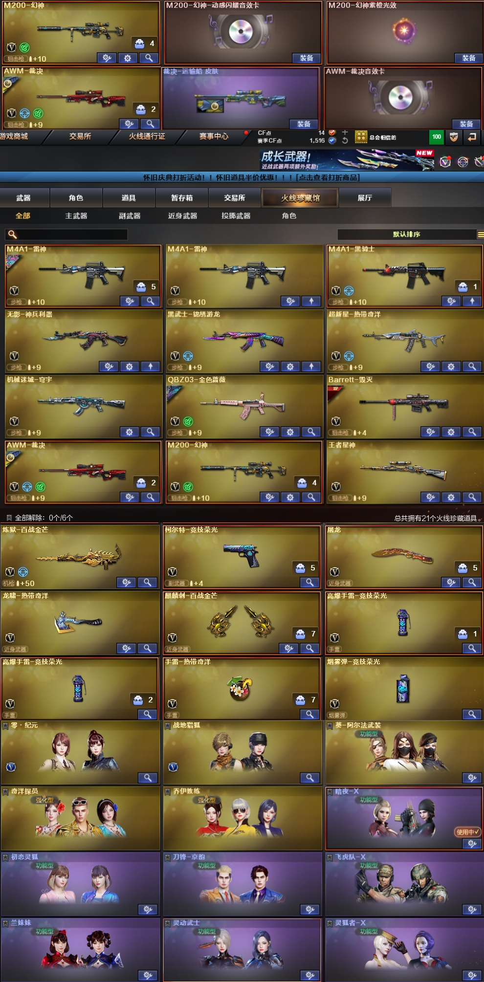 - [12561108]【商品标题】:云南一区-40V-4王者-0炫金 【热门武器】:金色蔷薇-古蛇迷踪,修罗-古蛇迷踪,M200-竞技荣光,汤姆逊-烈龙*5,沙鹰-修罗 【王者炫金武器】:王者云击 【稀有皮肤】:M200-庆典-CFS 2021 【角色】:机械姬,青霞仙子 【人偶武器】:AWM-灵狐-15周年嘉年华,迷你牛牛,灵狐娃娃手雷,生化手雷-机甲核心 【暴走生化】:黑龙吞噬者,超级对讲机 【英雄级武器】:M200-竞技荣光,高爆手雷-竞技荣光,烟雾弹-竞技荣光,闪光弹-竞技荣光,金色蔷薇-古蛇迷踪,M4A1-雷神,汤姆逊-烈龙*5,Barrett-极光,黑武士-锦绣游龙,黑骑士-海王,修罗-古蛇迷踪,沙鹰-天神*5,沙鹰-修罗,麒麟刺*2,屠龙*3,龙啸-热带奇洋 【特殊枪械】:0白虎,0黑骑士,5烈龙,0盘龙,0炼狱,0蝴蝶斯泰尔