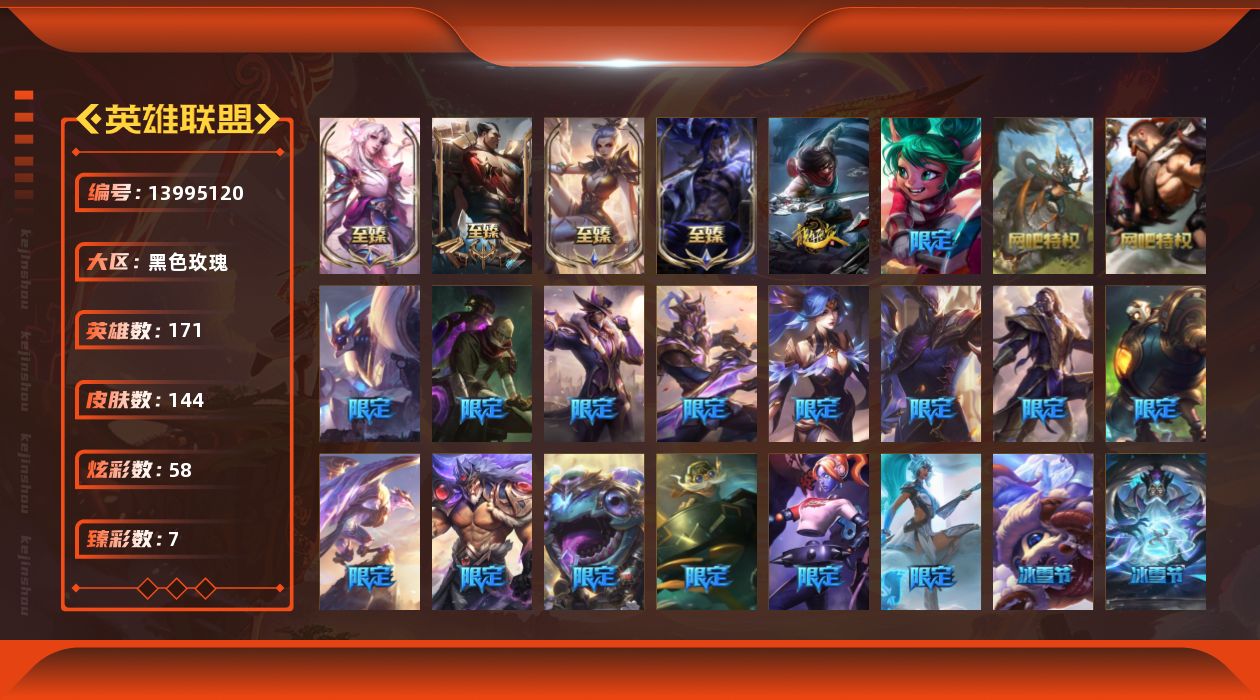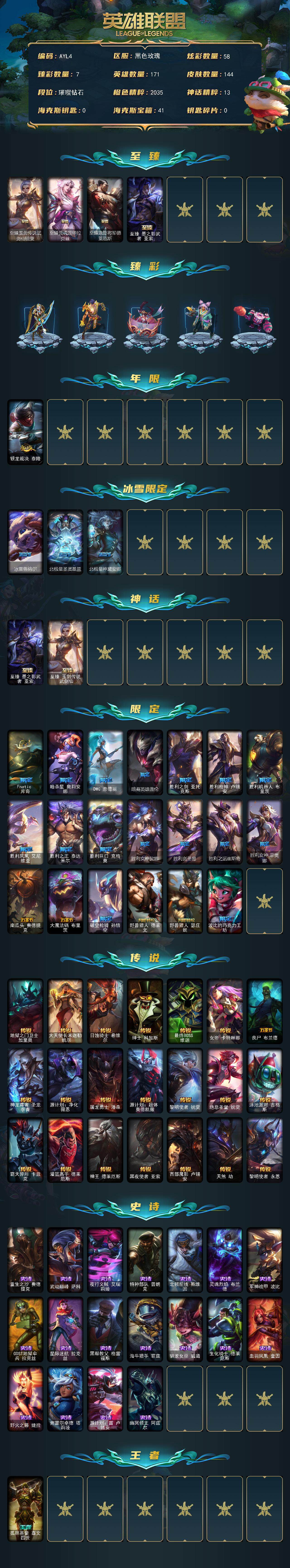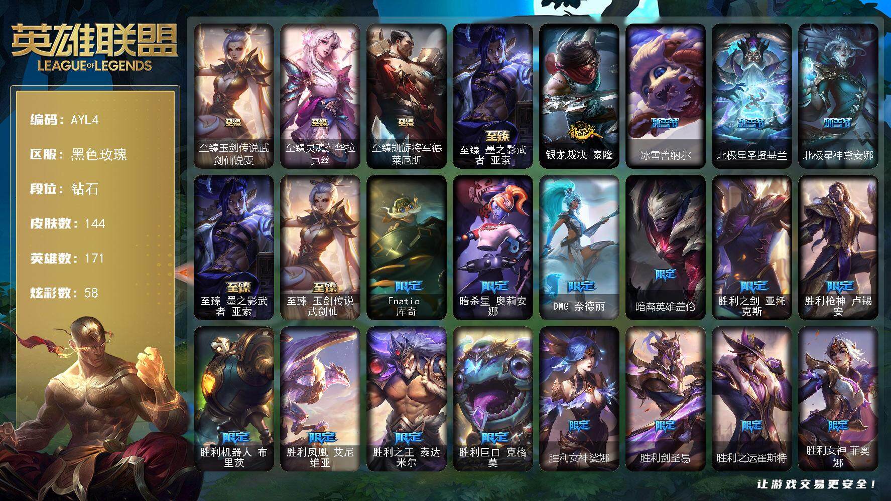 [13995120]钻石段位-171英雄-144皮肤-58炫彩-0终极-4神话-25限定-21传说-18史诗
