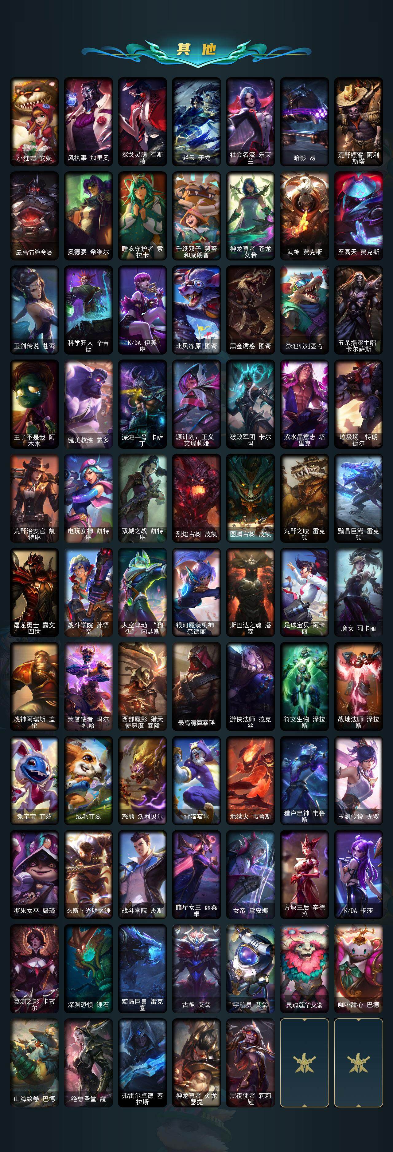 【其他皮肤1】:小红帽安妮,风执事加里奥,探戈灵魂崔斯特,赵云子龙,社会名流乐芙兰,暗影易,荒野镖客阿利斯塔,最高清算赛恩,奥德赛希维尔,睡衣守护者索拉卡,千纸双子努努和威朗普,神龙尊者苍龙艾希,武神贾克斯,至高天贾克斯,玉剑传说苍鸾,科学狂人辛吉德,KDA伊芙琳,北风冻原图奇,黑金诱惑图奇,泳池派对图奇,五杀摇滚主唱卡尔萨斯,王子不是我阿木木,健美教练蒙多,深海一号卡萨丁,源计划正义艾瑞莉娅,破败军团卡尔玛,紫水晶意志塔里克,垃圾场特朗德尔,荒野治安官凯