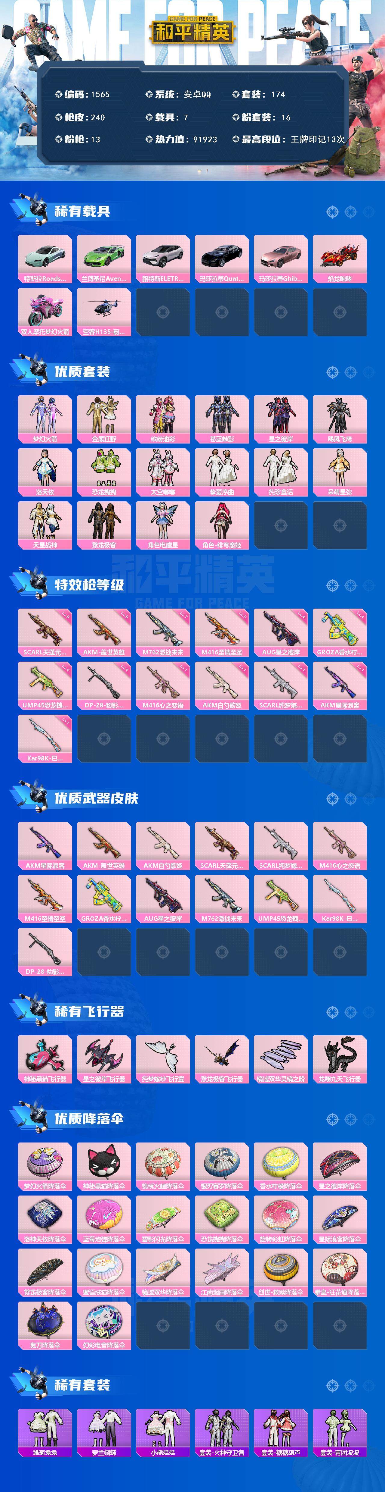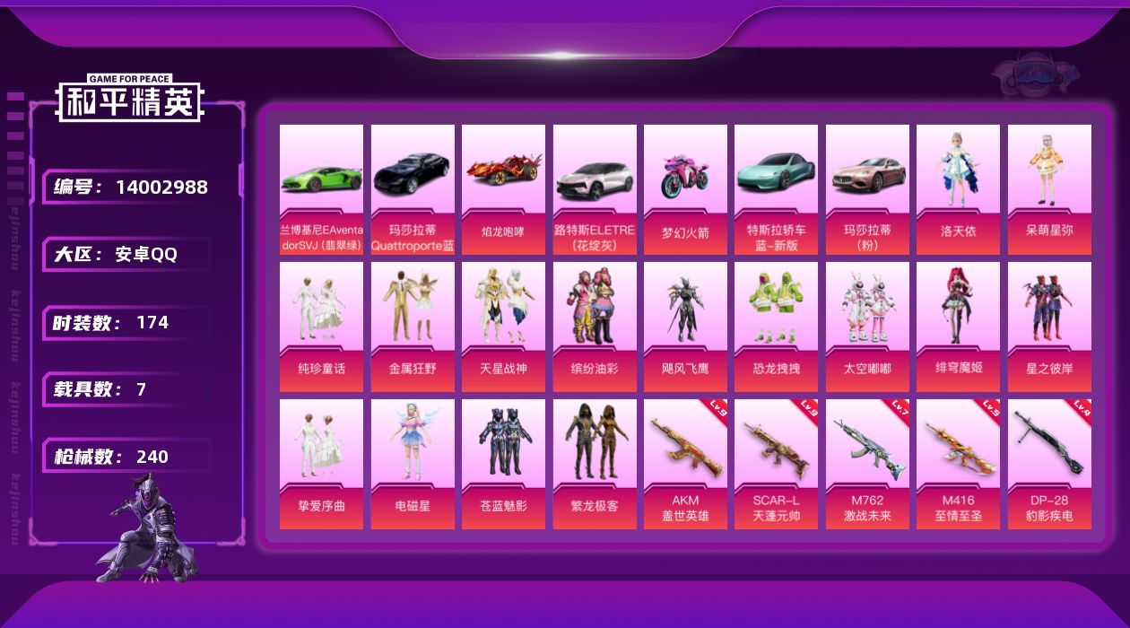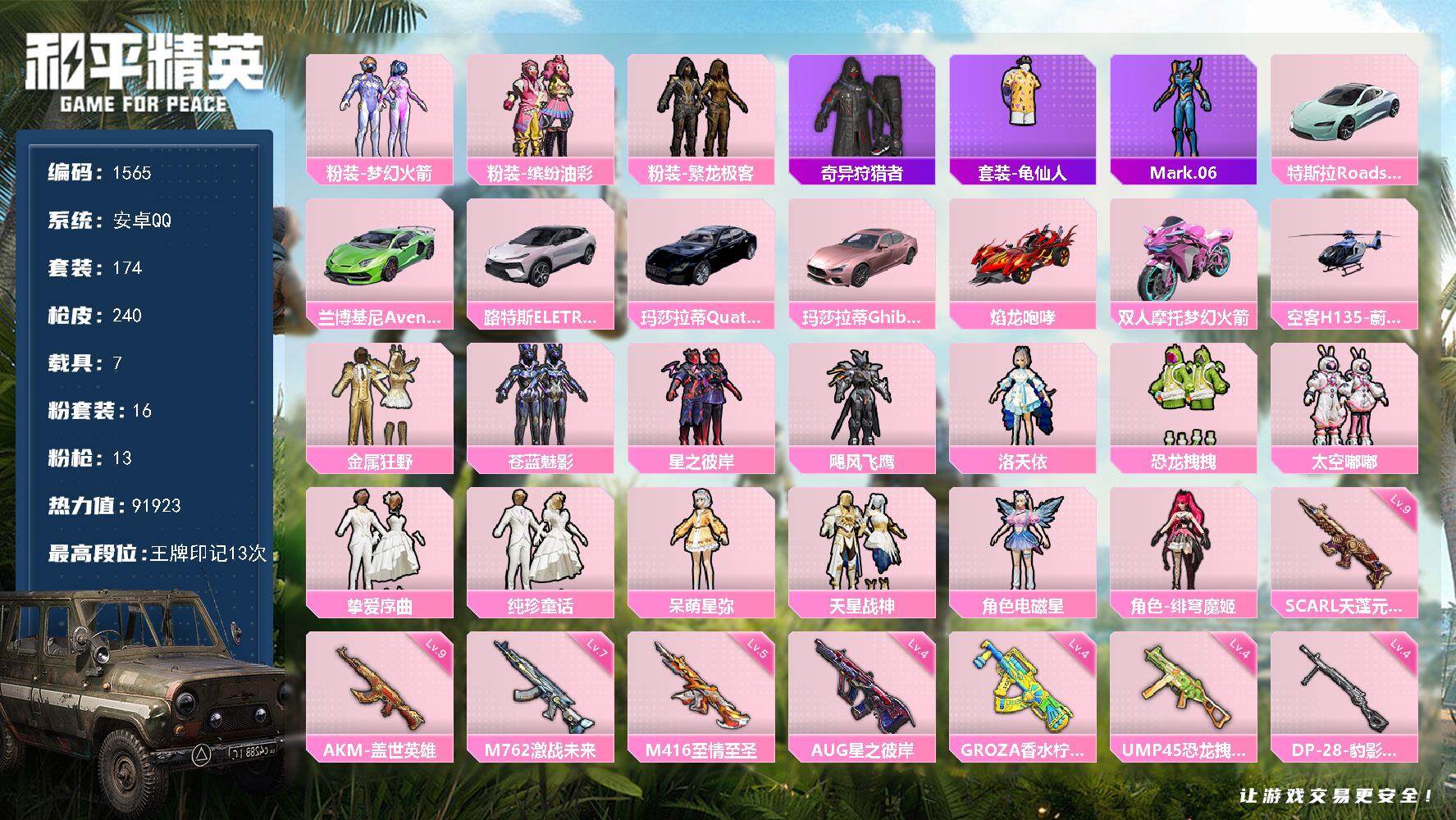 [14002988]安卓 手Q-16粉装-13特效枪-7载具-6粉色飞行器-91923热力值-13王牌印记-174套装-240枪皮 【热门品类】:粉装-梦幻火箭,粉装-缤纷油彩,粉装-繁龙极客,套装-奇异狩猎者,套装-龟仙人,角色-Mark.06 【粉色载具】:特斯拉Roadster(水滴蓝),兰博基尼Aventador SVJ(翡翠绿),路特斯ELETRE(花绽灰),玛莎拉蒂Quattroporte(夜幕蓝),玛莎拉蒂Ghibli(粉),焰龙咆哮,双人摩托-梦幻火箭,空客H135-蔚蓝之翼 【粉色套装】:粉装-梦幻火箭,粉装-金属狂野,粉装-缤纷油彩,粉装-苍蓝魅影,粉装-星之彼岸,粉装-飓风飞鹰,角色-洛天依,粉装-恐龙拽拽,粉装-太空嘟嘟,粉装-挚爱序曲,粉装-纯珍童话,角色-呆萌星弥,粉装-天星战神,粉装-繁龙极客,角色-电磁星,角色-绯穹魔姬 【粉色枪皮等级】:AKM-星际浪客(一级),AKM-盖世英雄(九级),AKM-白勺歌姬(一级),SCAR-L-天蓬元帅(九级),SCAR-L-纯梦嫁纱(一级),M416-心之恋语(一级),M416-至情至圣(五级),GROZA-香水柠檬(四级),AUG-星之彼岸(四级),M762-激战未来(七级),UMP45-恐龙拽拽(四级),Kar98K-巳巳如意(一级),DP-28-豹影疾电(四级) 【粉色枪皮】:AKM-星际浪客,AKM-盖世英雄,AKM-白勺歌姬,SCAR-L-天蓬元帅,SCAR-L-纯梦嫁纱,M416-心之恋语,M416-至情至圣,GROZA-香水柠檬,AUG-星之彼岸,M762-激战未来,UMP45-恐龙拽拽,Kar98K-巳巳如意,DP-28-豹影疾电 【粉色飞行器】:神秘黑猫飞行器,星之彼岸飞行器,纯梦嫁纱飞行翼,繁龙极客飞行器,镜域双华-灵镜之阶,龙翔九天飞行器 【粉色降落伞】:梦幻火箭降落伞,神秘黑猫降落伞,锦绣火鲤降落伞,银刃赛罗降落伞,香水柠檬降落伞,星之彼岸降落伞,洛神天依降落伞,蓝莓炮弹降落伞,碧影闪光降落伞,恐龙拽拽降落伞,旋转彩虹降落伞,星际浪客降落伞,繁龙极客降落伞,蜜语绒猫降落伞,镜域双华降落伞,江南烟雨降落伞,创世·救赎降落伞,拳皇·狂花道降落伞,鬼刀降落伞,幻彩电音降落伞 【稀有套装】:套装-龟仙人,套装-雏菊兔兔,套装-萝兰蝴蝶,套装-小熊娃娃,套装-火种守卫者,套装-糖糖葫芦,套装-青团波波