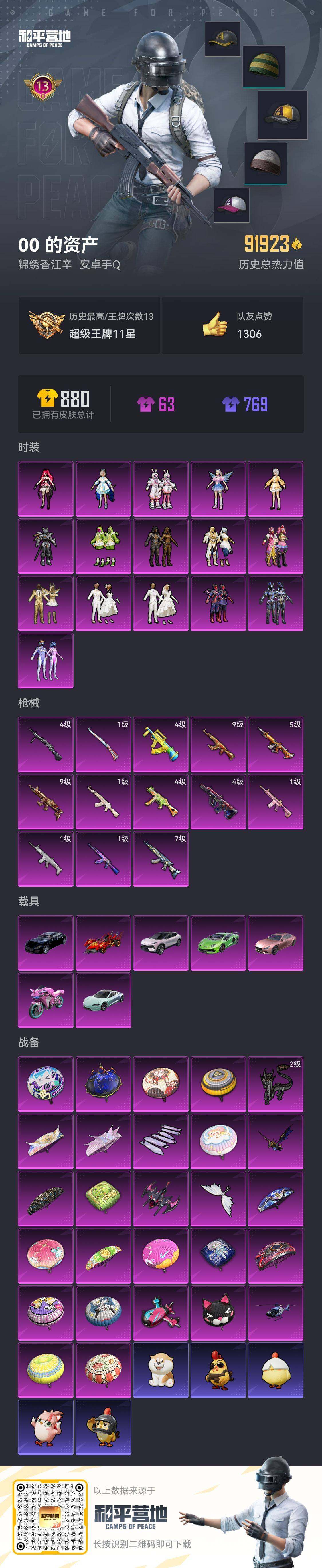 [14002988]安卓 手Q-16粉装-13特效枪-7载具-6粉色飞行器-91923热力值-13王牌印记-174套装-240枪皮