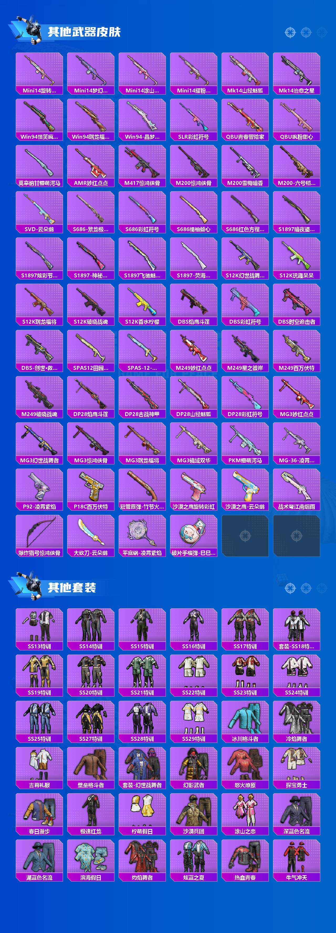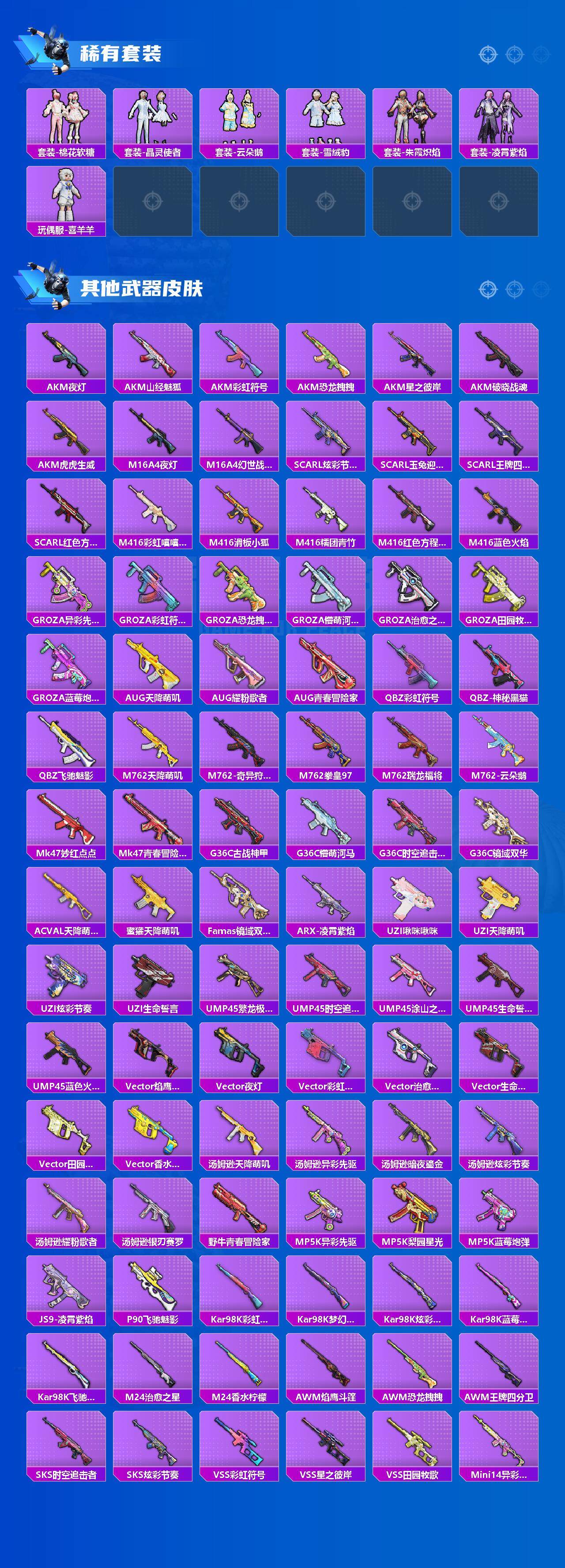 AKM-星际浪客,AKM-盖世英雄,AKM-白勺歌姬,SCAR-L-天蓬元帅,SCAR-L-纯梦嫁纱,M416-心之恋语,M416-至情至圣,GROZA-香水柠檬,AUG-星之彼岸,M762-激战未来,UMP45-恐龙拽拽,Kar98K-巳巳如意