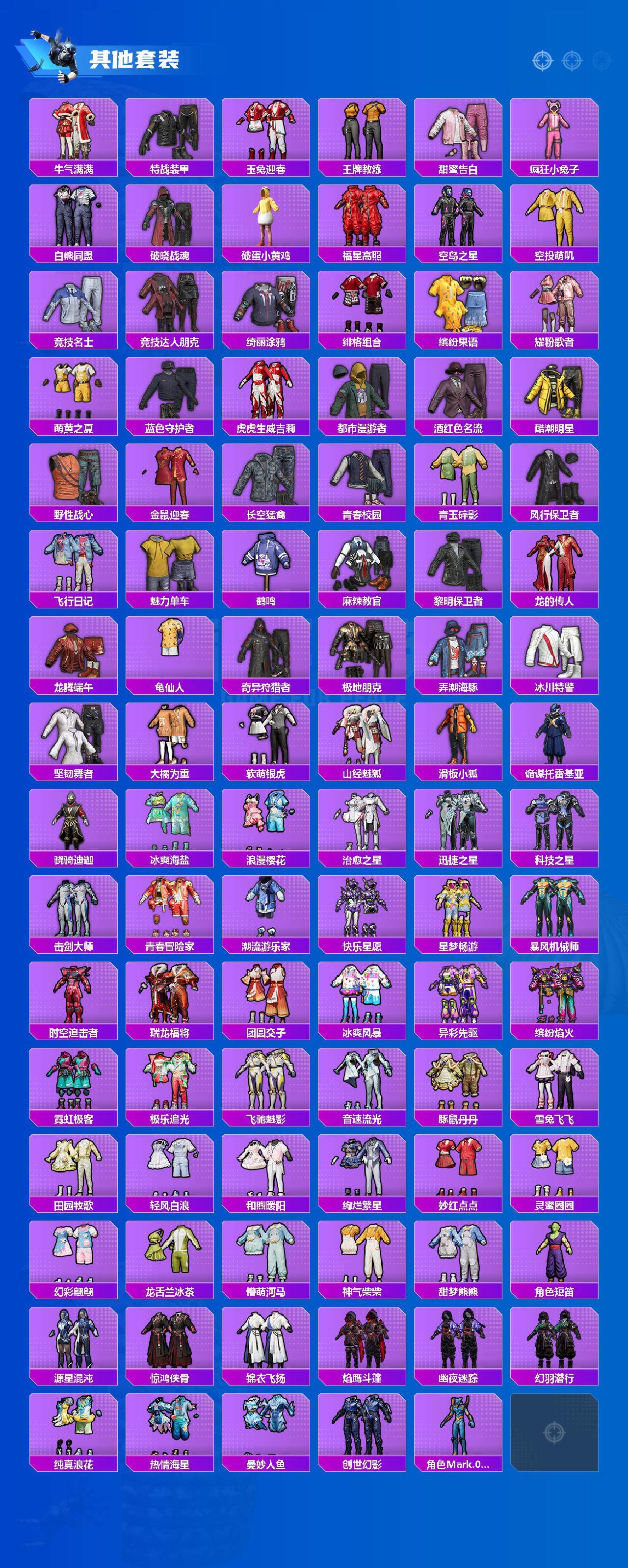 套装-龟仙人,角色-Mark.06,套装-极速红龙,套装-破蛋小黄鸡,套装-弄潮海豚,套装-山经魅狐,套装-滑板小狐,套装-冰爽海盐,套装-瑞龙福将,套装-团圆交子,套装-豚鼠丹丹