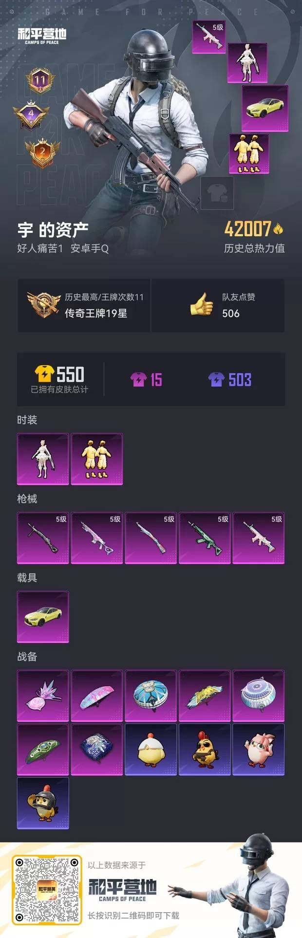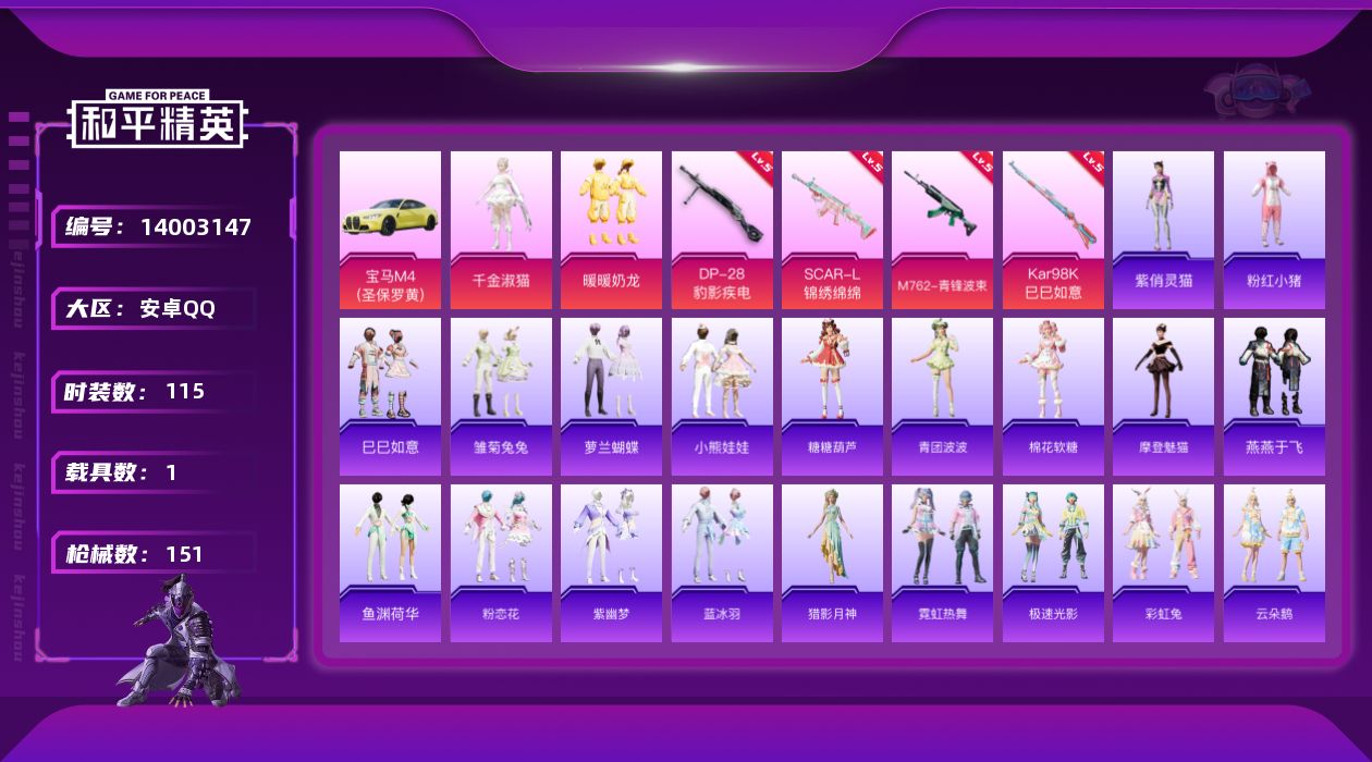 [14003147]安卓 手Q-2粉装-5特效枪-1载具-1粉色飞行器-42007热力值-11王牌印记-115套装-151枪皮