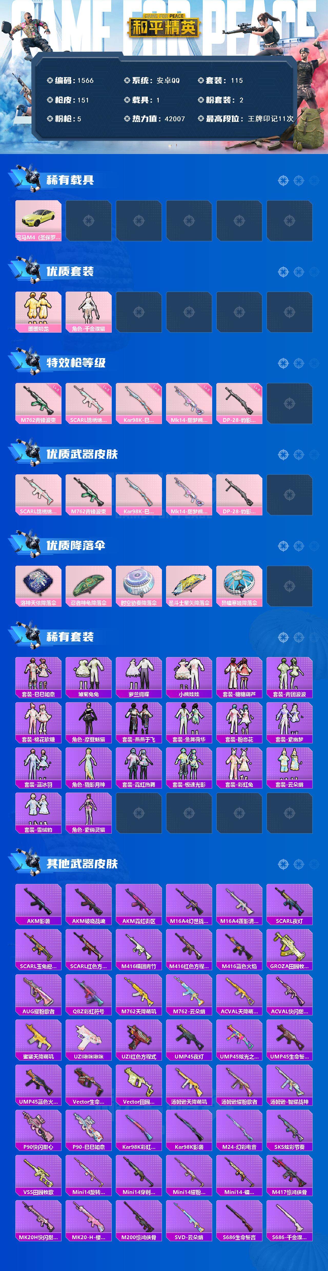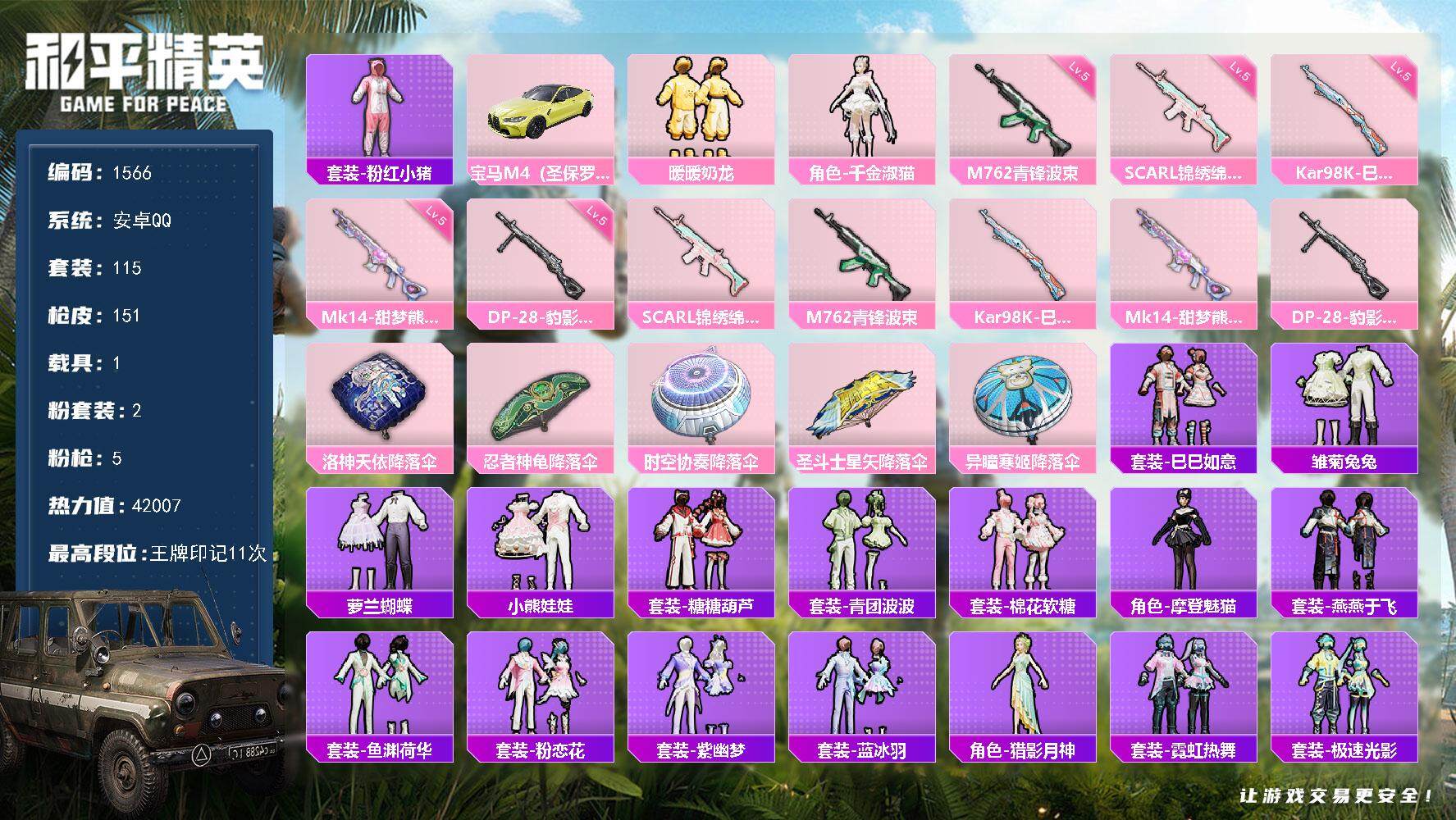 [14003147]安卓 手Q-2粉装-5特效枪-1载具-1粉色飞行器-42007热力值-11王牌印记-115套装-151枪皮 【热门品类】:套装-粉红小猪 【粉色载具】:宝马M4(圣保罗黄) 【粉色套装】:粉装-暖暖奶龙,角色-千金淑猫 【粉色枪皮等级】:SCAR-L-锦绣绵绵(五级),M762-青锋波束(五级),Kar98K-巳巳如意(五级),Mk14-甜梦熊击(五级),DP-28-豹影疾电(五级) 【粉色枪皮】:SCAR-L-锦绣绵绵,M762-青锋波束,Kar98K-巳巳如意,Mk14-甜梦熊击,DP-28-豹影疾电 【粉色降落伞】:洛神天依降落伞,忍者神龟降落伞,时空协奏降落伞,圣斗士星矢降落伞,异瞳寒姬降落伞 【稀有套装】:套装-巳巳如意,套装-雏菊兔兔,套装-萝兰蝴蝶,套装-小熊娃娃,套装-糖糖葫芦,套装-青团波波,套装-棉花软糖,角色-摩登魅猫,套装-燕燕于飞,套装-鱼渊荷华,套装-粉恋花,套装-紫幽梦,套装-蓝冰羽,角色-猎影月神,套装-霓虹热舞,套装-极速光影,套装-彩虹兔,套装-云朵鹅,套装-雪绒豹,角色-紫俏灵猫,套装-炫彩糖果 【稀有枪皮】:AKM-影袭,AKM-破晓战魂,AKM-霓虹街区,M16A4-幻世战舞者,M16A4-莲影清波,SCAR-L-夜灯,SCAR-L-玉兔迎春,SCAR-L-红色方程式,M416-糯团青竹,M416-红色方程式,M416-蓝色火焰,GROZA-田园牧歌,AUG-耀粉歌者,QBZ-彩虹符号,M762-天降萌叽,M762-云朵鹅,AC-VAL-天降萌叽,AC-VAL-快闪甜心,蜜獾-天降萌叽,UZI-啾咪啾咪,UZI-红色方程式,UMP45-夜灯,UMP45-炫光之旅,UMP45-生命誓言,UMP45-蓝色火焰,Vector-生命誓言,Vector-田园牧歌,汤姆逊-天降萌叽,汤姆逊-耀粉歌者,汤姆逊-智耀战神,P90-快闪甜心,P90-巳巳如意,Kar98K-彩虹符号,Kar98K-影袭,M24-幻彩电音,SKS-炫彩节奏,VSS-田园牧歌,Mini14-旋转彩虹,Mini14-穿刺龙虾,Mini14-耀粉歌者,Mini14-镭金极速,M417-惊鸿侠骨,MK20-H-快闪甜心,MK20-H-樱桃泡泡,M200-惊鸿侠骨,SVD-云朵鹅,S686-生命誓言,S686-巳巳如意,S686-千金淑猫,S1897-炫彩节奏,S12K
