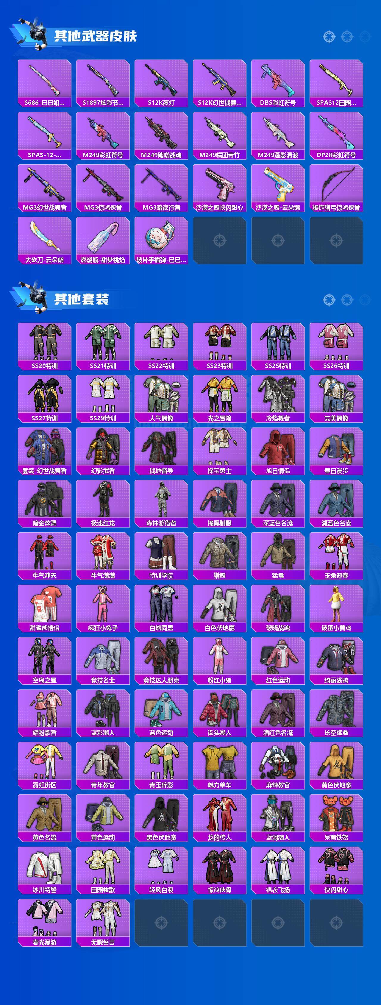 【稀有枪皮】:AKM-影袭,AKM-破晓战魂,AKM-霓虹街区,M16A4-幻世战舞者,M16A4-莲影清波,SCAR-L-夜灯,SCAR-L-玉兔迎春,SCAR-L-红色方程式,M416-糯团青竹,M416-红色方程式,M416-蓝色火焰,GROZA-田园牧歌,AUG-耀粉歌者,QBZ-彩虹符号,M762-天降萌叽,M762-云朵鹅,AC-VAL-天降萌叽,AC-VAL-快闪甜心,蜜獾-天降萌叽,UZI-啾咪啾咪,UZI-红色方程式,UMP45-夜灯,UMP45-炫光之旅,UMP45-生命誓言,UMP45-蓝色火焰,Vector-生命誓言,Vector-田园牧歌,汤姆逊-天降萌叽,汤姆逊-耀粉歌者,汤姆逊-智耀战神,P90-快闪甜心,P90-巳巳如意,Kar98K-彩虹符号,Kar98K-影袭,M24-幻彩电音,SKS-炫彩节奏,VSS-田园牧歌,Mini14-旋转彩虹,Mini14-穿刺龙虾,Mini14-耀粉歌者,Mini14-镭金极速,M417-惊鸿侠骨,MK20-H-快闪甜心,MK20-H-樱桃泡泡,M200-惊鸿侠骨,SVD-云朵鹅,S686-生命誓言,S686-巳巳如意,S686-千金淑猫,S1897-炫彩节奏,S12K