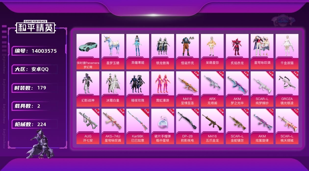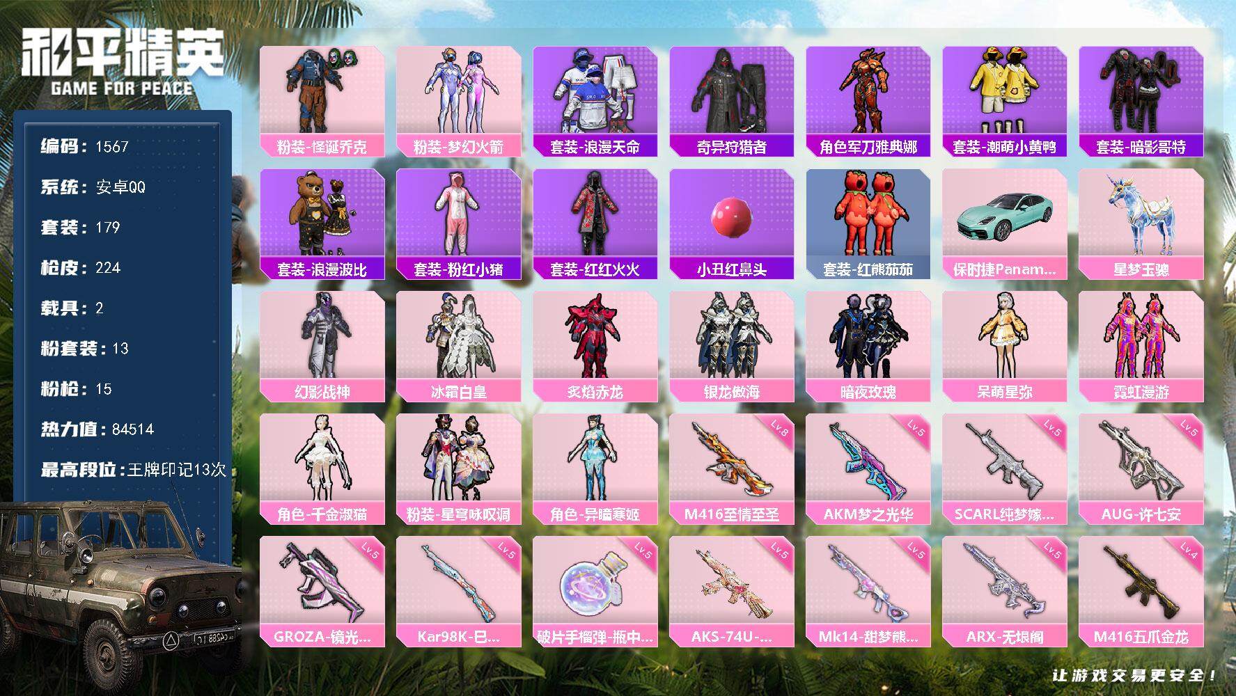 [14003575]安卓 手Q-13粉装-15特效枪-2载具-7粉色飞行器-84514热力值-13王牌印记-179套装-224枪皮 【热门品类】:粉装-怪诞乔克,粉装-梦幻火箭,套装-浪漫天命,套装-奇异狩猎者,角色-军刀雅典娜,套装-潮萌小黄鸭,套装-暗影哥特,套装-浪漫波比,套装-粉红小猪,套装-红红火火,小丑红鼻头,套装-红熊茄茄 【粉色载具】:保时捷Panamera(梦幻青),星梦玉骢 【粉色套装】:粉装-幻影战神,粉装-怪诞乔克,粉装-梦幻火箭,粉装-冰霜白皇,粉装-炙焰赤龙,粉装-银龙傲海,粉装-暗夜玫瑰,角色-呆萌星弥,粉装-霓虹漫游,角色-千金淑猫,粉装-星穹咏叹调,角色-异瞳寒姬 【粉色枪皮等级】:AKM-炫紫旋律(一级),AKM-梦之光华(五级),SCAR-L-桃夭倾城(一级),SCAR-L-纯梦嫁纱(五级),SCAR-L-金蛇镇世(三级),M416-五爪金龙(四级),M416-至情至圣(八级),GROZA-镜光银凌(五级),AUG-许七安(五级),ARX-无垠阁(五级),AKS-74U-星穹咏叹调(五级),Kar98K-巳巳如意(五级),Mk14-甜梦熊击(五级),DP-28-豹影疾电(四级),破片手榴弹-瓶中星球(五级) 【粉色枪皮】:AKM-炫紫旋律,AKM-梦之光华,SCAR-L-桃夭倾城,SCAR-L-纯梦嫁纱,SCAR-L-金蛇镇世,M416-五爪金龙,M416-至情至圣,GROZA-镜光银凌,AUG-许七安,ARX-无垠阁,AKS-74U-星穹咏叹调,Kar98K-巳巳如意,Mk14-甜梦熊击,DP-28-豹影疾电,破片手榴弹-瓶中星球 【粉色飞行器】:酣梦熊熊飞行器,齐天大圣飞行器,青春物语飞行器,冠军兔兔飞行器,英伦信使飞行器,万象金身飞行器 【粉色降落伞】:百万伏特降落伞,粉色回忆降落伞,龙虾霸霸降落伞,相思残雪降落伞,烈焰拳霸降落伞,天之羽翼降落伞,甜梦小狐降落伞,星夜魔法师降落伞,桃夭倾城降落伞,第五大道降落伞,鎏金朋克降落伞,霓虹漫游降落伞,精灵梦叶罗丽降落伞,星梦奇缘降落伞,临安公主降落伞,脆鲨七海降落伞,金蛇镇世降落伞,鬼刀降落伞,星穹咏叹调降落伞 【稀有套装】:套装-绒宝小鹅,套装-巳巳如意,套装-糖糖葫芦,套装-青团波波,套装-棉花软糖,角色-摩登魅猫,角色-许七安,角色-临安公主,角色-怀庆长公主,套装-燕燕于飞,套装-鱼渊荷华