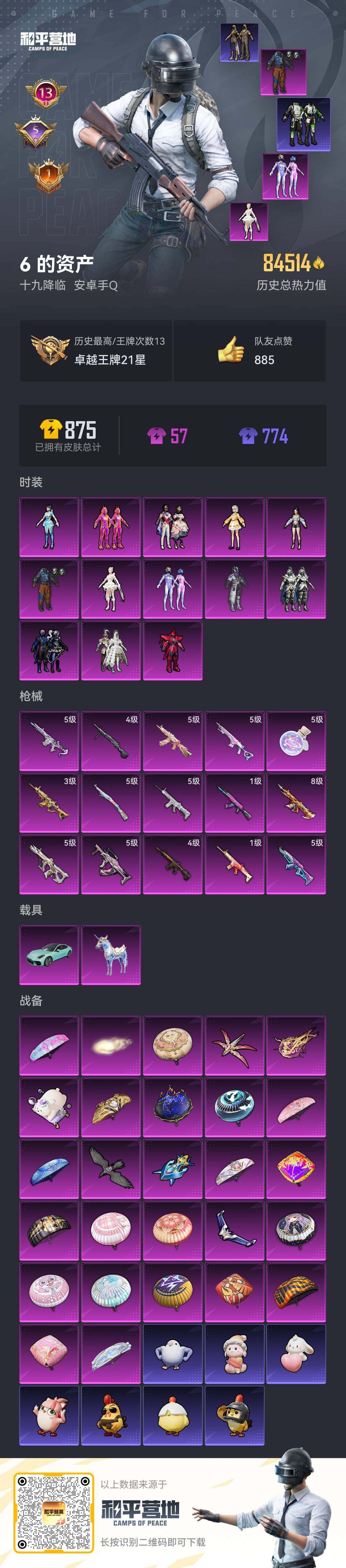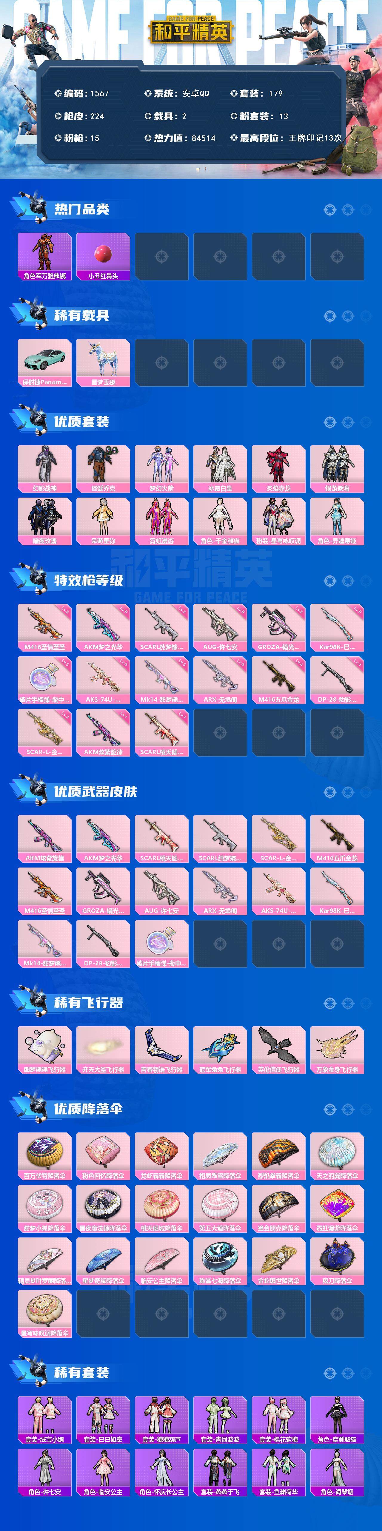 [14003575]安卓 手Q-13粉装-15特效枪-2载具-7粉色飞行器-84514热力值-13王牌印记-179套装-224枪皮