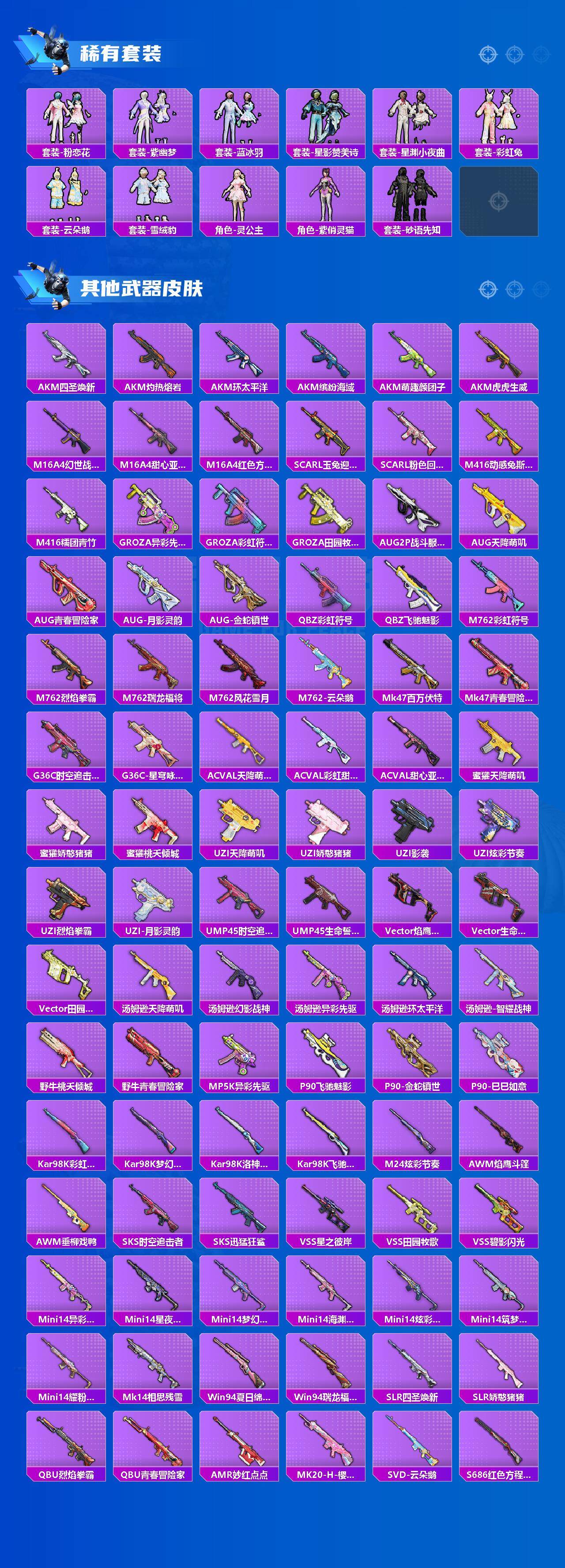 【粉色枪皮】:AKM-炫紫旋律,AKM-梦之光华,SCAR-L-桃夭倾城,SCAR-L-纯梦嫁纱,SCAR-L-金蛇镇世,M416-五爪金龙,M416-至情至圣,GROZA-镜光银凌,AUG-许七安,ARX-无垠阁,AKS-74U-星穹咏叹调,Kar98K-巳巳如意,Mk14-甜梦熊击,DP-28-豹影疾电,破片手榴弹-瓶中星球