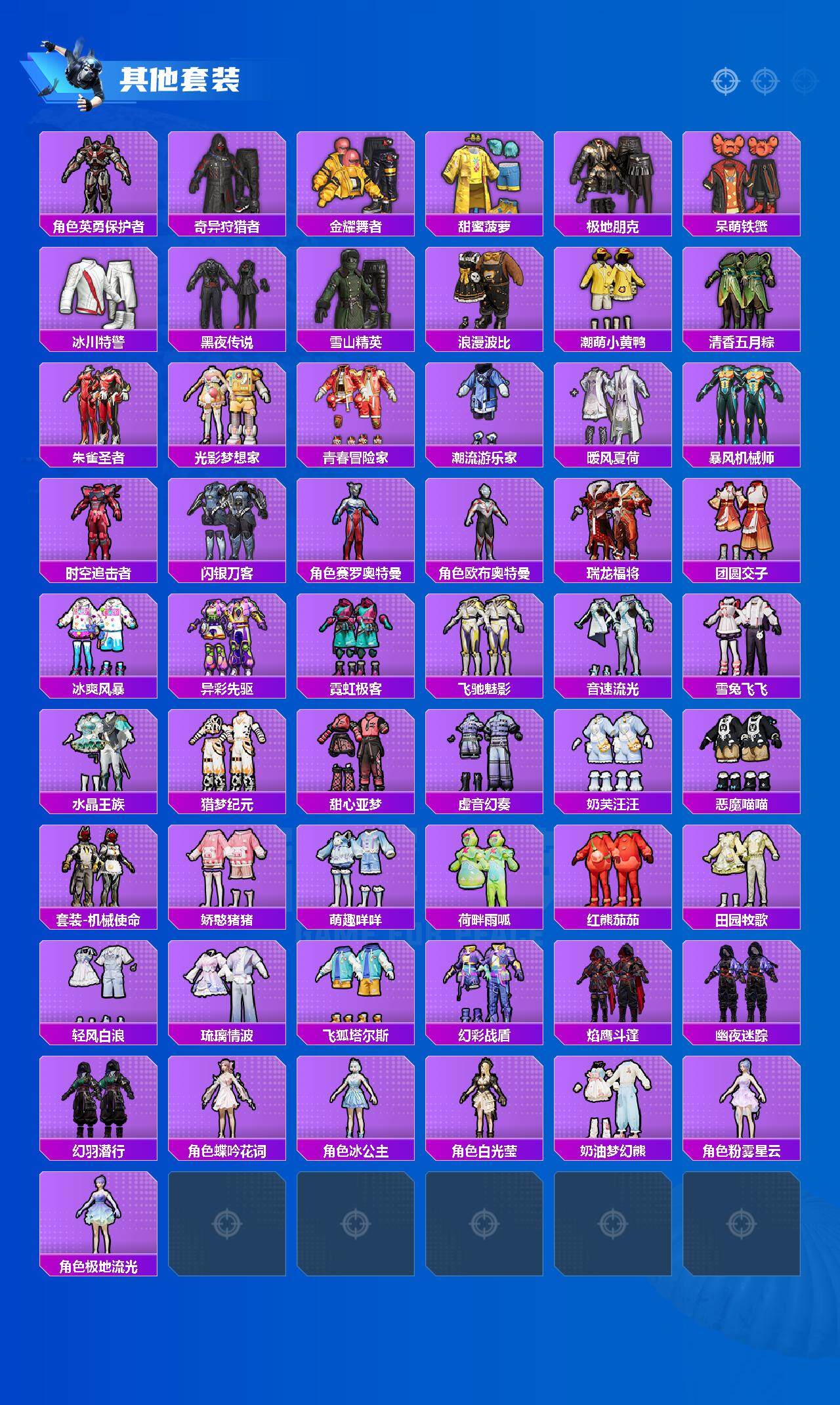 套装-浪漫天命,角色-军刀雅典娜,套装-暗影哥特,套装-粉红小猪,套装-TC追光队服,角色-英勇保护者,套装-雪山精英,套装-朱雀圣者,角色-赛罗奥特曼,套装-瑞龙福将,套装-团圆交子