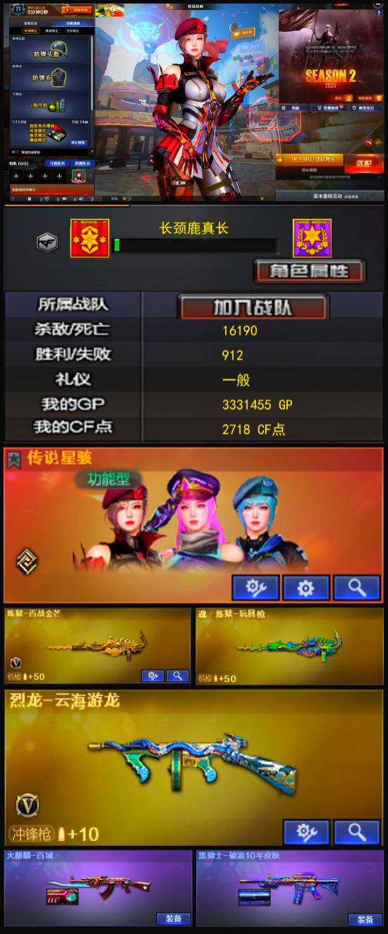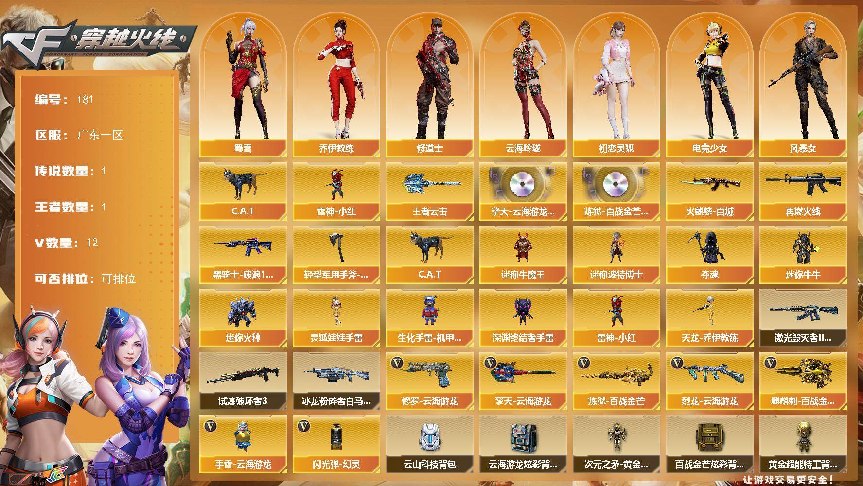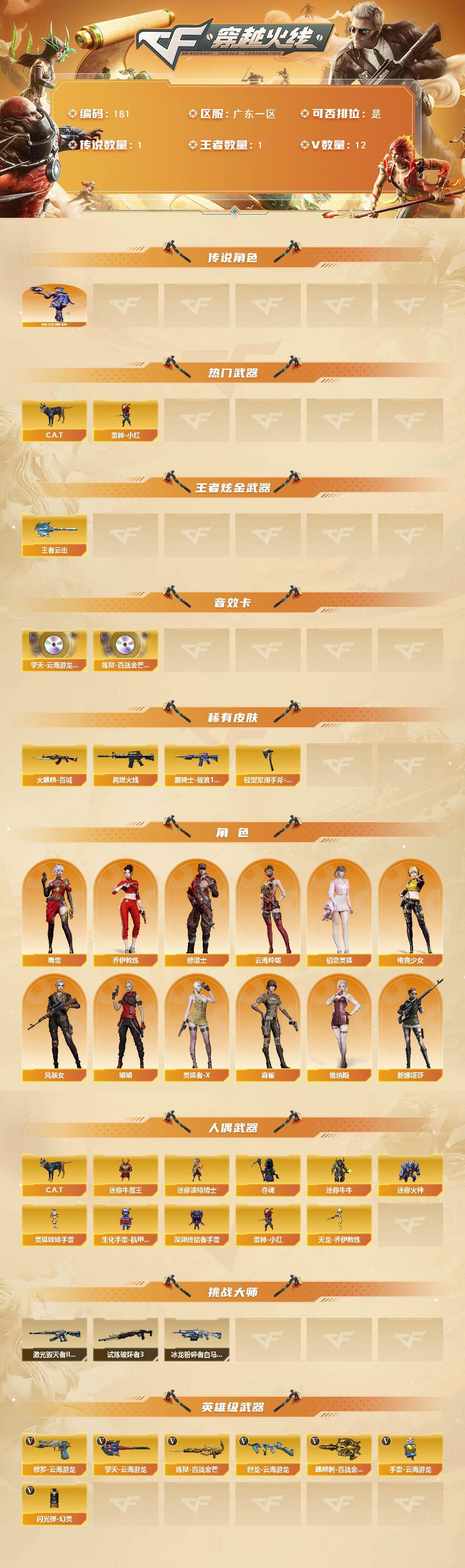 [14005280]广东一区-12V-1王者-0炫金 【传说角色】:传说星骇 【热门武器】:C.A.T,雷神-小红 【王者炫金武器】:王者云击 【音效卡】:擎天-云海游龙音效卡,炼狱-百战金芒-庆典舞曲音效卡 【皮肤】:M4A1-再燃火线,火麒麟-百城,黑骑士-破浪10年皮肤,轻型军用手斧-再燃火线 【角色】:乔伊教练,修道士,云海玲珑,初恋灵狐,电竞少女,风暴女,娟娟,灵狐者-X,麻雀,蜀雪,维纳斯,新娜塔莎 【人偶武器】:雷神-小红,天龙-乔伊教练,C.A.T,迷你牛魔王,迷你波特博士*9,夺魂,迷你牛牛,迷你火种*6,生化手雷-机甲核心,深渊终结者手雷,灵狐娃娃手雷 【挑战大师】:冰龙粉碎者-白马银枪,激光毁灭者III-白马银枪,试炼破坏者III 【英雄级武器】:炼狱-百战金芒,烈龙-云海游龙,修罗-云海游龙,擎天-云海游龙,麒麟刺-百战金芒,手雷-云海游龙,闪光弹-幻灵*2 【道具】:云山科技背包,云海游龙炫彩背包,次元之矛-黄金背包,百战金芒炫彩背包,黄金超能特工背包,女皇终结者-魔龙之吻,绿色巨人,灵魂忍者,迷雾幽灵,夺命之镰,防化服*3,金色流光-枪王排位,语音特效-盛典烟火,语音特效-机器人,萌萌小葵表情,云海游龙表情,防弹头盔*3,防弹衣*3,C4工具钳*3,手雷包*3 【特殊枪械】: