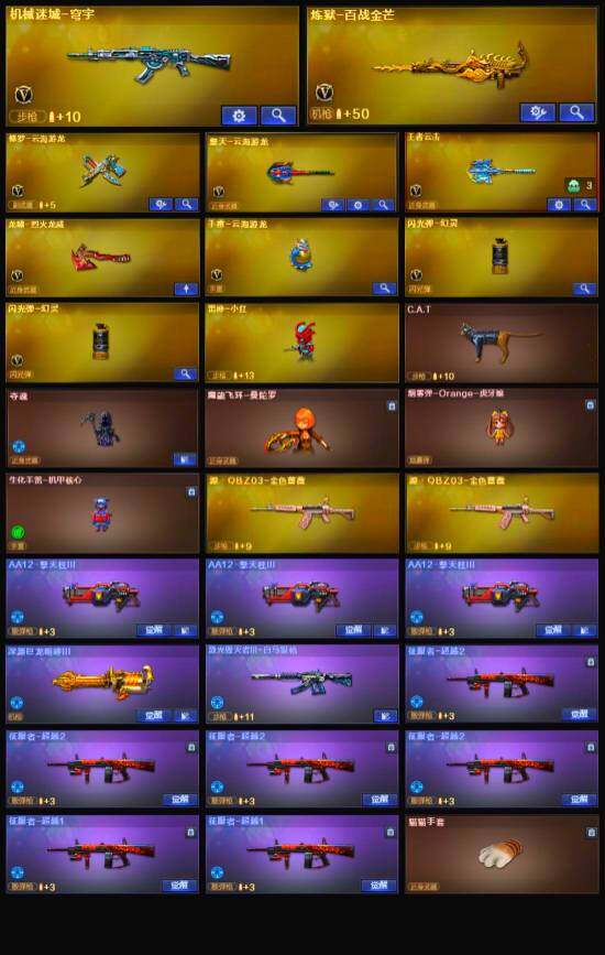 【英雄级武器】:炼狱-百战金芒,烈龙-云海游龙,修罗-云海游龙,擎天-云海游龙,麒麟刺-百战金芒,手雷-云海游龙,闪光弹-幻灵*2
