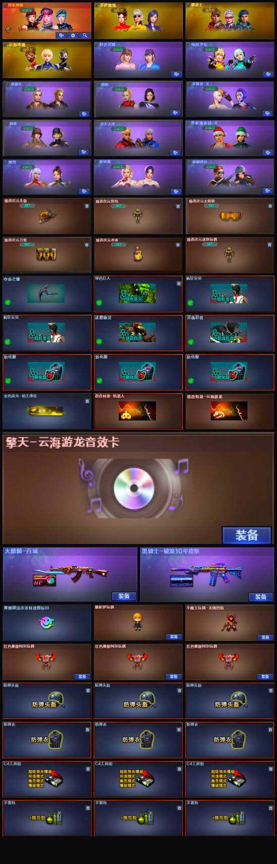 【道具】:云山科技背包,云海游龙炫彩背包,次元之矛-黄金背包,百战金芒炫彩背包,黄金超能特工背包,女皇终结者-魔龙之吻,绿色巨人,灵魂忍者,迷雾幽灵,夺命之镰,防化服*3,金色流光-枪王排位,语音特效-盛典烟火,语音特效-机器人,萌萌小葵表情,云海游龙表情,防弹头盔*3,防弹衣*3,C4工具钳*3,手雷包*3