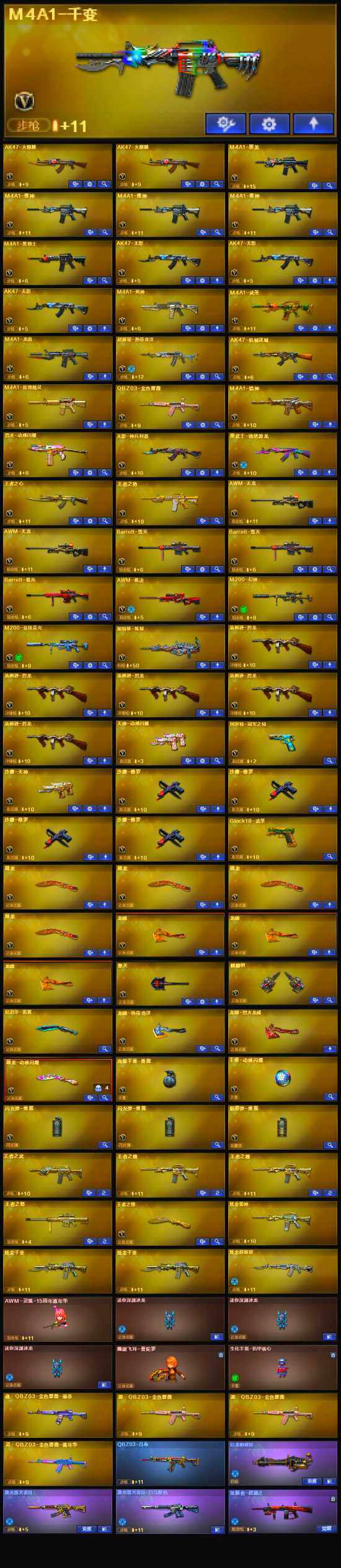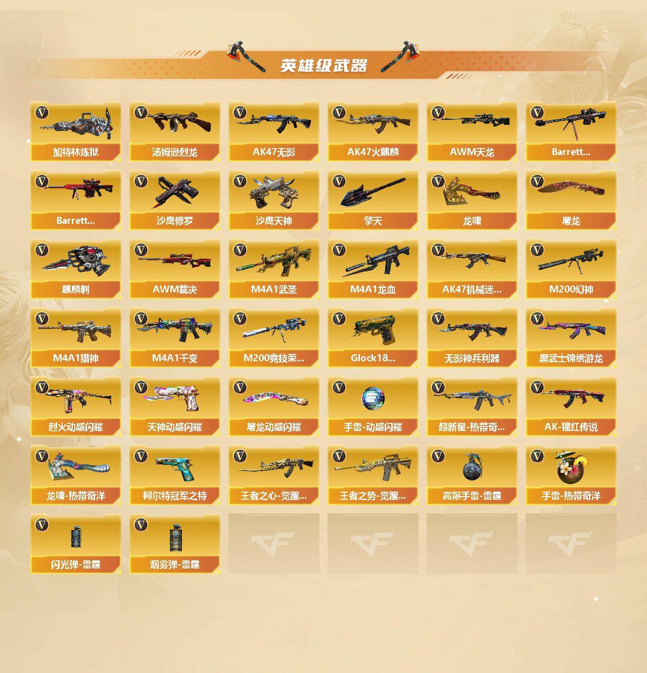 【英雄级武器】:M4A1-千变,AK47-火麒麟*2,M4A1-黑龙,M4A1-雷神*3,M4A1-黑骑士,AK47-无影*3,M4A1-死神,M4A1-武圣,AK47-机械迷城,M4A1-龙血,无影-神兵利器,黑武士-锦绣游龙,超新星-热带奇洋,M4A1-玫瑰精灵,QBZ03-金色蔷薇,M4A1-猎神,烈火-动感闪耀,王者之心-觉醒版,王者之势-觉醒版,AK-47-猩红传说,AWM-天龙*2,Barrett-毁灭*2,Barrett-极光,AWM-裁决,M200-幻神,M200-竞技荣光,加特林-炼狱,汤姆逊-烈龙*5,沙鹰-修罗*4,沙鹰-天神,柯尔特-冠军之特,Glock18-武圣,天神-动感闪耀,屠龙*4,龙啸*3,擎天,麒麟