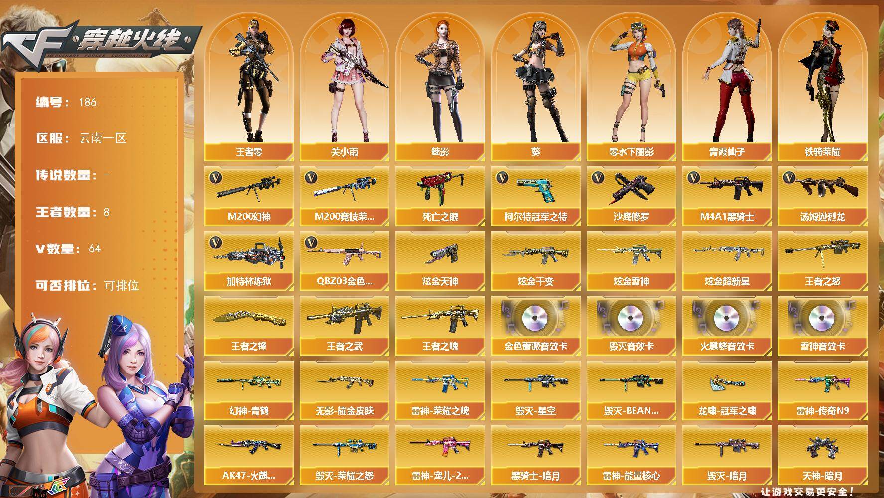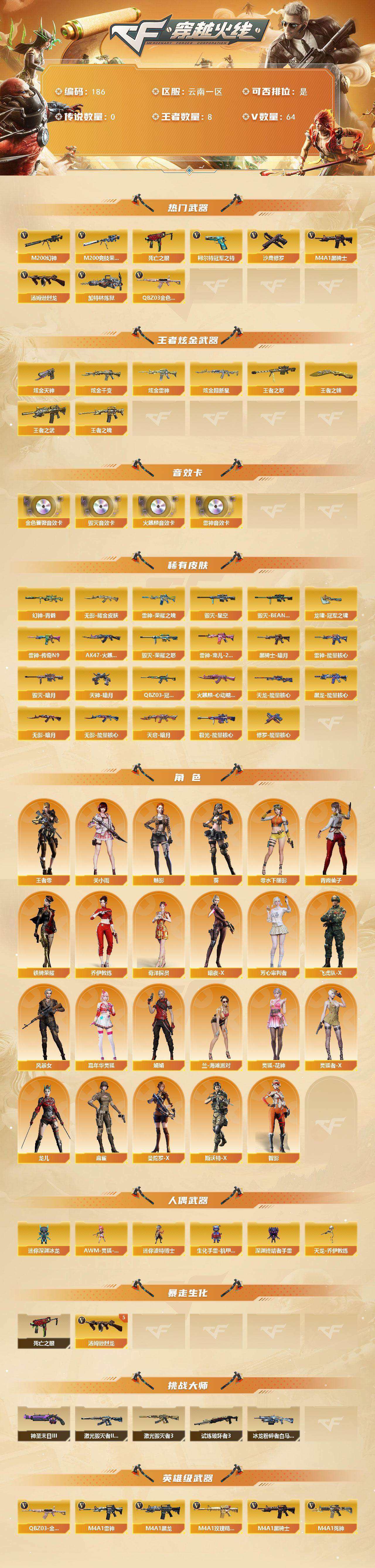 [14005920]云南一区-64V-8王者-5炫金 【热门武器】:QBZ03-金色蔷薇,M200-幻神,M200-竞技荣光,死亡之眼*3,柯尔特-冠军之特,M4A1-黑骑士,汤姆逊-烈龙*5,加特林-炼狱,沙鹰-修罗*4 【王者炫金武器】:王者之武,王者之魄*2,王者之怒,王者之锋,炫金千变*2,炫金雷神,炫金超新星,炫金天神 【音效卡】:AK47-火麒麟音效卡,M4A1-雷神音效卡,Barrett-毁灭音效卡,QBZ03-金色蔷薇音效卡 【皮肤】:幻神-青鹤,QBZ03-冠军之薇,雷神-能量核心,雷神-荣耀之魄,雷神-传奇N9,雷神-宠儿-2019MVP,AK47-火麒麟-传奇EVEN,火麒麟-心动糖果,毁灭-暗月*3,毁灭-荣耀之怒,毁灭-星空,毁灭-BEAN-2020MVP,黑龙-能量核心,黑骑士-暗月*8,无影-暗月,无影-能量核心,无影耀金皮肤,天启-暗月*4,天龙-能量核心,极光-能量核心,修罗-能量核心,天神-暗月*2,龙啸-冠军之啸 【角色】:葵,魅影,关小雨,王者-零,奇洋探员,乔伊教练,暗夜-X,芳心审判者,飞虎队-X,风暴女,嘉年华灵狐,娟娟,兰-海滩派对,零-水下丽影,灵狐-花神,灵狐者-X,龙儿,麻雀,曼陀罗-X,青霞仙子,斯沃特-X,铁骑荣耀,智影 【人偶武器】:天龙-乔伊教练,AWM-灵狐-15周年嘉年华,迷你深渊冰龙*3,迷你波特博士,生化手雷-机甲核心,深渊终结者手雷 【暴走生化】:死亡之眼*3 【挑战大师】:冰龙粉碎者-白马银枪,激光毁灭者III-白马银枪,激光毁灭者III,试炼破坏者III,神圣爆裂者-末日III 【英雄级武器】:M4A1-千变,AK47-火麒麟*2,M4A1-黑龙,M4A1-雷神*3,M4A1-黑骑士,AK47-无影*3,M4A1-死神,M4A1-武圣,AK47-机械迷城,M4A1-龙血,无影-神兵利器,黑武士-锦绣游龙,超新星-热带奇洋,M4A1-玫瑰精灵,QBZ03-金色蔷薇,M4A1-猎神,烈火-动感闪耀,王者之心-觉醒版,王者之势-觉醒版,AK-47-猩红传说,AWM-天龙*2,Barrett-毁灭*2,Barrett-极光,AWM-裁决,M200-幻神,M200-竞技荣光,加特林-炼狱,汤姆逊-烈龙*5,沙鹰-修罗*4,沙鹰-天神,柯尔特-冠军之特,Glock18-武圣,天神-动感闪耀,屠龙*4,龙啸*3,擎天,麒麟