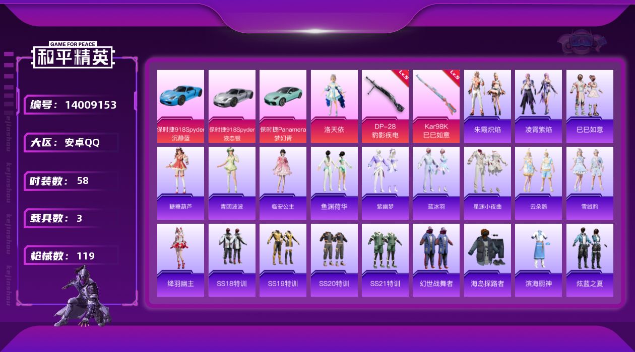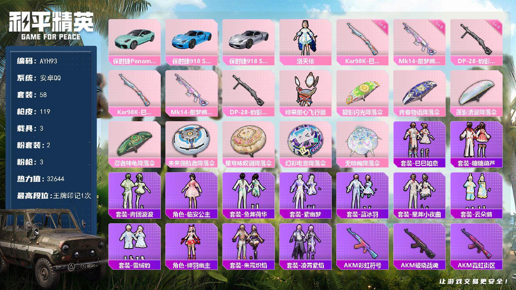[14009153]可二次,【店主推荐捡漏号!可直接换绑】安卓 手Q-2粉装-3特效枪-3载具-2粉色飞行器-32644热力值-1王牌印记-58套装-119枪皮【粉色载具】:保时捷Panamera(梦幻青),保时捷918 Spyder(沉静蓝),保时捷918 Spyder(液态银)【粉色套装】:角色-洛天依【粉色枪皮等级】:Kar98K-巳巳如意(五级),Mk14-甜梦熊击(五级),DP-28-豹影疾电(五级)【粉色枪皮】:Kar98K-巳巳如意,Mk14-甜梦熊击,DP-28-豹影疾电【粉色飞行器】:绯果甜心飞行器