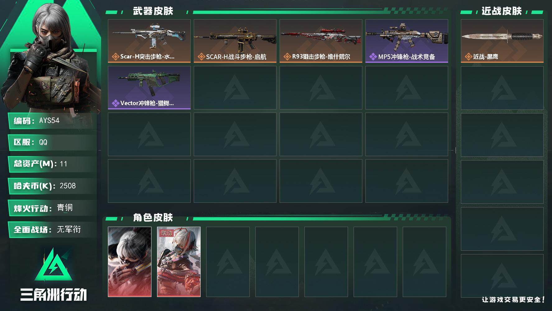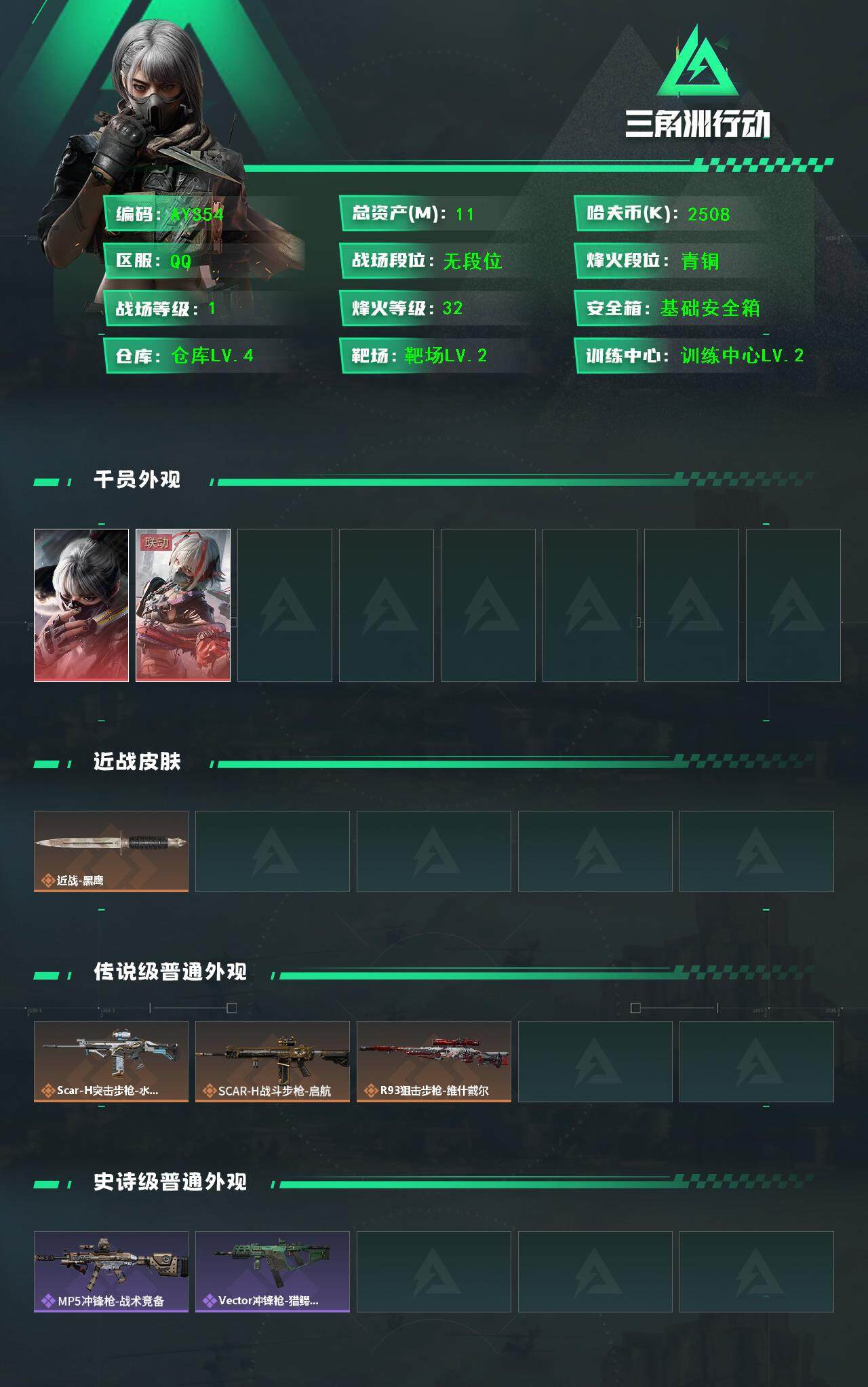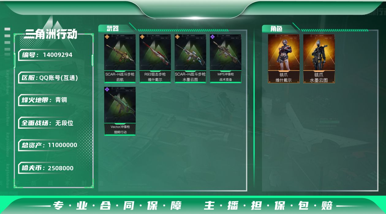 [14009294]【店主推荐捡漏号!可直接换绑】 2508k哈伏币-11m流动资产-32烽火等级-青铜-1战场等级-无军衔 【干员外观】:骇爪-水墨云图,骇爪-维什戴尔 【近战皮肤】:近战-黑鹰 【传说级普通外观】:SCAR-H战斗步枪-水墨云图,SCAR-H战斗步枪-启航,R93狙击步枪-维什戴尔 【史诗级普通外观】:MP5冲锋枪-战术竞备,Vector冲锋枪-猎鳄行动 【稀有级普通外观】:SR-25射手步枪-开拓 【普通级普通外观】:M4A1突击步枪-高雅黑,M4A1突击步枪-海色,QBZ95-1突击步枪-海浪,SCAR-H战斗步枪-数码迷彩,M1014霰弹枪-高雅黑,M249轻机枪-黄蜂 【军牌】:军牌-装备修理,军牌-静谧时光,军牌-修整,军牌-神秘艺术,军牌-信誉优秀 【挂饰】:挂饰-维什戴尔,挂饰-诡影狙击兵,挂饰-诡影喷火兵,挂饰-暗行哨兵,挂饰-启程