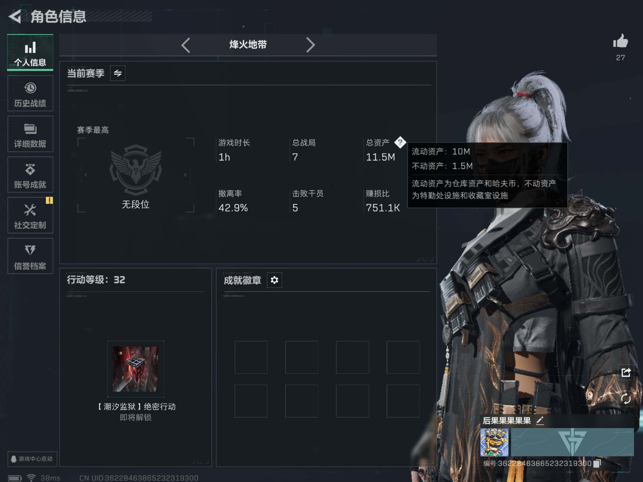 2508k哈伏币-11m流动资产-32烽火等级-青铜-1战场等级-无军衔
