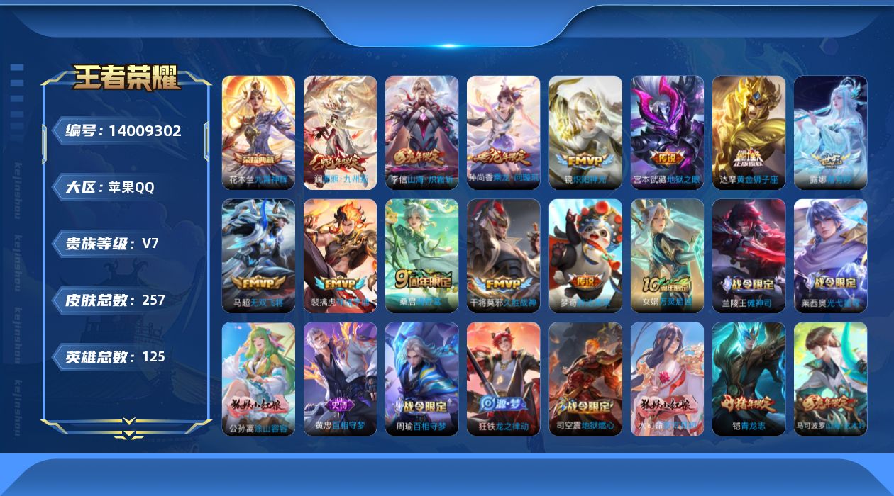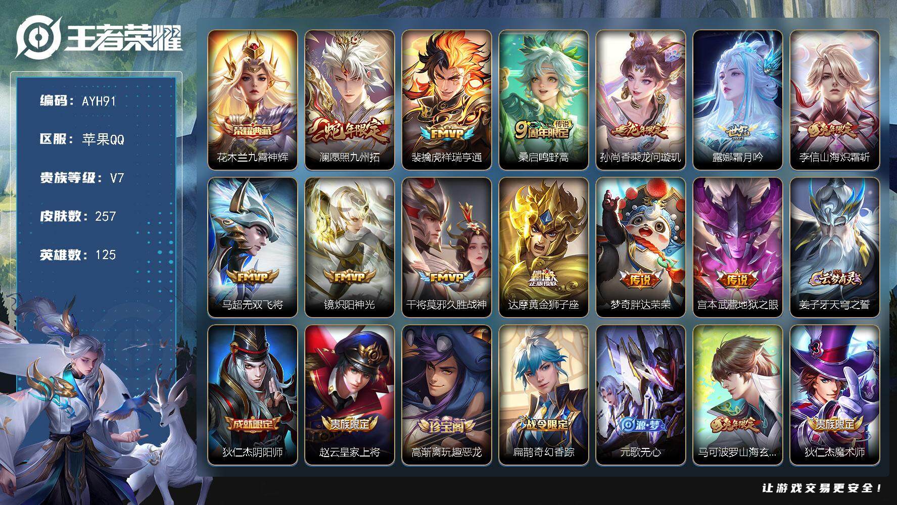 [14009302]可二次,【店主推荐捡漏号!可直接换绑】苹果Q-V7-最强王者段位-125英雄-257皮肤-1典藏-12传说-74史诗