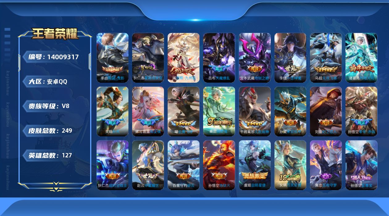 [14009317]可二次,【店主推荐捡漏号!可直接换绑】安卓Q-V8-最强王者段位-127英雄-249皮肤-1典藏-20传说-75史诗 【英雄全皮】:孙权全皮,鬼谷子全皮 【荣耀典藏】:李白鸣剑曳影 【传说皮肤】:后羿神树通天,澜愿照九州拓,桑启鸣野蒿,百里守约碎云,娜可露露前尘镜,马超无双飞将,女娲补天,孙策末日机甲,赵云淬星耀世,诸葛亮时雨天司,虞姬启明星使,孙悟空零号赤焰,曜云鹰飞将,李信一念神魔,刘备时之恋人,干将莫邪久胜战神,宫本武藏地狱之眼,孙悟空地狱火,吕布天魔缭乱,狄仁杰超时空战士 【限定皮肤】:蒙犽顽岩魄,姜子牙天穹之誓,杨戬破阵退雄兵,狄仁杰阴阳师,赵云皇家上将,墨子神迹守卫,嬴政优雅恋人,鲁班七号乒乒小将,芈月幻夜卜梦,吕布天魔缭乱,元歌无心,狄仁杰魔术师,达摩沙漠行僧,项羽海滩派对,老夫子醍醐杖,老夫子航海奇遇记,王昭君午后时光,兰陵王金庭之子,娜可露露前尘镜,孙悟空至尊宝,孙悟空大圣娶亲,孙悟空零号赤焰,后羿圣弓游侠,李元芳云中旅人,虞姬启明星使,钟馗驱傩正仪,女娲补天,干将莫邪冰霜恋舞曲,干将莫邪真爱魔法,鬼谷子原初探秘者,鬼谷子五谷丰年,诸葛亮时雨天司,黄忠火炮绅士,苏烈千军破阵,沈梦溪大漠名商,裴擒虎李小龙,裴擒虎擒涛扼浪,狂铁电玩高手,上官婉儿梁祝,嫦娥拒霜思,西施玲珑珍味,鲁班大师探海日志,桑启海盐诗旅,戈娅驭风魔法,艾琳流音漫舞,司空震地狱燃心,阿古朵江河有灵,张良古海寻踪,蒙犽百解令,鬼谷子天穹祈灯,姬小满妄想食味,沈梦溪龙舞盛年,刘邦剑破天穹,程咬金群星魔术团,周瑜熔金海岸 【年限皮肤】:诸葛亮时雨天司 【赛季限定】:达摩沙漠行僧,老夫子醍醐杖,兰陵王金庭之子,张良古海寻踪,李元芳云中旅人,钟馗驱傩正仪,鬼谷子原初探秘者,苏烈千军破阵,沈梦溪大漠名商,裴擒虎擒涛扼浪,鲁班大师探海日志,桑启海盐诗旅,鬼谷子天穹祈灯,刘邦剑破天穹,姜子牙天穹之誓 【战令限定】:墨子神迹守卫,芈月幻夜卜梦,老夫子航海奇遇记,王昭君午后时光,艾琳流音漫舞,后羿圣弓游侠,干将莫邪真爱魔法,黄忠火炮绅士,狂铁电玩高手,西施玲珑珍味,司空震地狱燃心,戈娅驭风魔法 【史诗皮肤】:露娜紫霞仙子,赵云皇家上将,赵云未来纪元,貂蝉圣诞恋歌,甄姬冰雪圆舞曲,王昭君偶像歌手,狄仁杰魔术师,廉颇地狱岩魂,宫本武藏鬼剑武藏,孙尚香水果甜心,嬴政优雅恋人,嬴政暗夜贵公子,嬴政摇滚巨星,妲