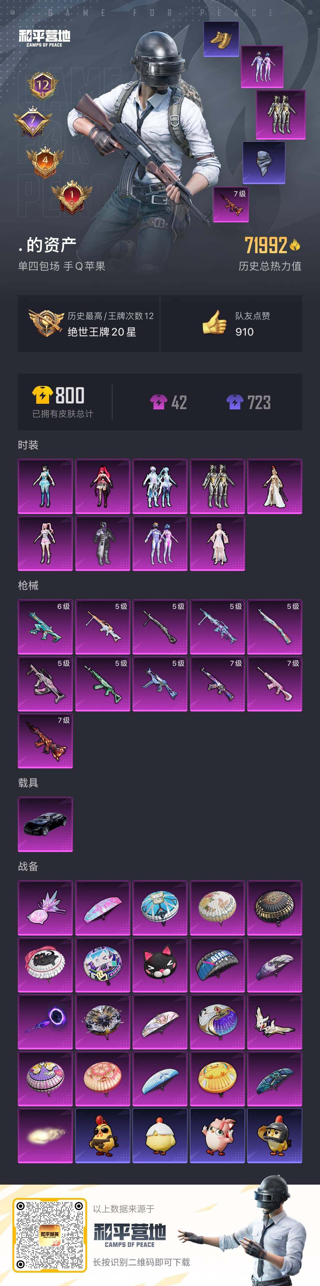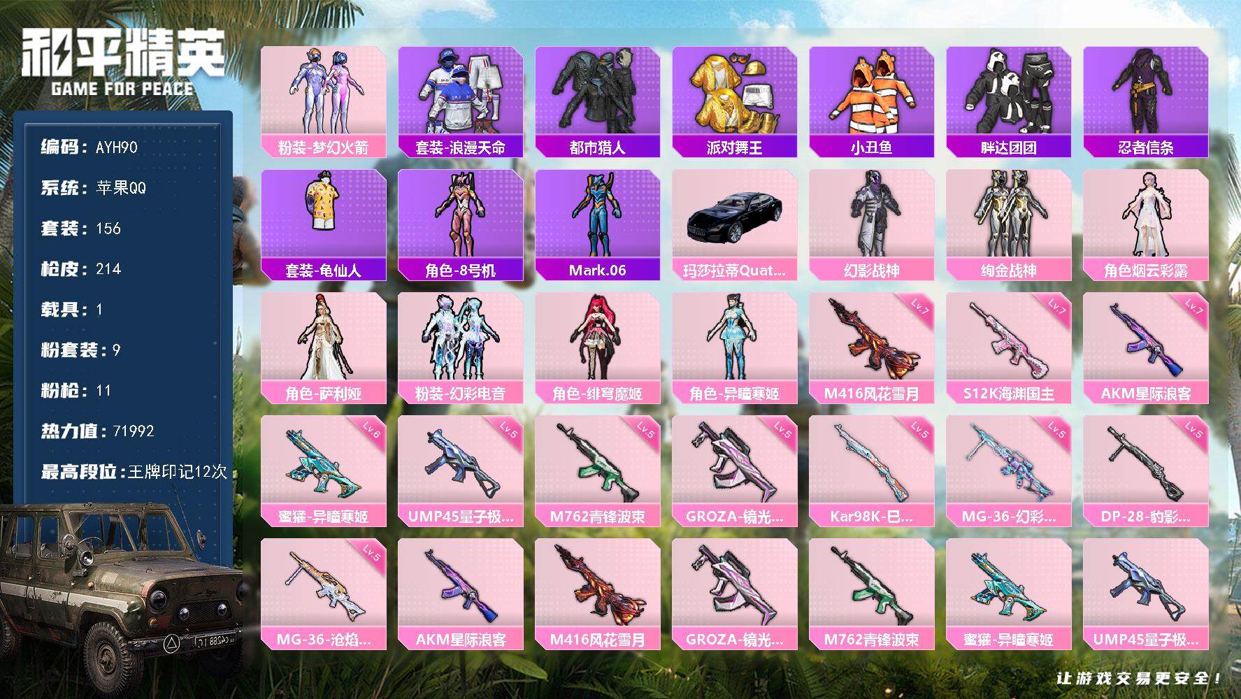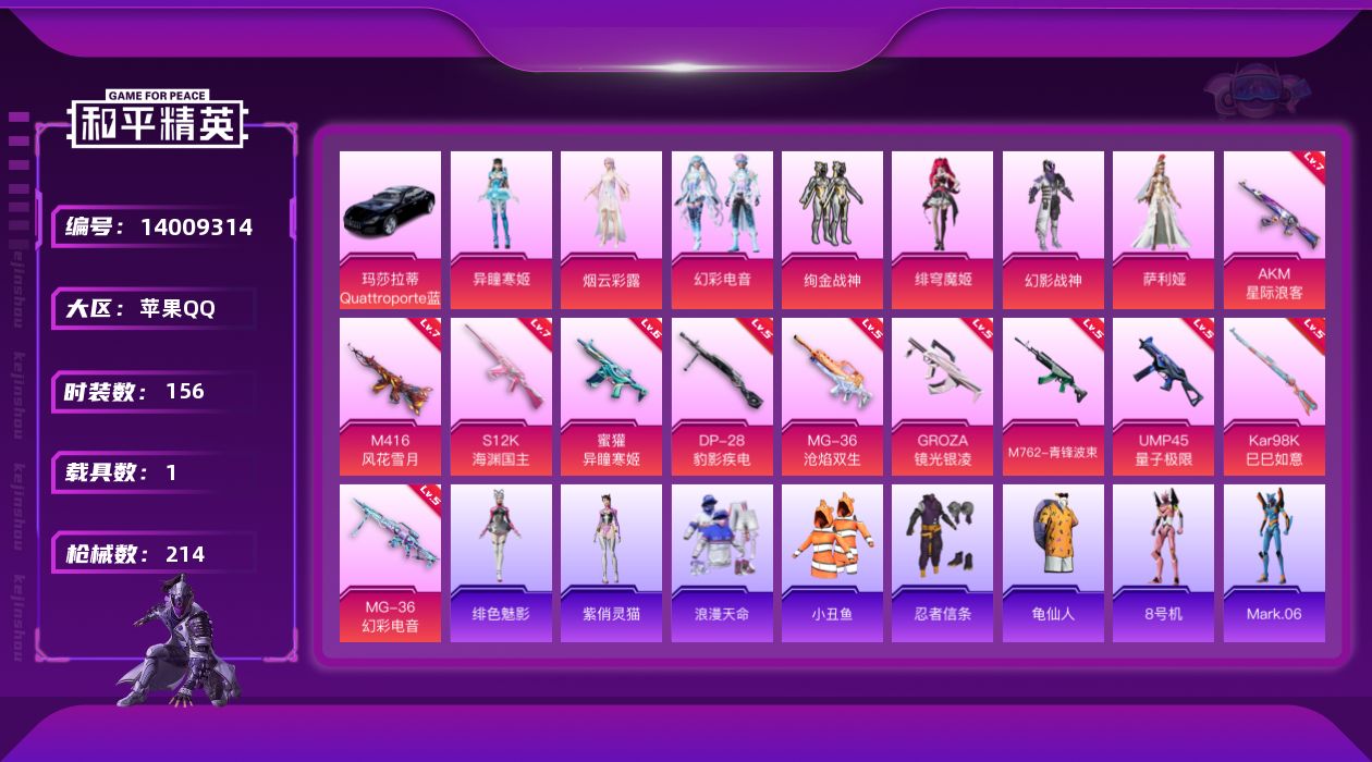 - PX_2102958- 苹果手Q-25王牌印记-有战神框-8粉装-10特效枪-1载具-热力值-240套装-328枪皮-6卓越印记-3传奇印记 【8粉装】,雪国幻梦,缤纷油彩,洛天依,绯穹魔姬,白兰星,莲影清波,水仙星,星之彼岸 【10特效枪】AKM-炫紫旋律-7级 M16A4-垂柳戏鸭-5级 SCAR-L-机甲封神-7级 M416-心之恋语-7级 GROZA-香水柠檬-7级 GROZA-旋转彩虹-