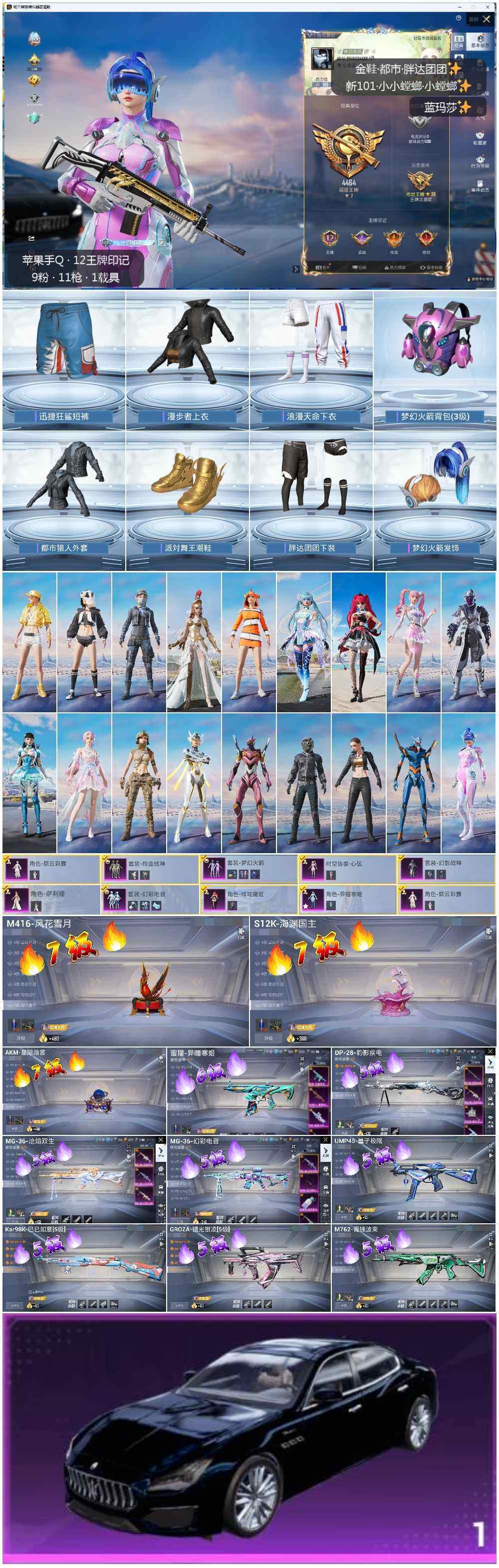 [14009314]地铁满天赋【店主推荐捡漏号!可直接换绑】苹果 手Q-9粉装-11特效枪-1载具-4粉色飞行器-71992热力值-12王牌印记-156套装-214枪皮【热门品类】:粉装-梦幻火箭,套装-浪漫天命,套装-都市猎人,套装-派对舞王,套装-小丑鱼,套装-胖达团团,套装-忍者信条,套装-龟仙人,角色-8号机,角色-Mark.06【粉色载具】:玛莎拉蒂Quattroporte(夜幕蓝)【粉色套装】:粉装-幻影战神,粉装-梦幻火箭,粉装-绚金战神,角色-烟云彩露,角色-萨利娅,粉装-幻彩电音,角色-绯穹魔姬,角色-异瞳寒姬【粉色枪皮等级】:AKM-星际浪客(七级),M416-风花雪月(七级),GROZA-镜光银凌(五级),M762-青锋波束(五级),蜜獾-异瞳寒姬(六级),UMP45-量子极限(五级),Kar98K-巳巳如意(五级),S12K-海渊国主(七级),DP-28-豹影疾电(五级),MG-36-幻彩电音(五级),MG-36-沧焰双生(五级)【粉色枪皮】:AKM-星际浪客,M416-风花雪月,GROZA-镜光银凌,M762-青锋波束,蜜獾-异瞳寒姬,UMP45-量子极限,Kar98K-巳巳如意,S12K-海渊国主,DP-28-豹影疾电,MG-36-幻彩电音,MG-36-沧焰双生【粉色飞行器】:齐天大圣飞行器,星空武士飞行器,深渊漩涡飞行器