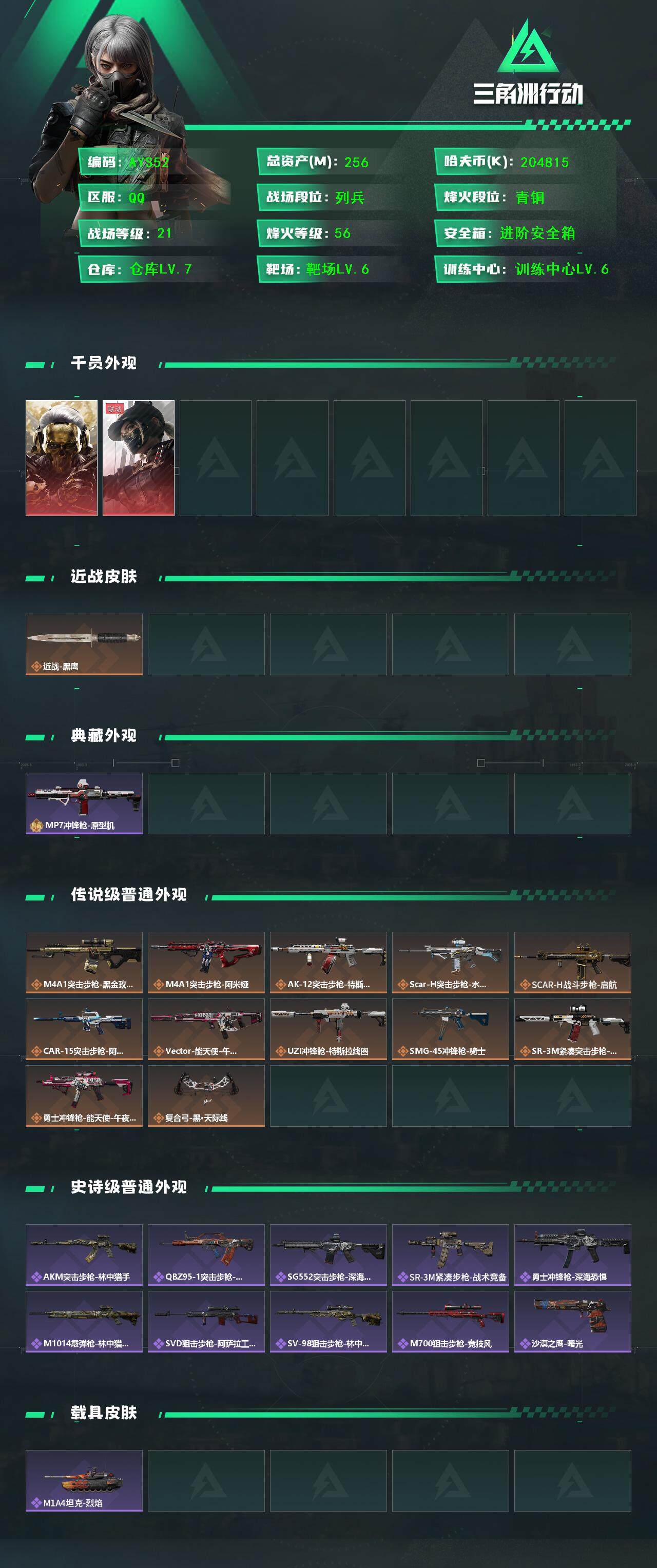 [14009415]【店主推荐捡漏号!可直接换绑】204815k哈伏币-256m流动资产-56烽火等级-青铜-21战场等级-列兵 【干员外观】:红狼-蚀金玫瑰,露娜-黑·天际线 【近战皮肤】:近战-黑鹰 【典藏外观】:MP7冲锋枪-原型机 【传说级普通外观】:M4A1突击步枪-蚀金玫瑰,M4A1突击步枪-阿米娅,AK-12突击步枪-特斯拉线圈,SCAR-H战斗步枪-水墨云图,SCAR-H战斗步枪-启航,CAR-15突击步枪-阿米娅,Vector冲锋枪-能天使-午夜邮差,UZI冲锋枪-特斯拉线圈,SMG-45冲锋枪-骑士,SR-3M紧凑突击步枪-特斯拉线圈,勇士冲锋枪-能天使-午夜邮差,复合弓-黑·天际线 【史诗级普通外观】:AKM突击步枪-林中猎手,QBZ95-1突击步枪-曙光,SG552突击步枪-深海恐惧,SR-3M紧凑突击步枪-战术竞备,勇士冲锋枪-深海恐惧,M1014霰弹枪-林中猎手,SVD狙击步枪-阿萨拉工艺,SV-98狙击步枪-林中猎手,M700狙击步枪-竞技风,沙漠之鹰-曙光 【稀有级普通外观】:SCAR-H战斗步枪-荣耀列队,PTR-32突击步枪-天网,MP5冲锋枪-弄臣,P90冲锋枪-新生,Vector冲锋枪-先锋,SMG-45-行动开启,SMG-45冲锋枪-幻影结构,SMG-45冲锋枪-天网,MP7冲锋枪-幻影结构,M1014霰弹枪-幻影结构,M1014霰弹枪-童趣,M250通用机枪-天网,Mini-14射手步枪-荣耀列队,VSS射手步枪-童趣,SKS射手步枪-弄臣,SR-25射手步枪-开拓 【普通级普通外观】:M4A1突击步枪-粉色涂装,M4A1突击步枪-高雅黑,M4A1突击步枪-海色,QBZ95-1突击步枪-高雅黑,QBZ95-1突击步枪-海浪,QBZ95-1突击步枪-海色,QBZ191突击步枪-三角洲力量,K416突击步枪-几何迷彩,K416突击步枪-高雅黑,M16A4突击步枪-山林猎人,AUG突击步枪-浅蓝涂装,SG552突击步枪-浅蓝涂装,SG552突击步枪-海浪,AK-12突击步枪-落花,SCAR-H战斗步枪-红色涂装,SCAR-H战斗步枪-数码迷彩,G3战斗步枪-高雅黑,PTR-32突击步枪-黄蜂,MP5冲锋枪-海色,MP5冲锋枪-黄蜂,Vector冲锋枪-几何迷彩,UZI冲锋枪-海色,M1014霰弹枪-高雅黑,M1014霰弹枪-海浪,PKM通用机枪-
