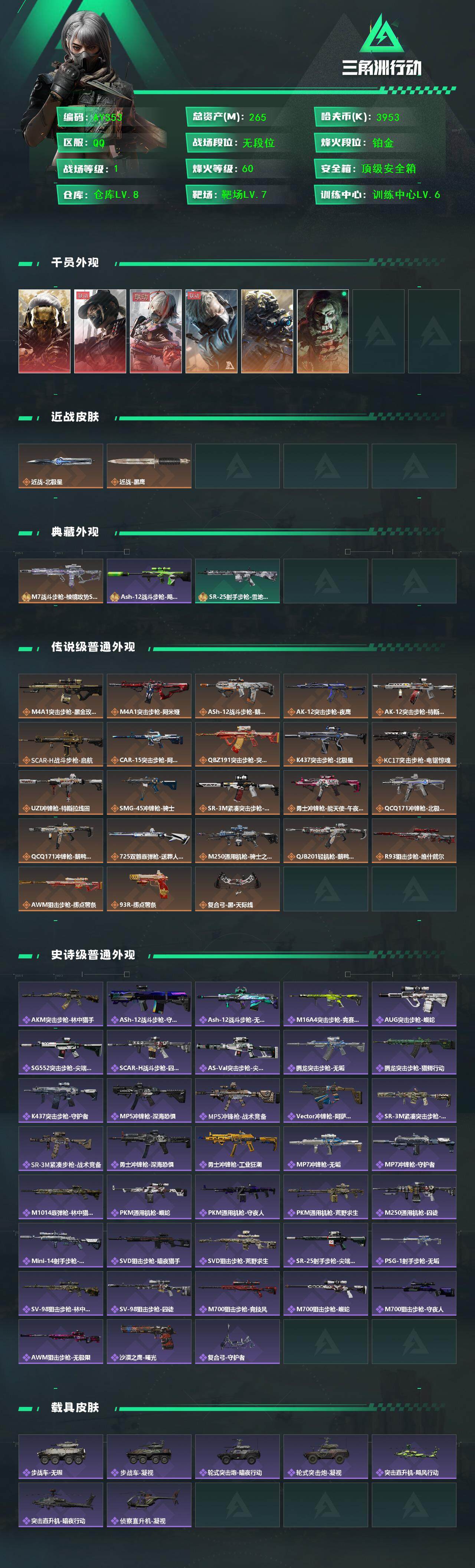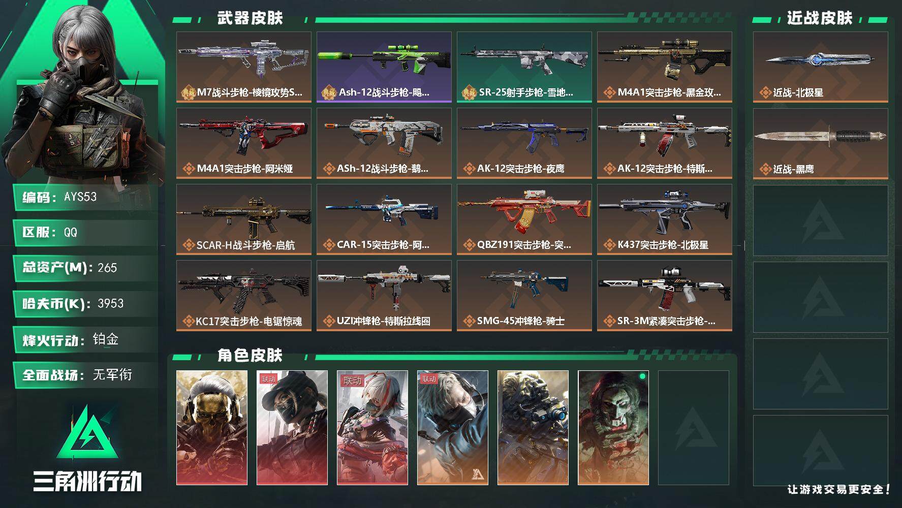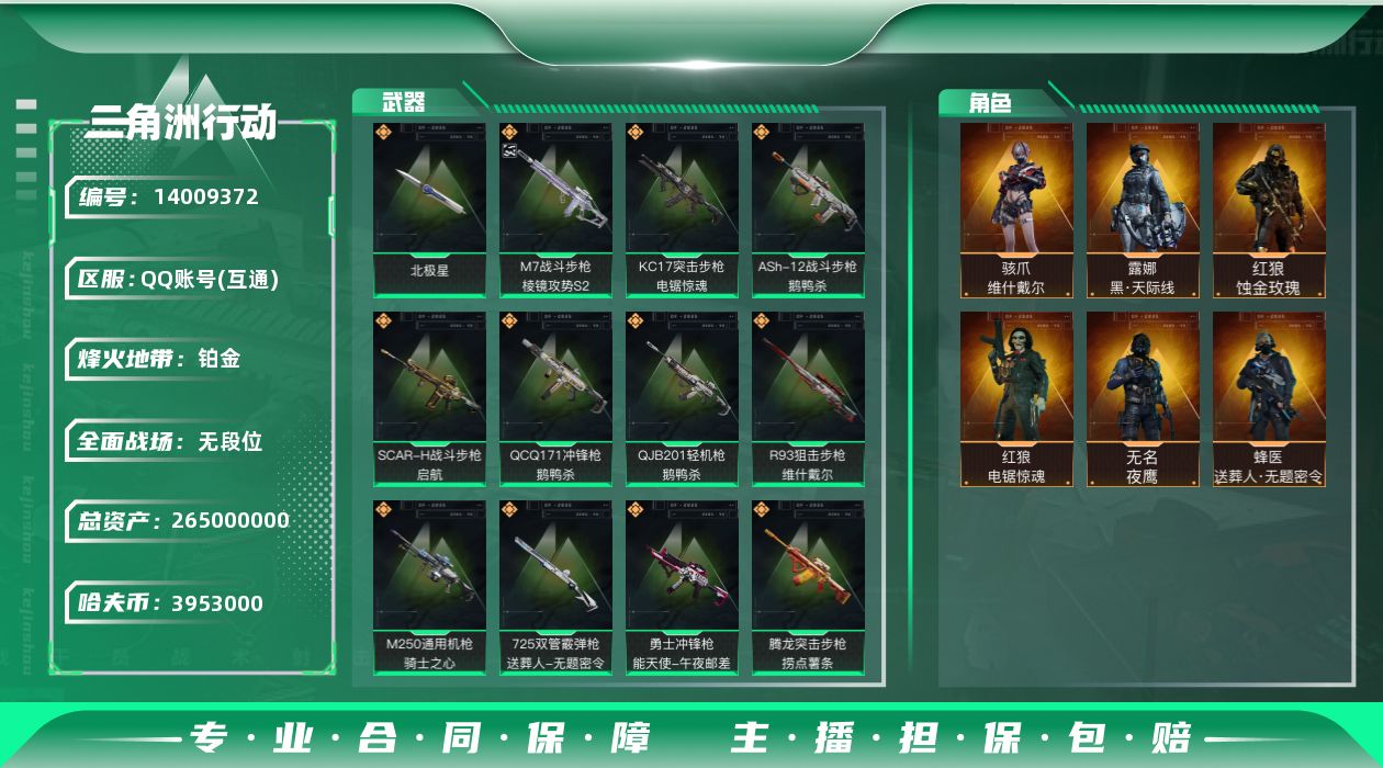 [14009372]可二次【店主推荐捡漏号!可直接换绑】3953k哈伏币-265m流动资产-60烽火等级-铂金-1战场等级-无军衔 【干员外观】:红狼-蚀金玫瑰,露娜-黑·天际线,骇爪-维什戴尔,蜂医-送葬人·无题密令,无名-夜鹰,红狼-电锯惊魂 【近战皮肤】:近战-北极星,近战-黑鹰 【典藏外观】:M7战斗步枪-棱镜攻势S2,Ash-12战斗步枪-飓风行动,SR-25射手步枪-雪地迷彩 【传说级普通外观】:M4A1突击步枪-蚀金玫瑰,M4A1突击步枪-阿米娅,ASh-12战斗步枪-鹅鸭杀,AK-12突击步枪-夜鹰,AK-12突击步枪-特斯拉线圈,SCAR-H战斗步枪-启航,CAR-15突击步枪-阿米娅,腾龙突击步枪-捞点薯条,K437突击步枪-北极星,KC17突击步枪-电锯惊魂,UZI冲锋枪-特斯拉线圈,SMG-45冲锋枪-骑士,SR-3M紧凑突击步枪-特斯拉线圈,勇士冲锋枪-能天使-午夜邮差,QCQ171冲锋枪-北极星,QCQ171冲锋枪-鹅鸭杀,725双管霰弹枪-送葬人-无题密令,M250通用机枪-骑士之心,QJB201轻机枪-鹅鸭杀,R93狙击步枪-维什戴尔,AWM狙击步枪-捞点薯条,93R-捞点薯条,复合弓-黑·天际线 【史诗级普通外观】:AKM突击步枪-林中猎手,ASh-12战斗步枪-守夜人,ASh-12战斗步枪-无极限,M16A4突击步枪-竞赛选手,AUG突击步枪-蝮蛇,SG552突击步枪-尖端治疗,SCAR-H战斗步枪-囚徒,AS Val突击步枪-尖端治疗,腾龙突击步枪-无垢,腾龙突击步枪-猎鳄行动,K437突击步枪-守护者,MP5冲锋枪-深海恐惧,MP5冲锋枪-战术竞备,Vector冲锋枪-阿萨拉文明,SR-3M紧凑突击步枪-荒野求生,SR-3M紧凑突击步枪-战术竞备,勇士冲锋枪-深海恐惧,勇士冲锋枪-工业狂潮,MP7冲锋枪-无垢,MP7冲锋枪-守护者,M1014霰弹枪-林中猎手,PKM通用机枪-蝮蛇,PKM通用机枪-守夜人,PKM通用机枪-荒野求生,M250通用机枪-囚徒,Mini-14射手步枪-守护者,SVD狙击步枪-暗夜猎手,SVD狙击步枪-荒野求生,SR-25射手步枪-尖端治疗,PSG-1射手步枪-无垢,SV-98狙击步枪-林中猎手,SV-98狙击步枪-囚徒,M700狙击步枪-竞技风,M700狙击步枪-蝮蛇,M700狙击步枪-守夜人,AWM狙击步枪-无极限,