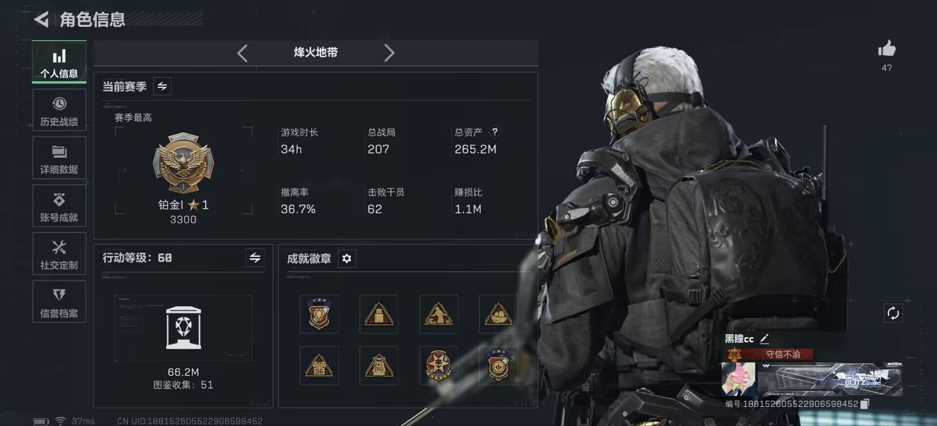 [14009372]可二次【店主推荐捡漏号!可直接换绑】3953k哈伏币-265m流动资产-60烽火等级-铂金-1战场等级-无军衔